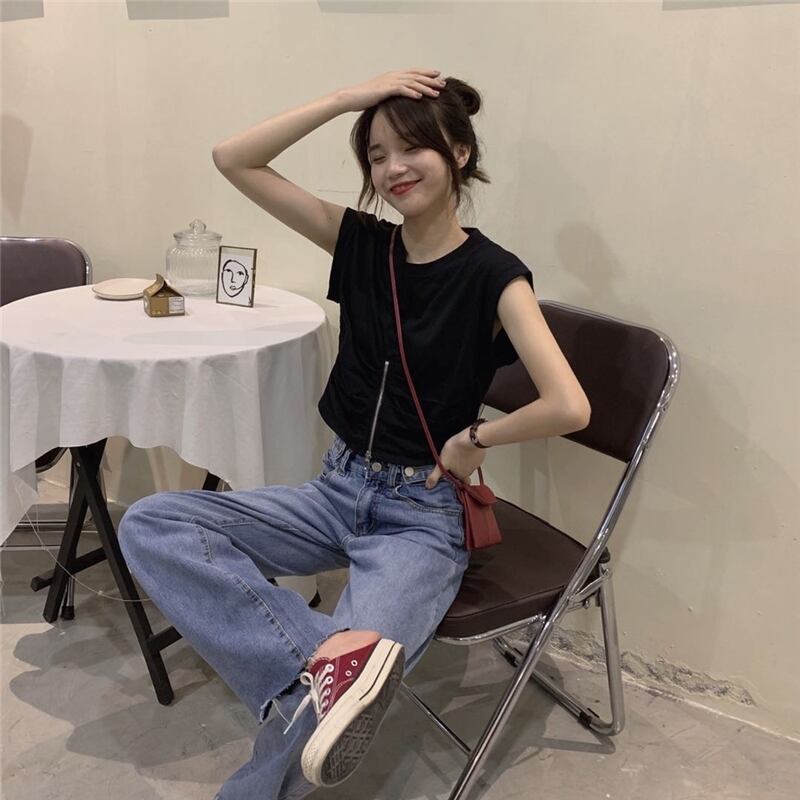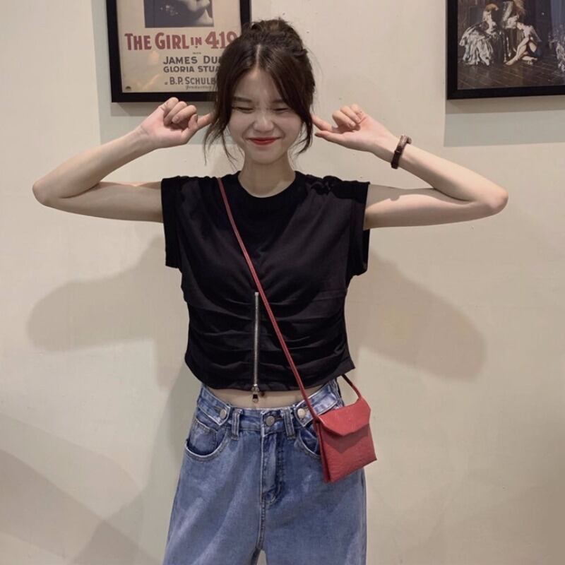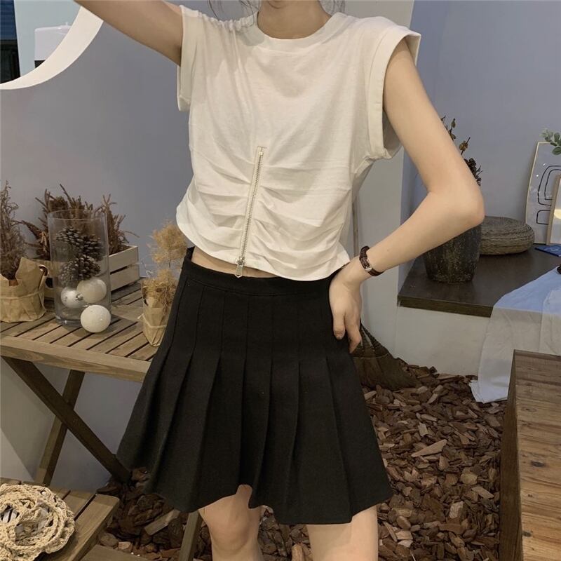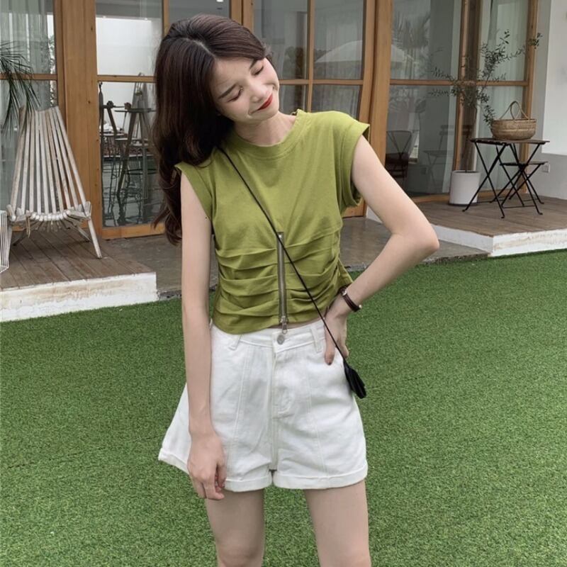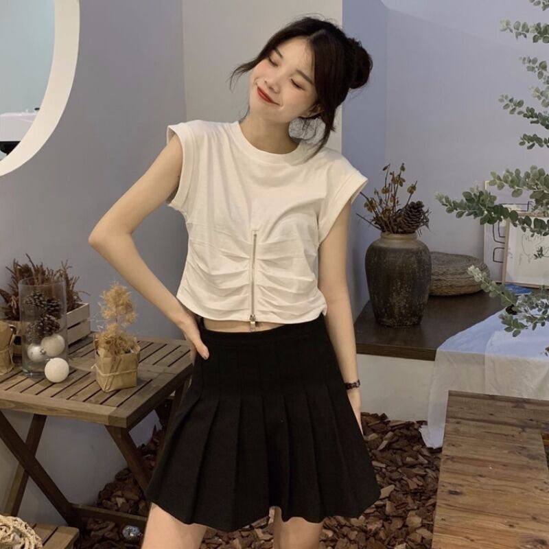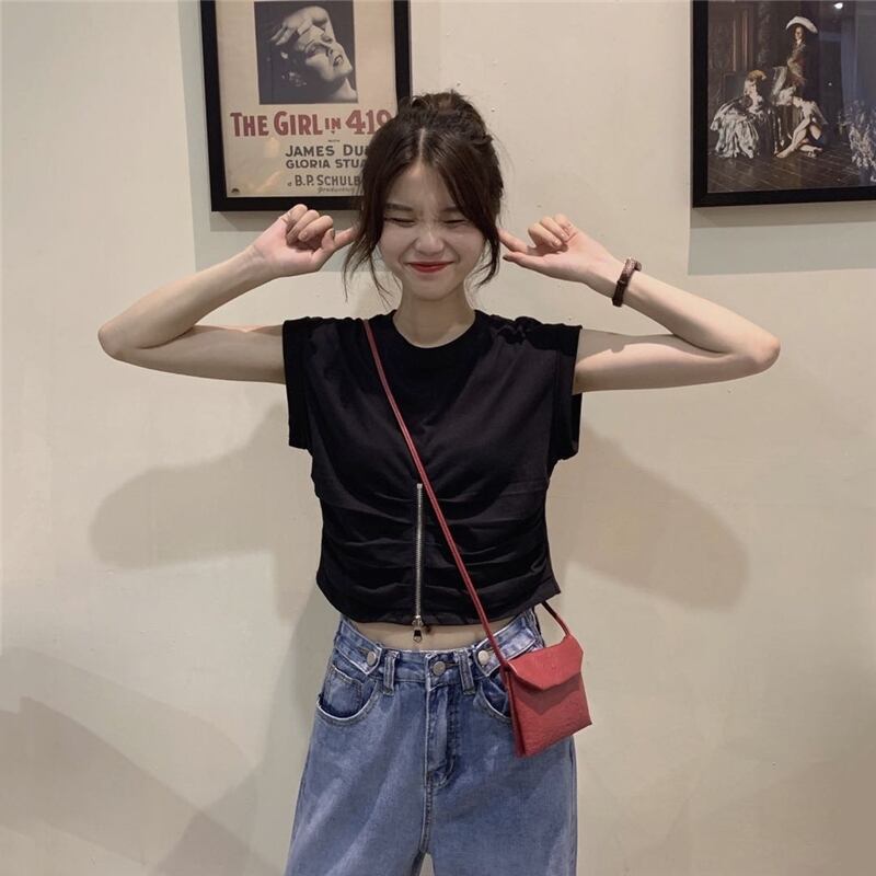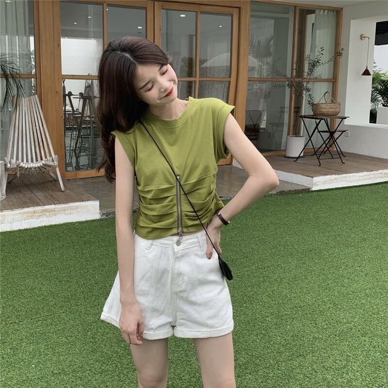 シックなトップスの女性の夏のラウンドネック半袖イントレンディなデザインセンスニッチジッパーノースリーブプリーツへそショートTシャツ ハーフスリーブ サマー 夏物 Oネック 7460028742351223 | framboise21