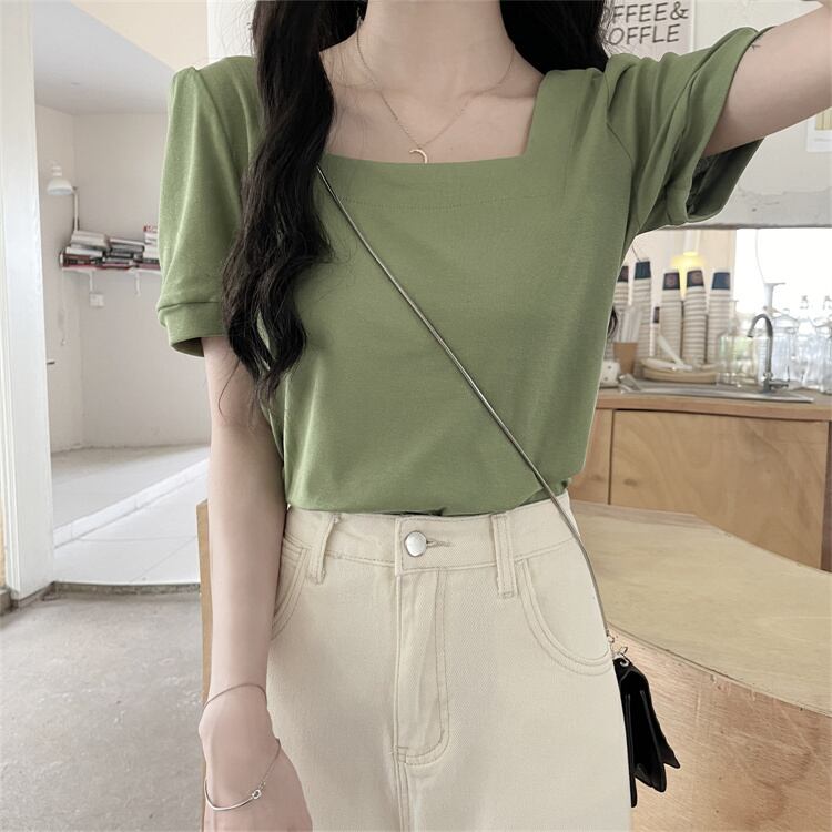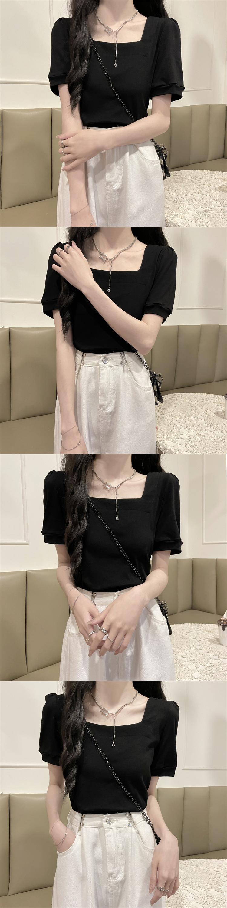 ホワイトのスクエアネック半袖Tシャツレディースサマースリムフィット、スリムでシック、そしてユニークなニッチなショートフロントショルダートップ 夏物 スクウェア 7460088455521185 | framboise21