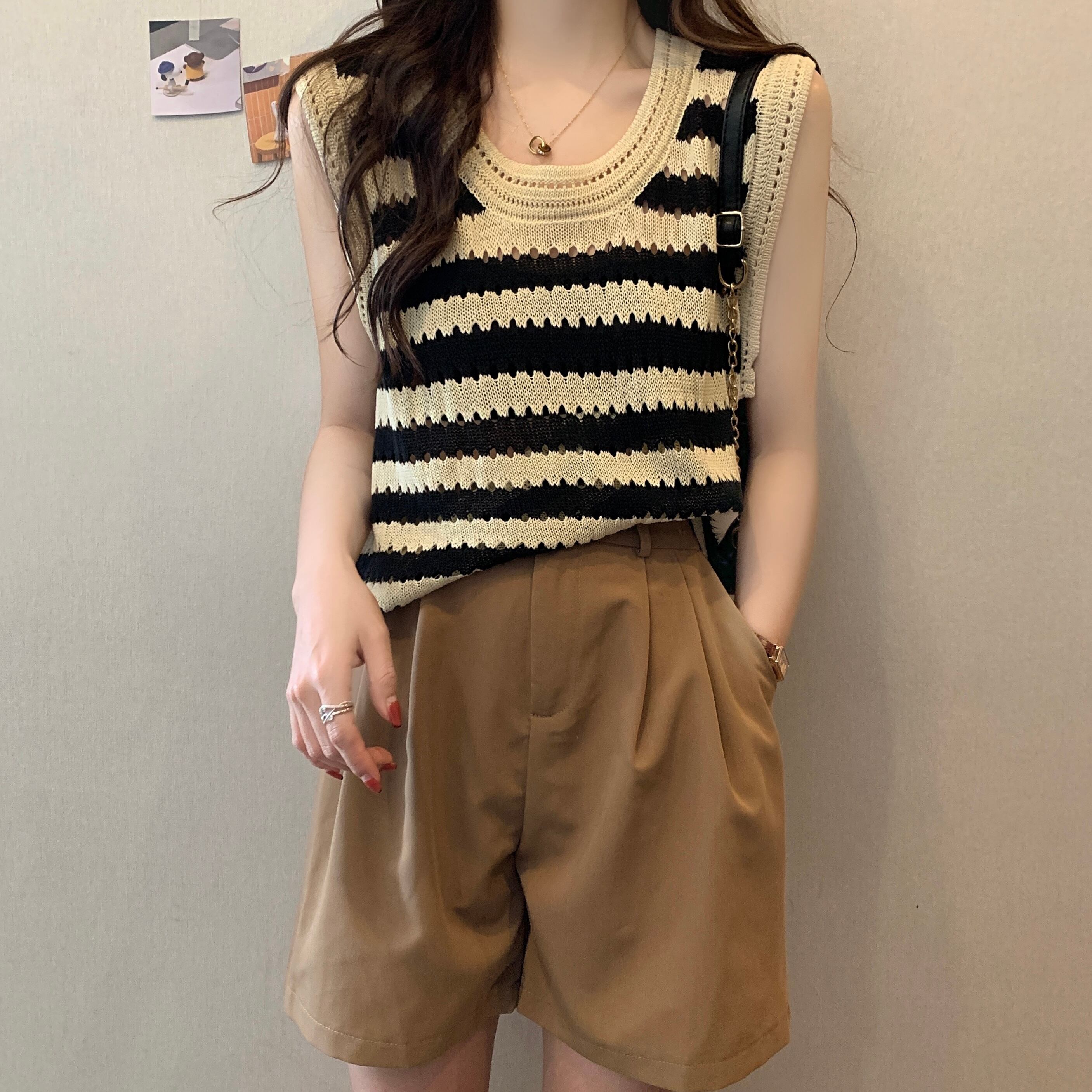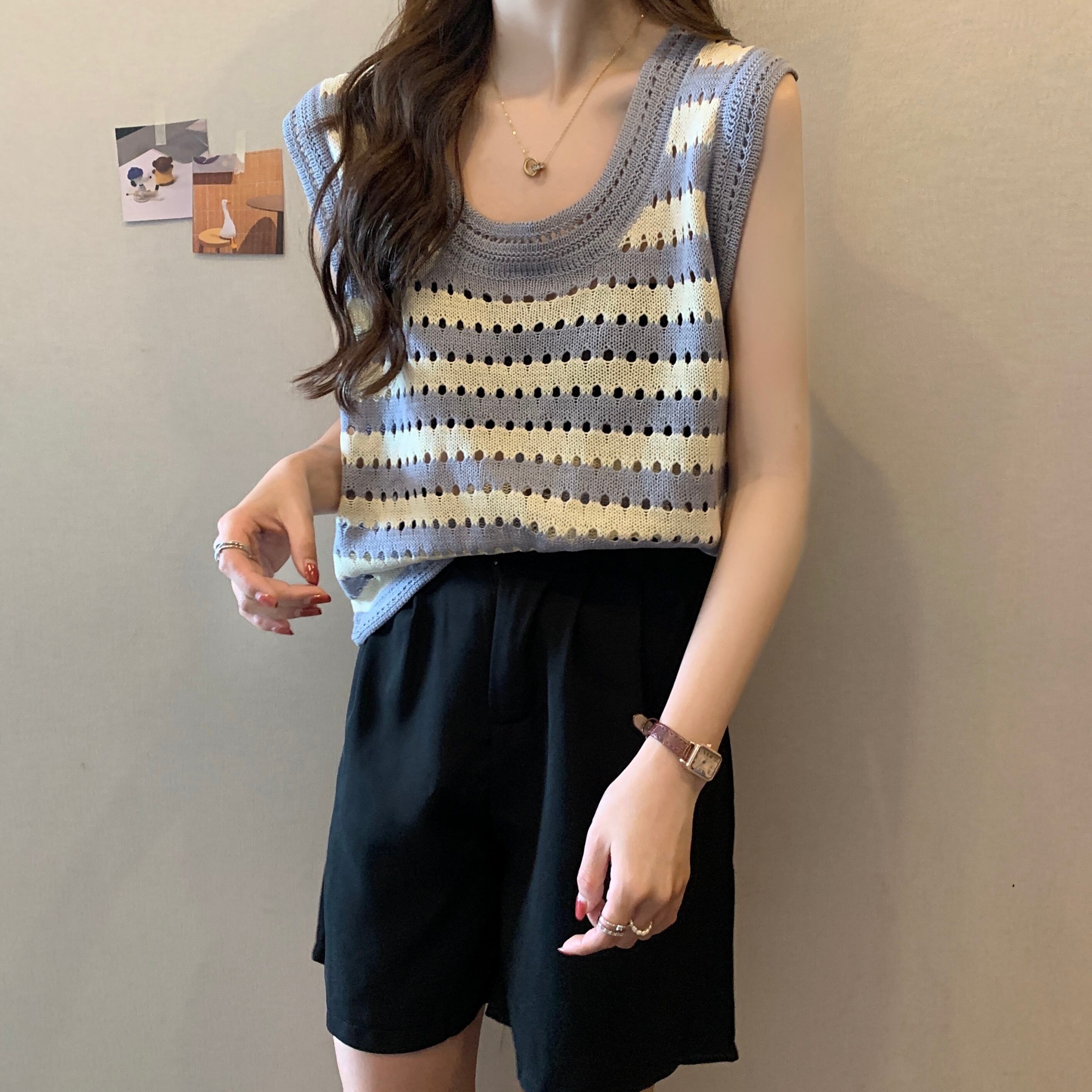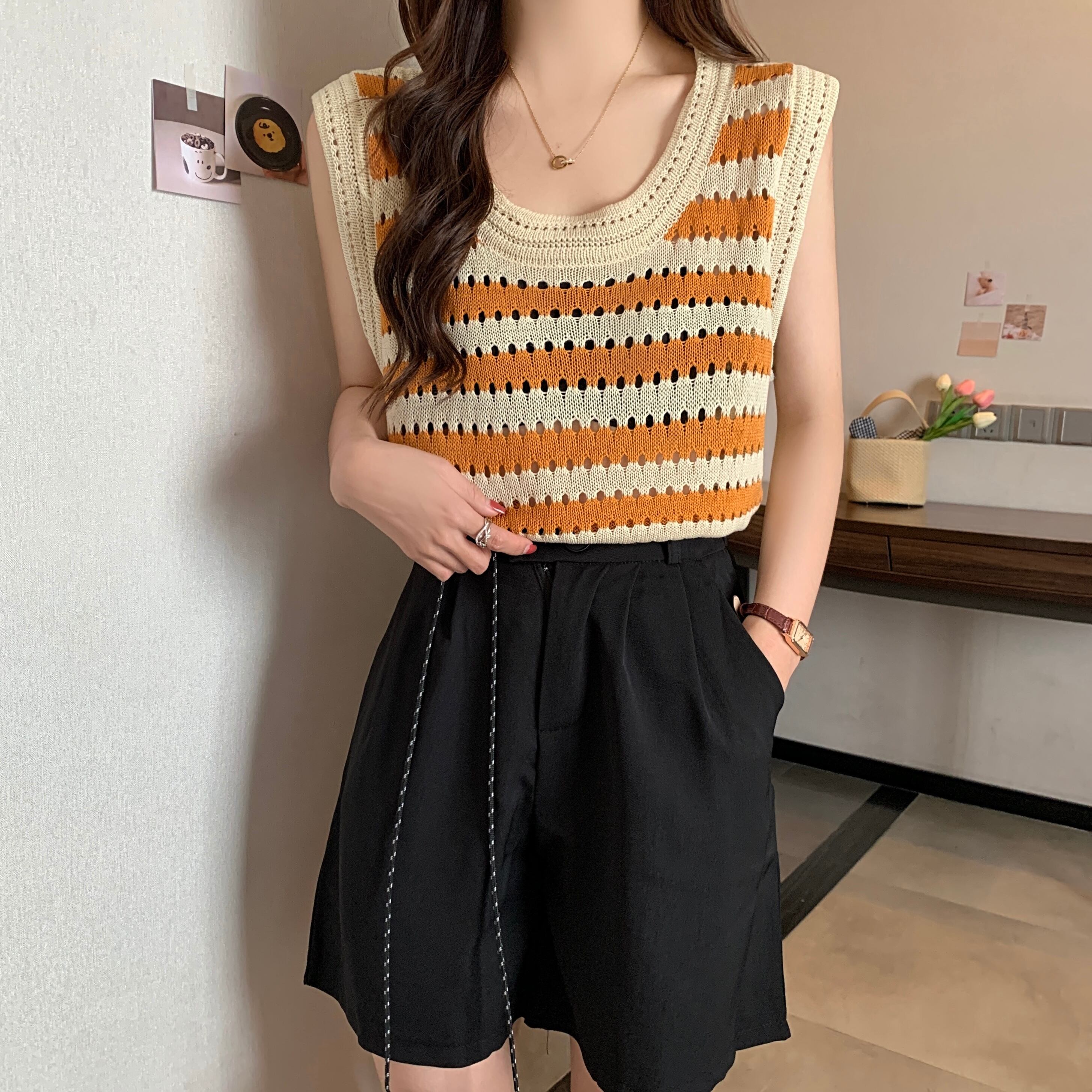 ストライプワイドショルダーストラップニットUネックキャミソールレディースサマーデザインセンスニッチくり抜いたアイスシルクノースリーブトップサマー 夏物 746007350106926 | framboise21