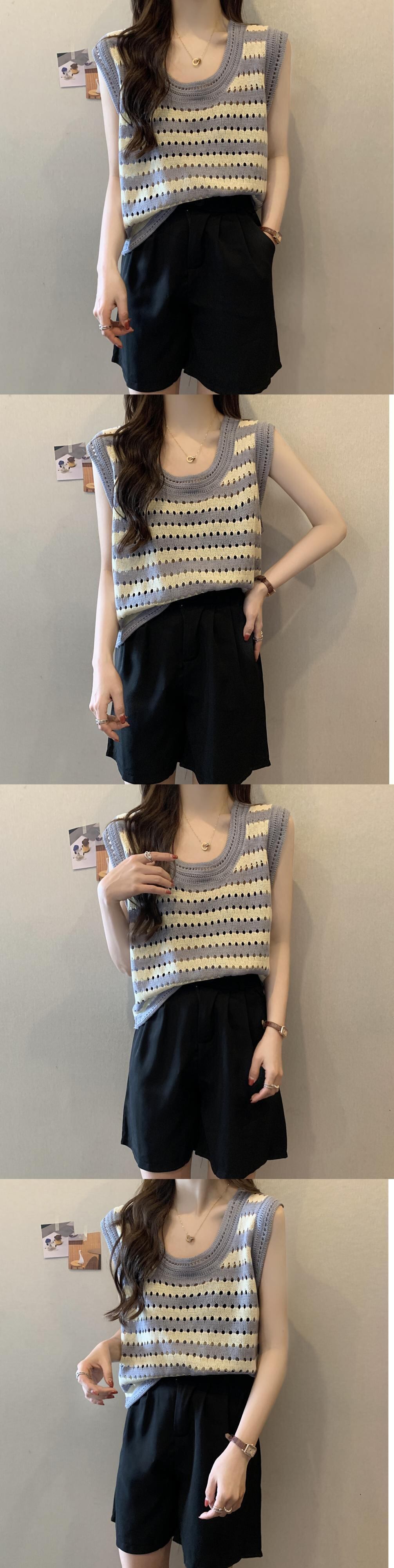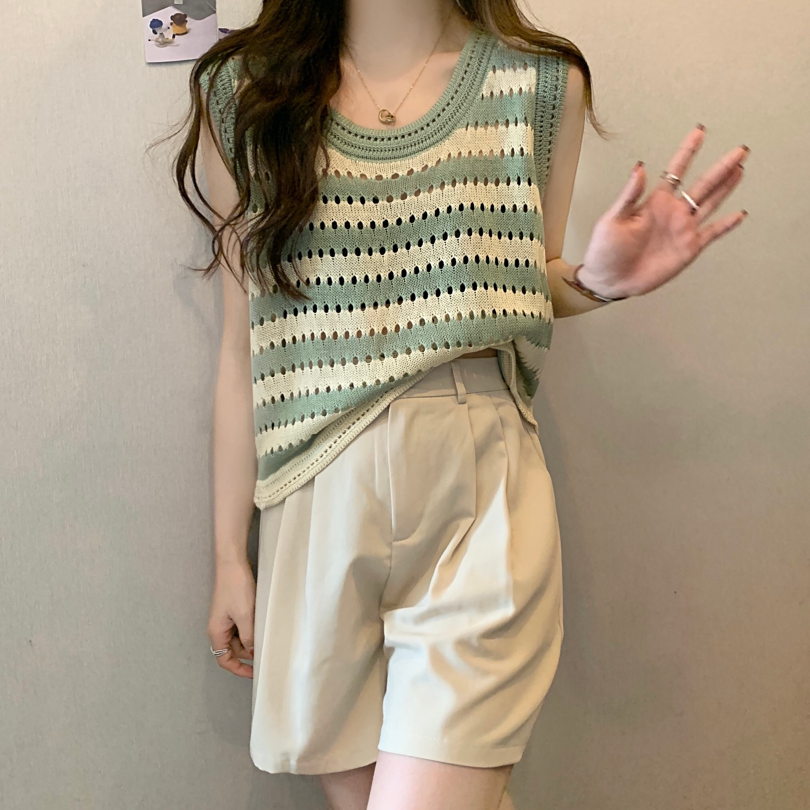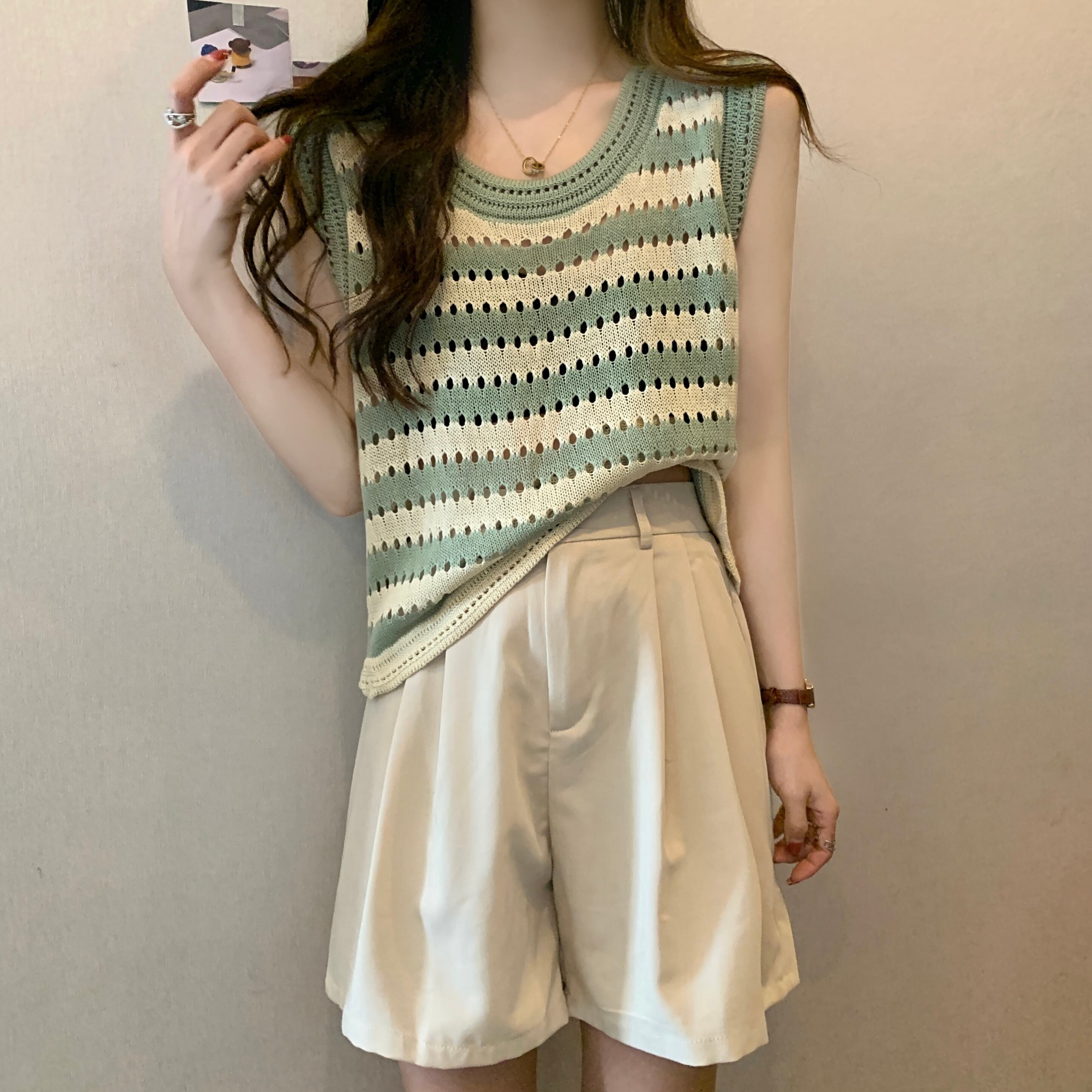 ストライプワイドショルダーストラップニットUネックキャミソールレディースサマーデザインセンスニッチくり抜いたアイスシルクノースリーブトップサマー 夏物 746007350106926 | framboise21