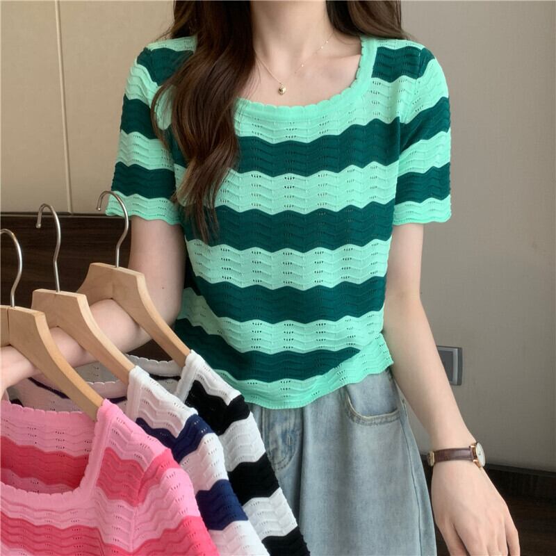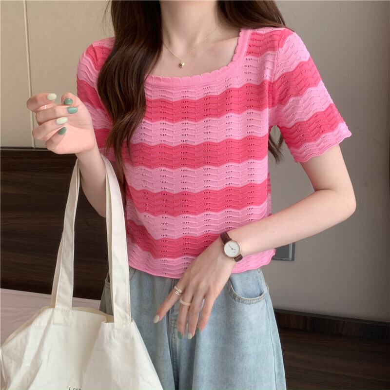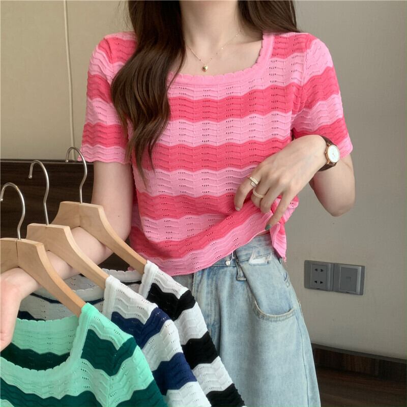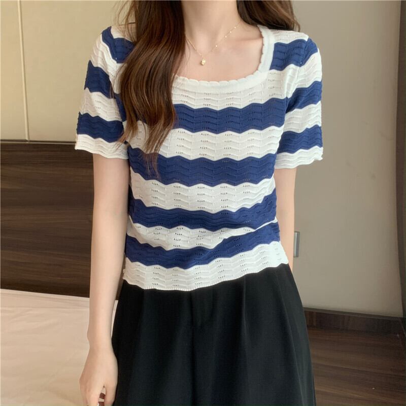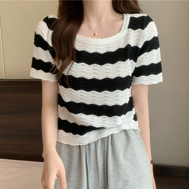 黒と白のストライプの半袖Tシャツ女性の夏のデザインニッチフロントショルダースクエアカラーフレンチ鎖骨中空ショートトップ ホワイト ブラック サマー 夏物 スクウェア 7460069981174840 | framboise21