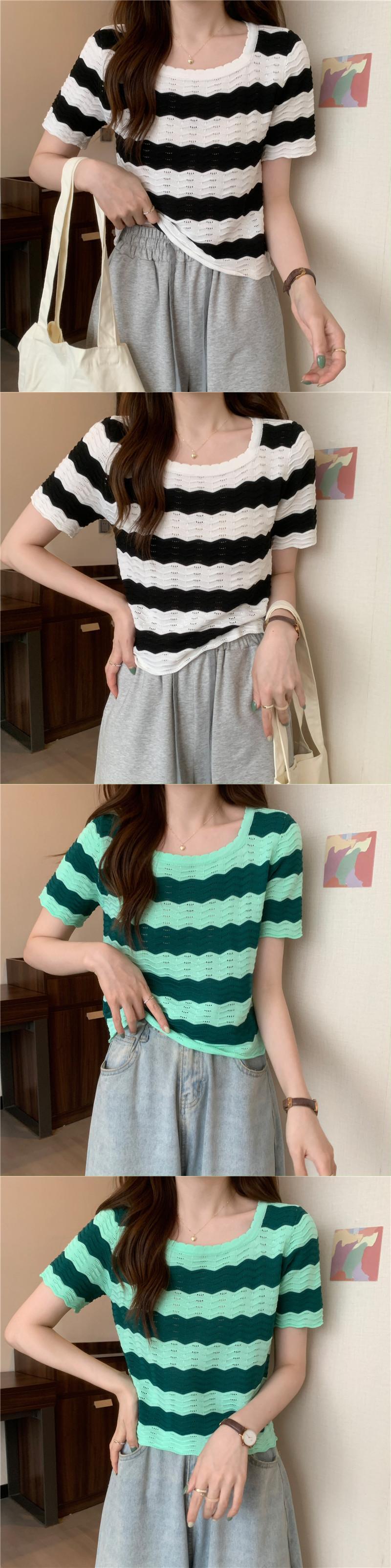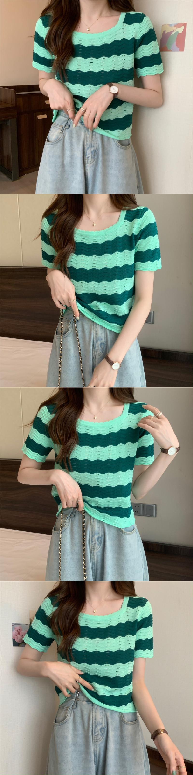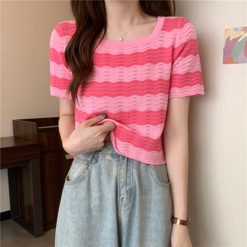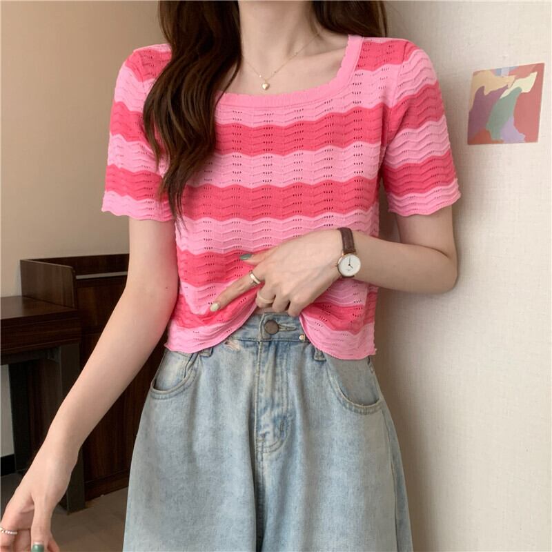 黒と白のストライプの半袖Tシャツ女性の夏のデザインニッチフロントショルダースクエアカラーフレンチ鎖骨中空ショートトップ ホワイト ブラック サマー 夏物 スクウェア 7460069981174840 | framboise21