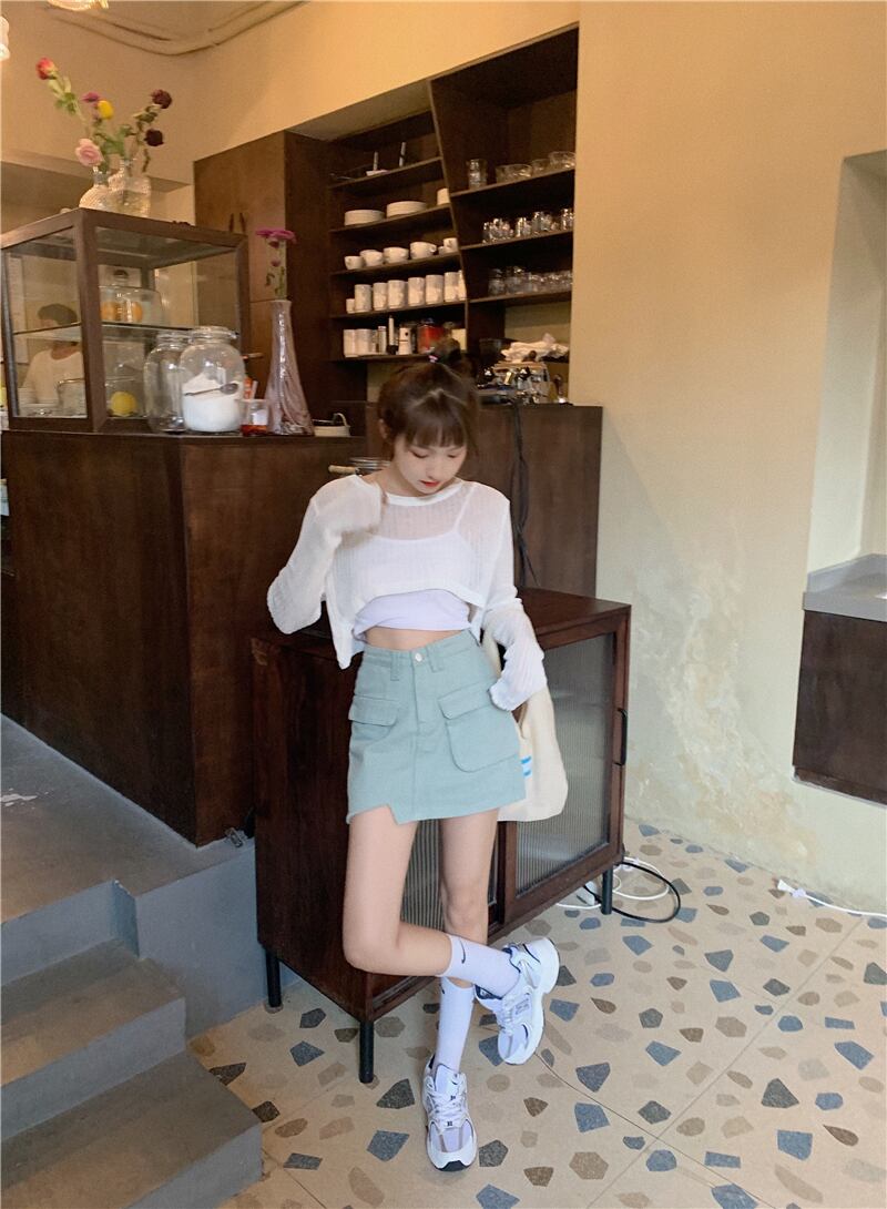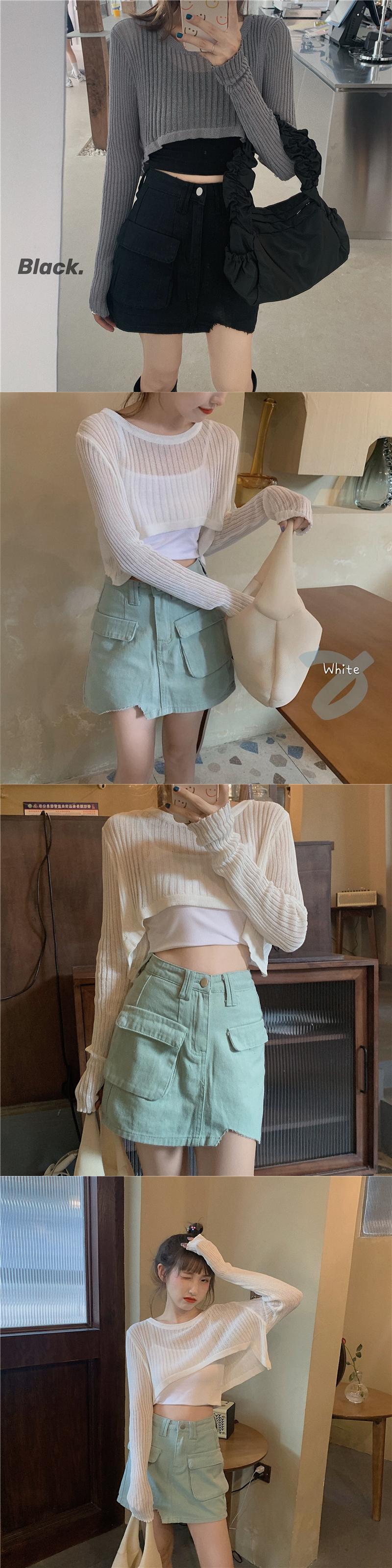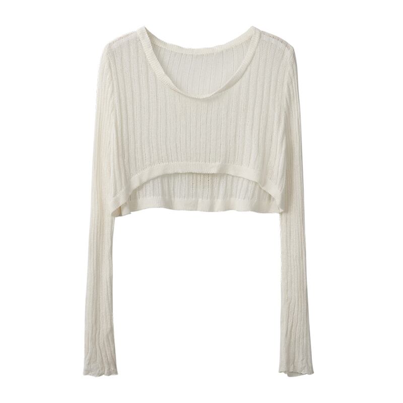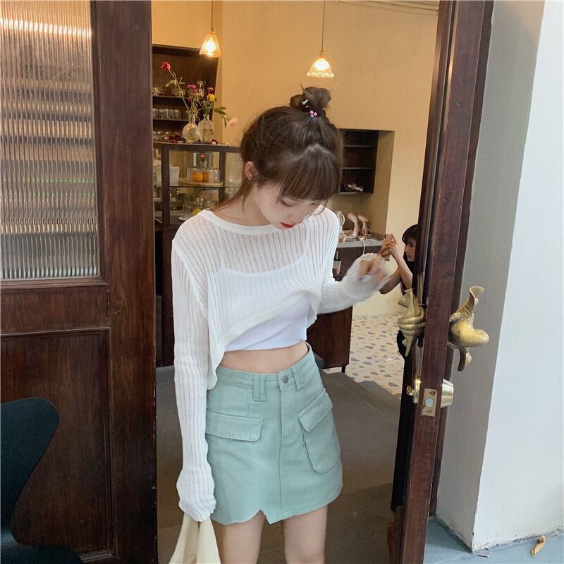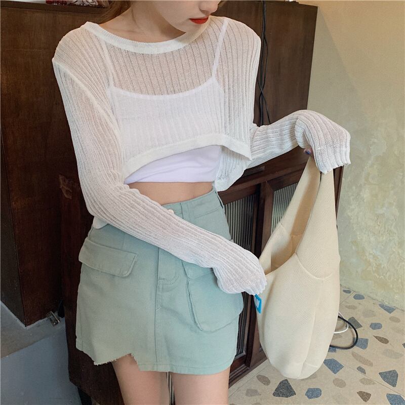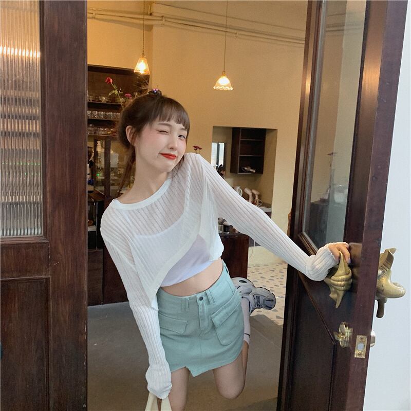 サスペンダー付きの日焼け防止ハーフカットブラウス、女性の春と夏の薄いアイスシルクエアコンシャツ、短い中空ニットトップを重ねた ショート レッド スプリング 春物 サマー 夏物 7460070741528166 | framboise21