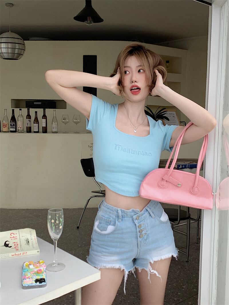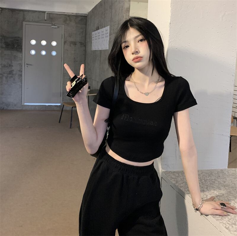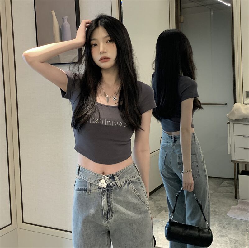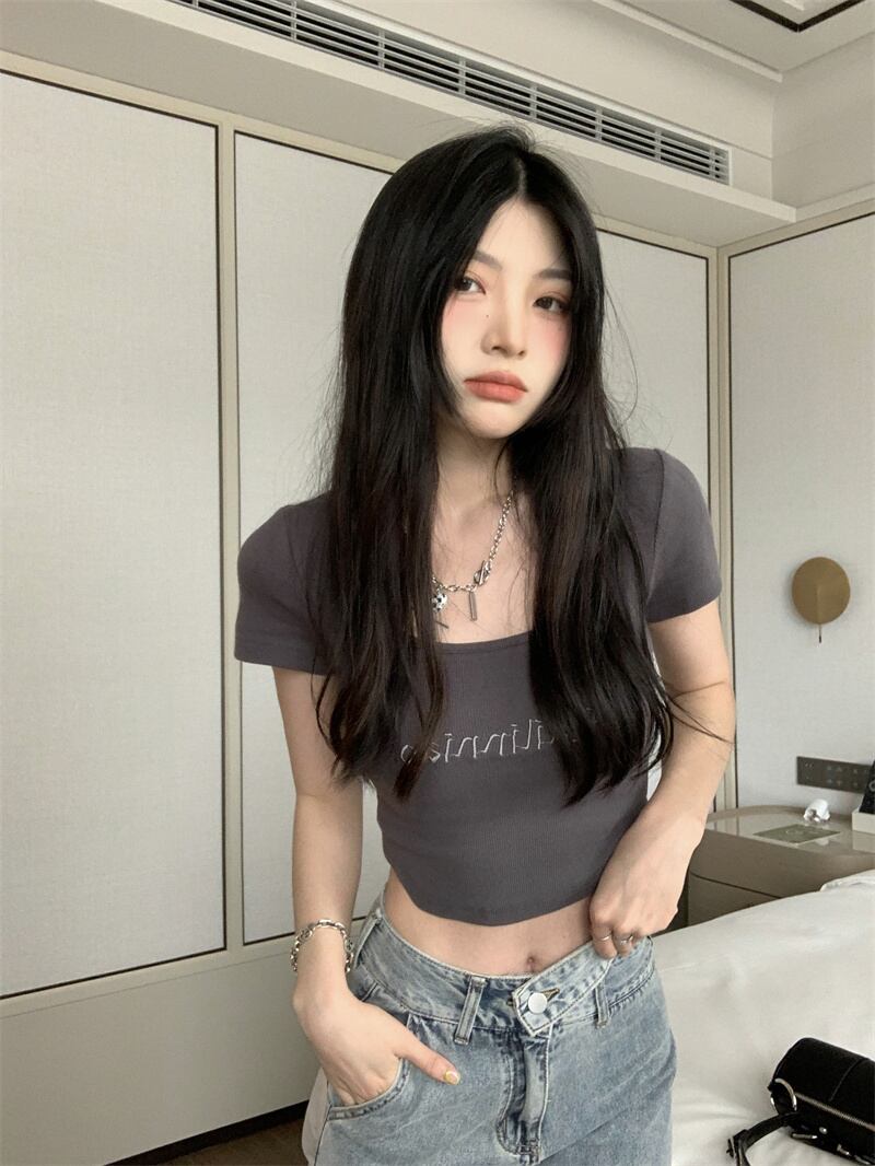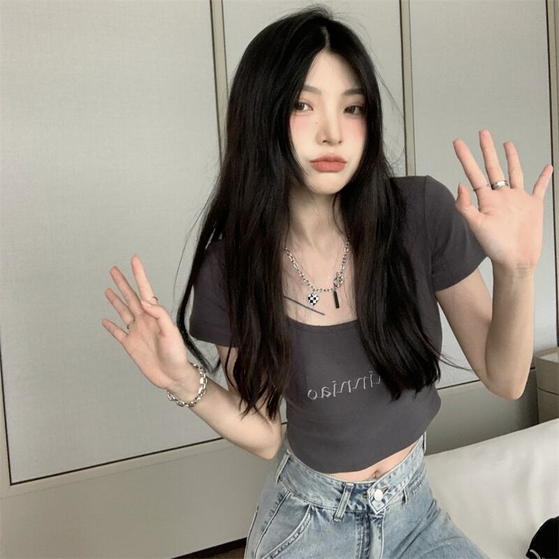 グレーレタースクエアカラー半袖フロントショルダーTシャツレディースサマーデザインスモールアメリカンレトロスリムショートトップ 夏物 スクウェア 746001216459138 | framboise21