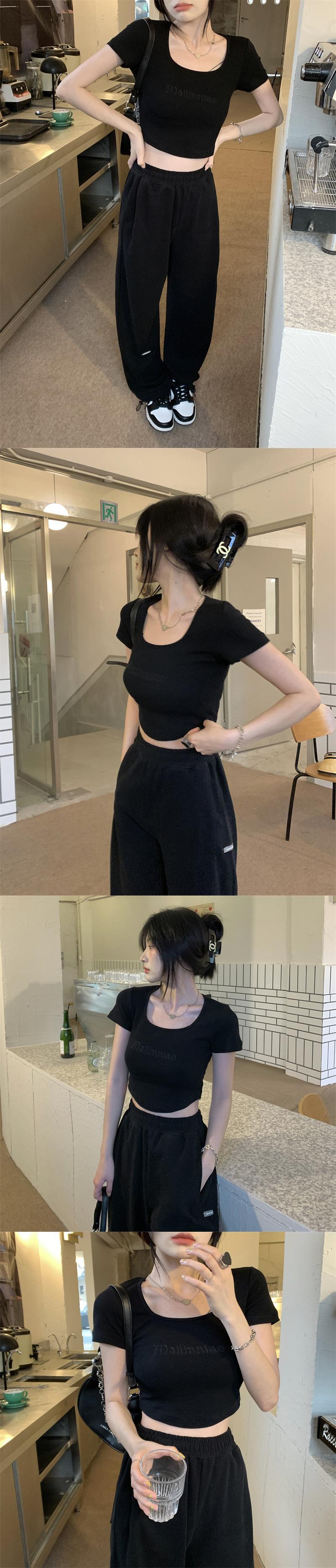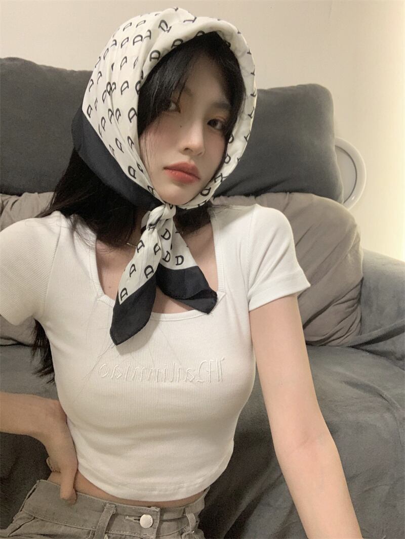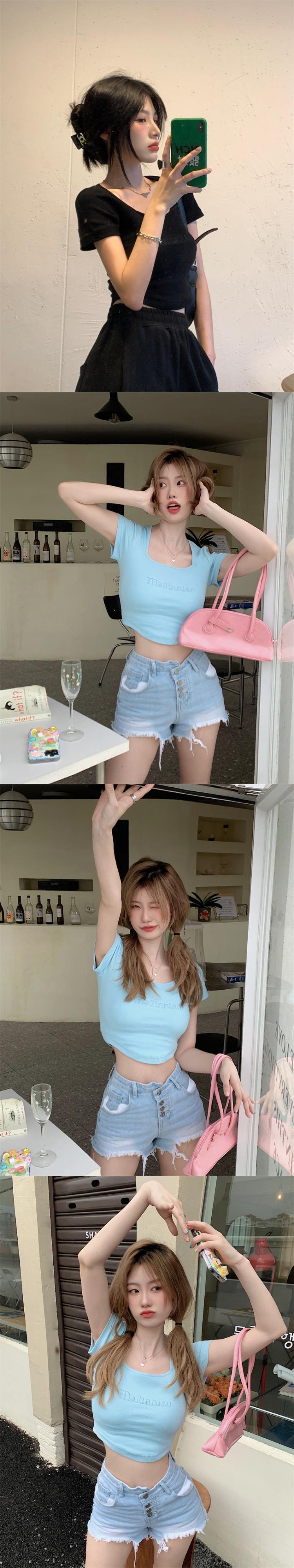 グレーレタースクエアカラー半袖フロントショルダーTシャツレディースサマーデザインスモールアメリカンレトロスリムショートトップ 夏物 スクウェア 746001216459138 | framboise21