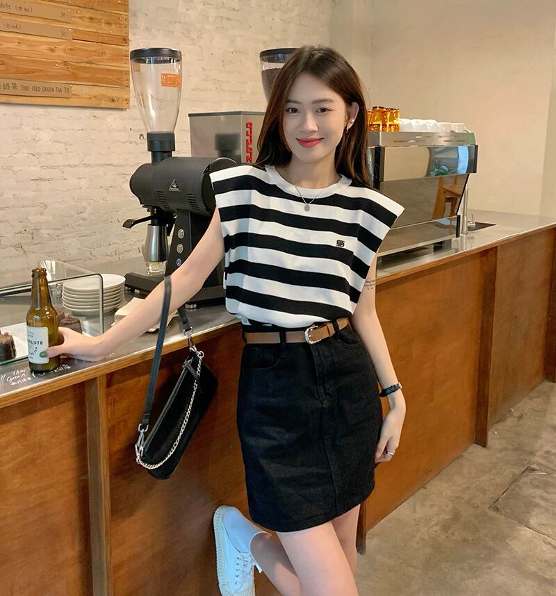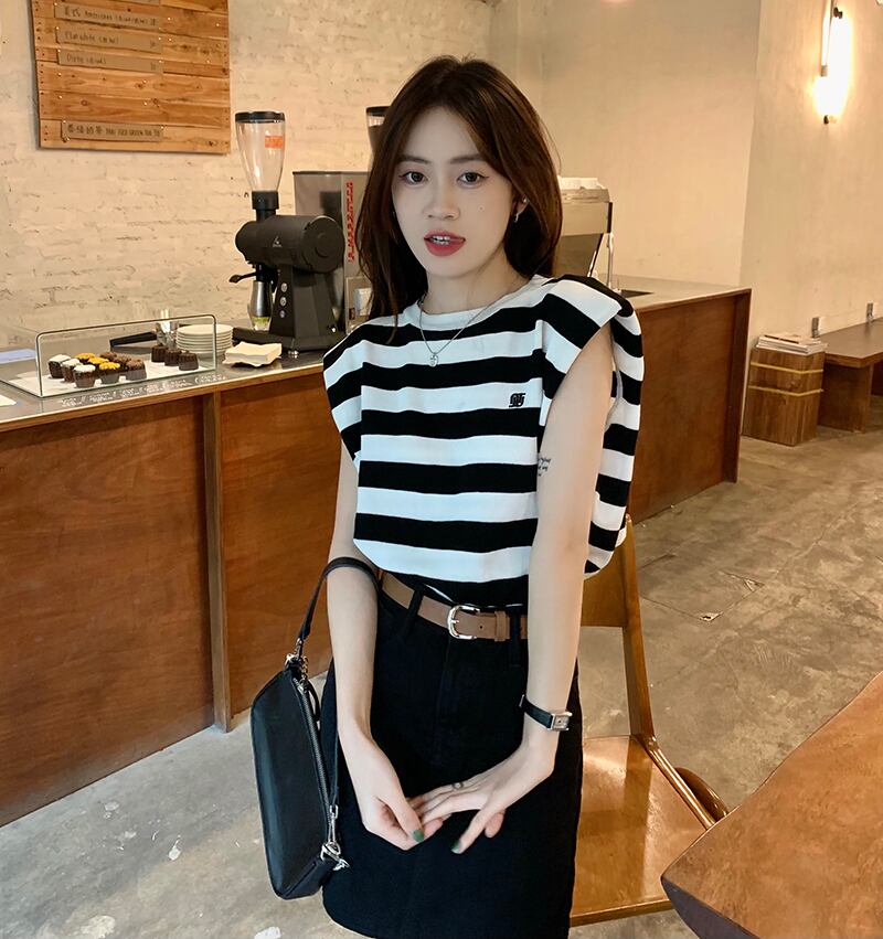 ストライプベストTシャツレディースアウター2022夏新作デザインニッチルーズで薄いラウンドネックノースリーブトップ サマー 夏物 Oネック 7460097436462330 | framboise21