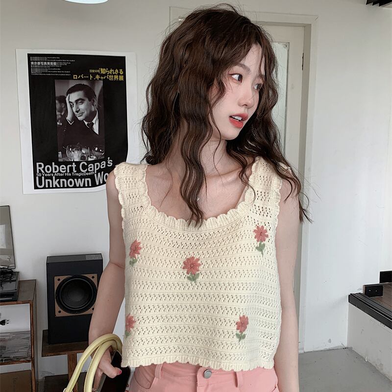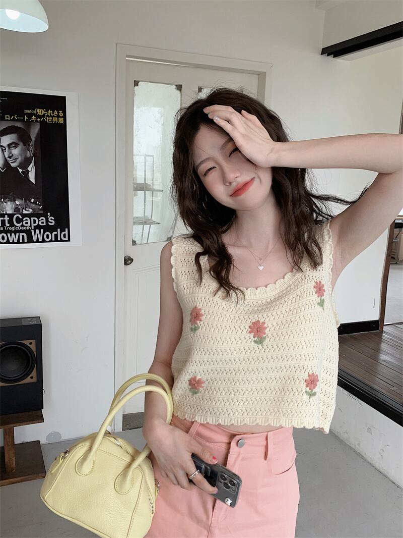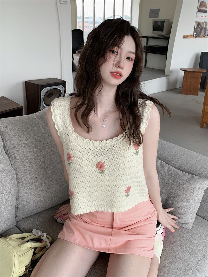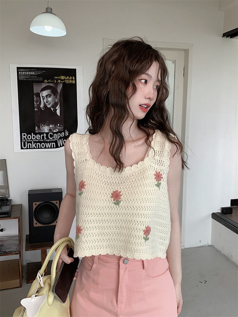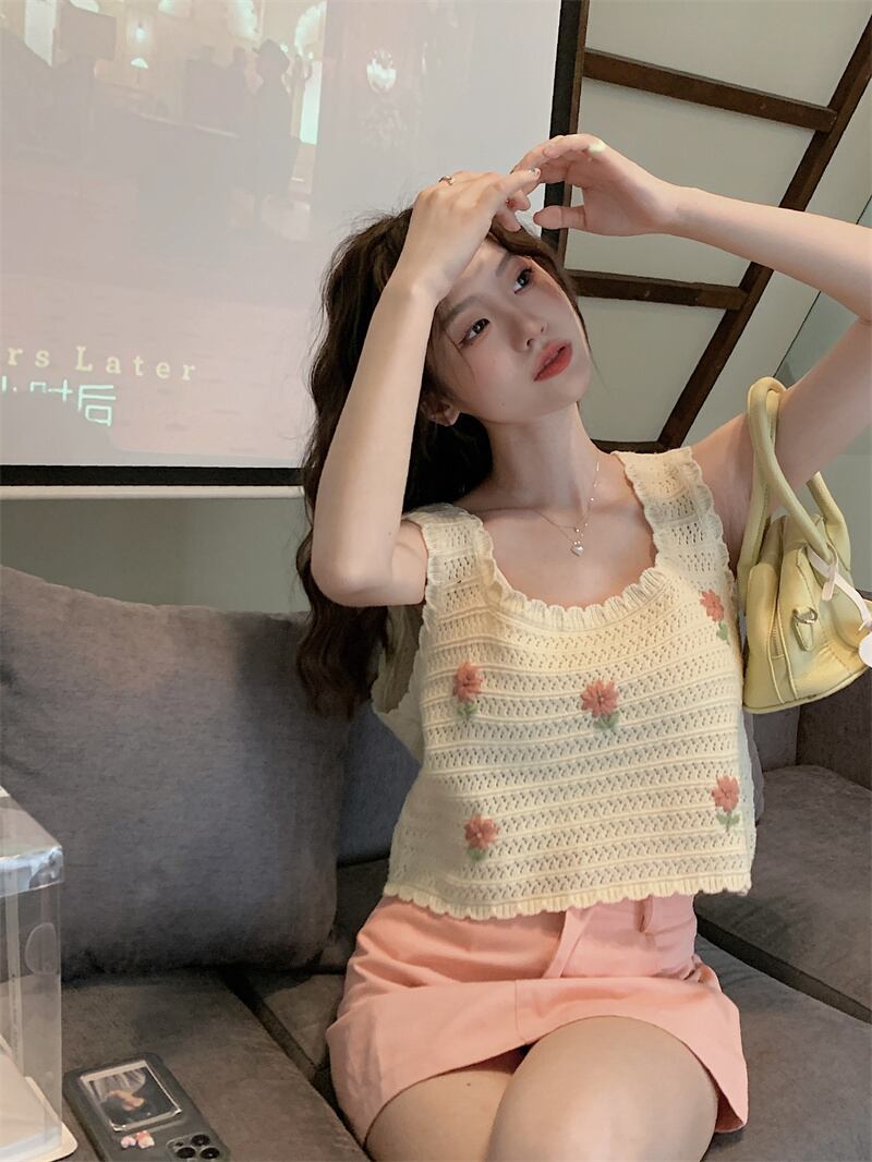 美しいフラワーニットキャミソールレディースインナーとアウターウェアデザインニッチノースリーブ甘くてスパイシーなフランスの純粋な欲望トップ 大人ガーリー スウィート キュート カジュアル ピュア フラワーデザイン 7460018851399867 | framboise21