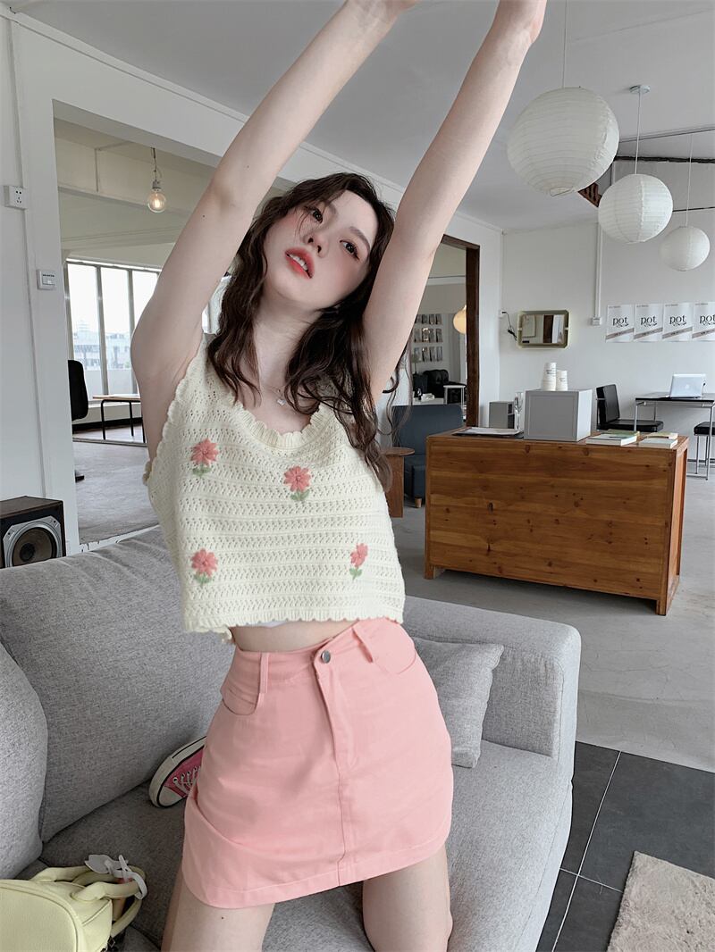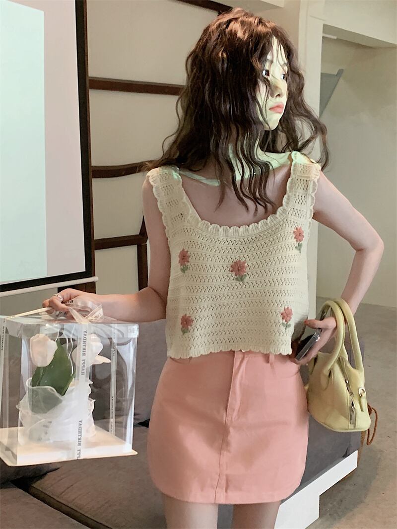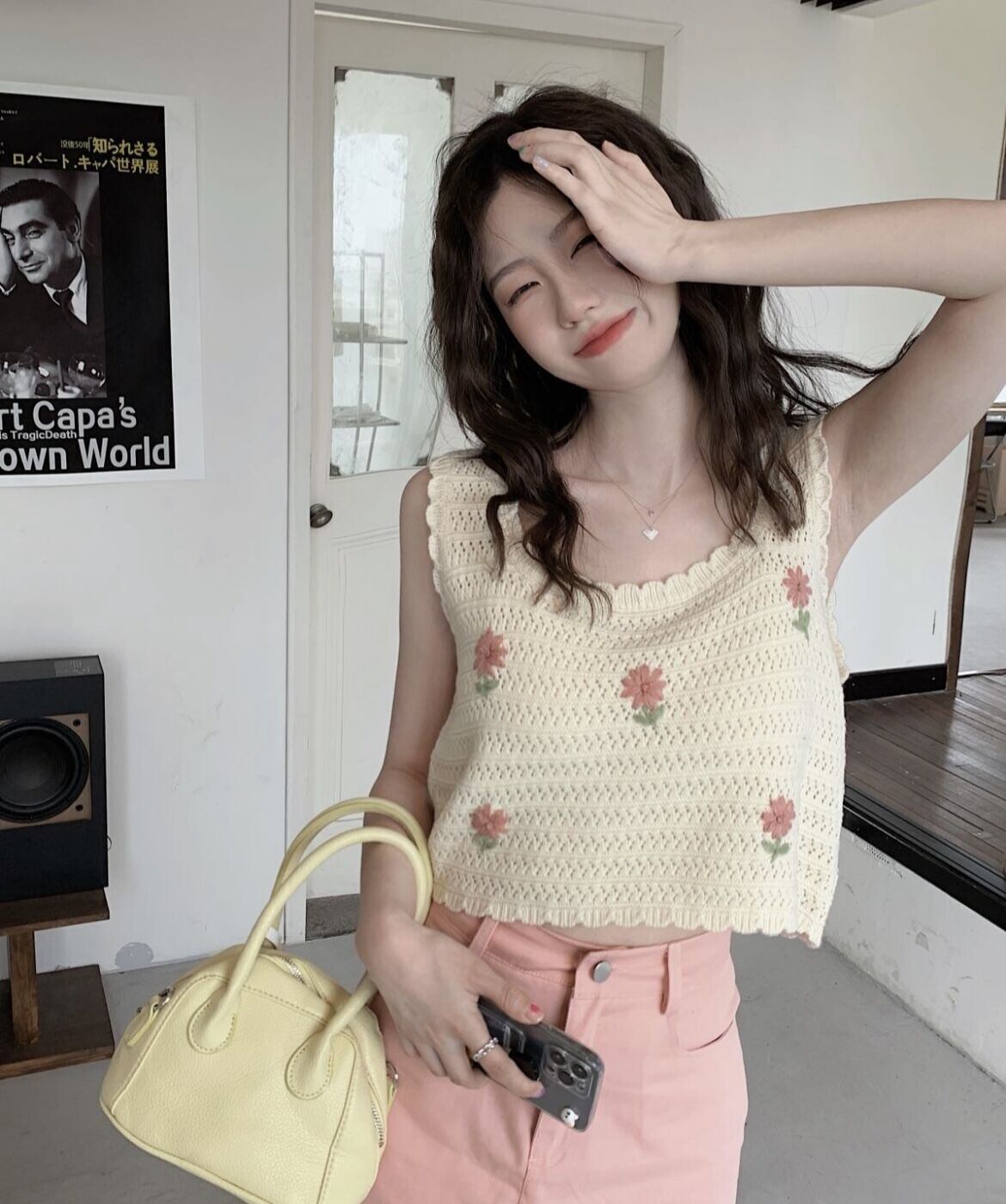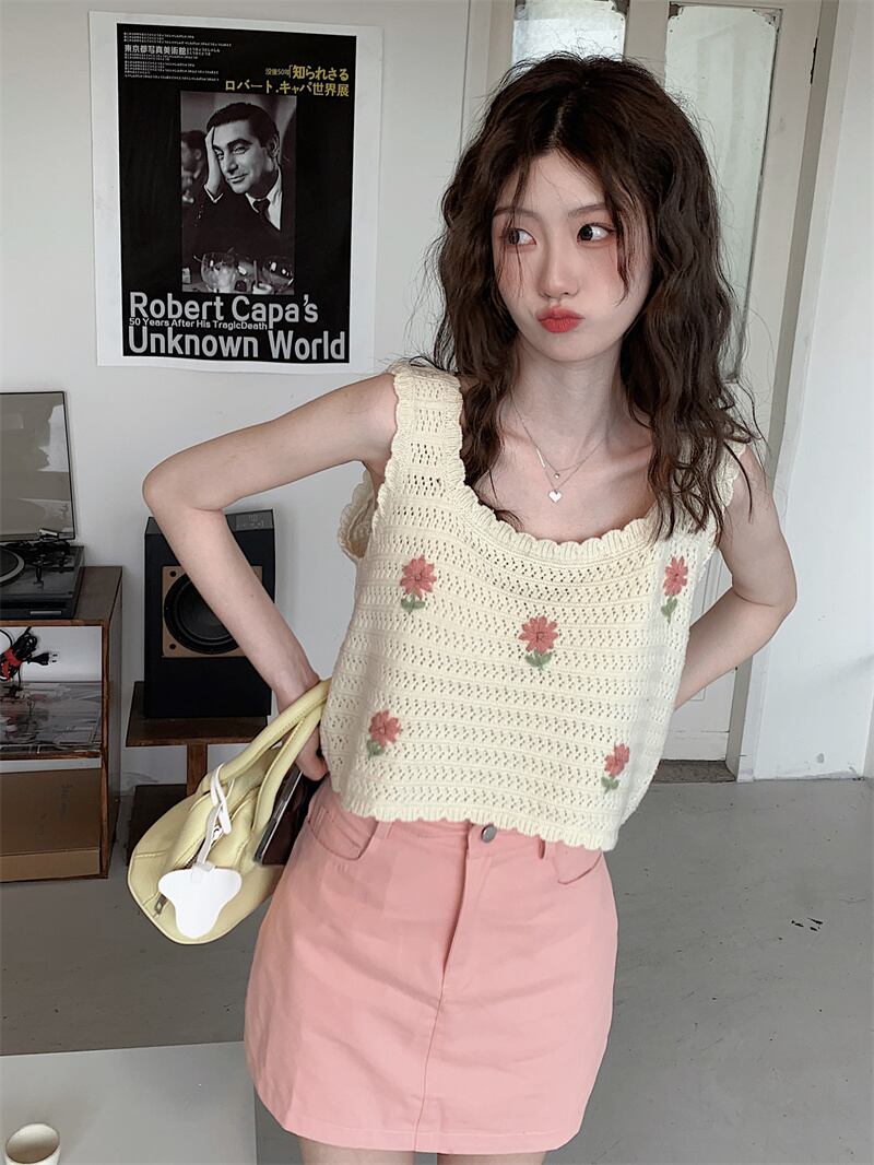 美しいフラワーニットキャミソールレディースインナーとアウターウェアデザインニッチノースリーブ甘くてスパイシーなフランスの純粋な欲望トップ 大人ガーリー スウィート キュート カジュアル ピュア フラワーデザイン 7460018851399867 | framboise21