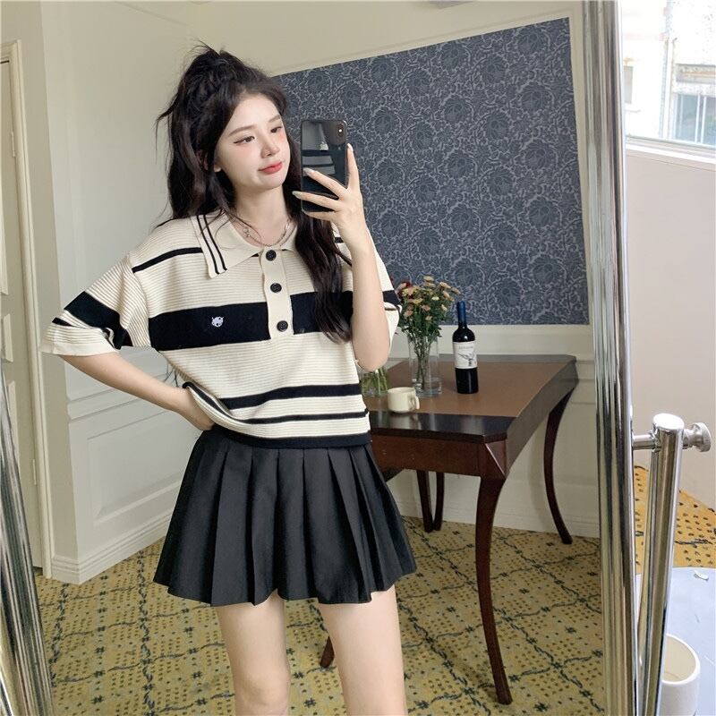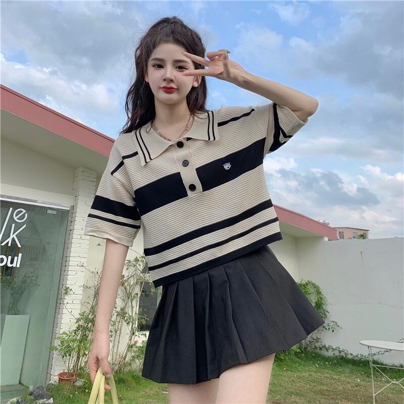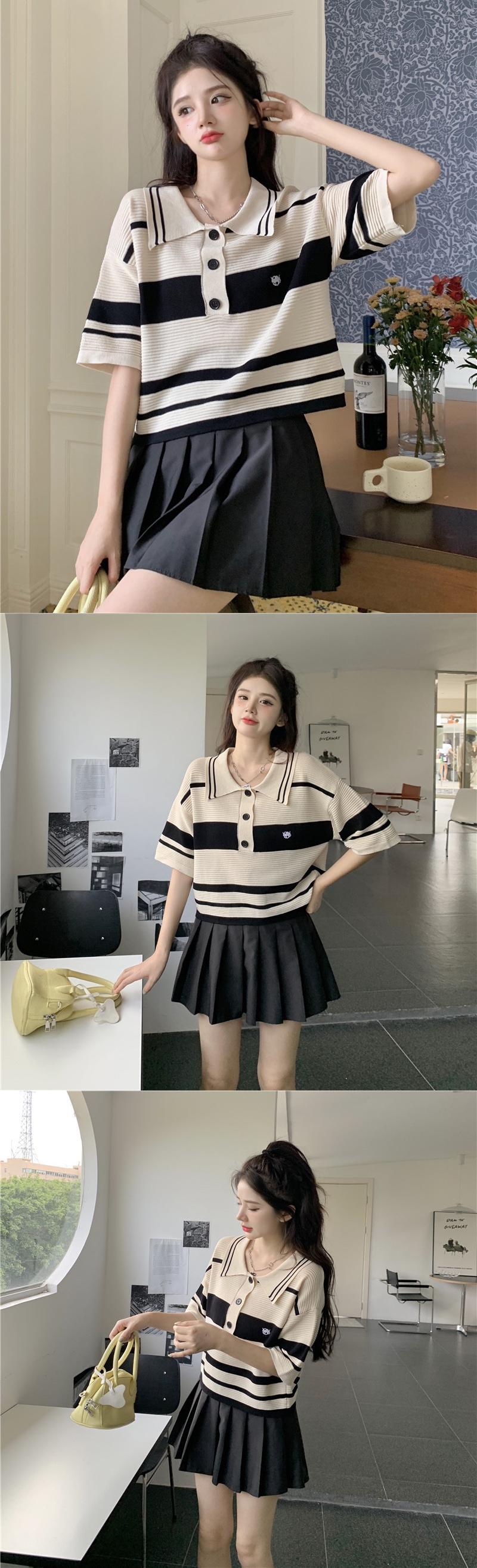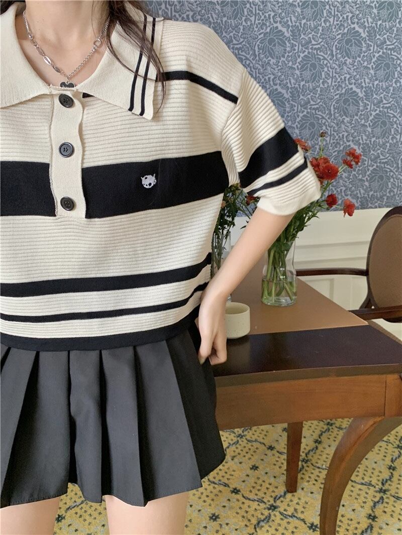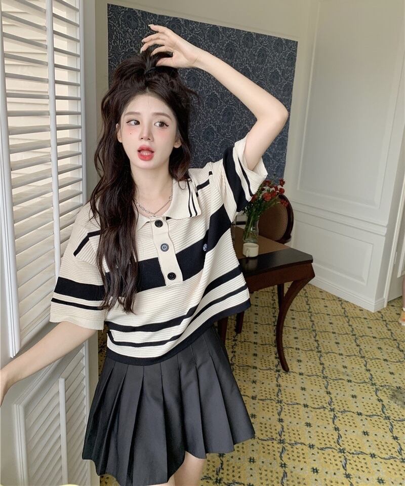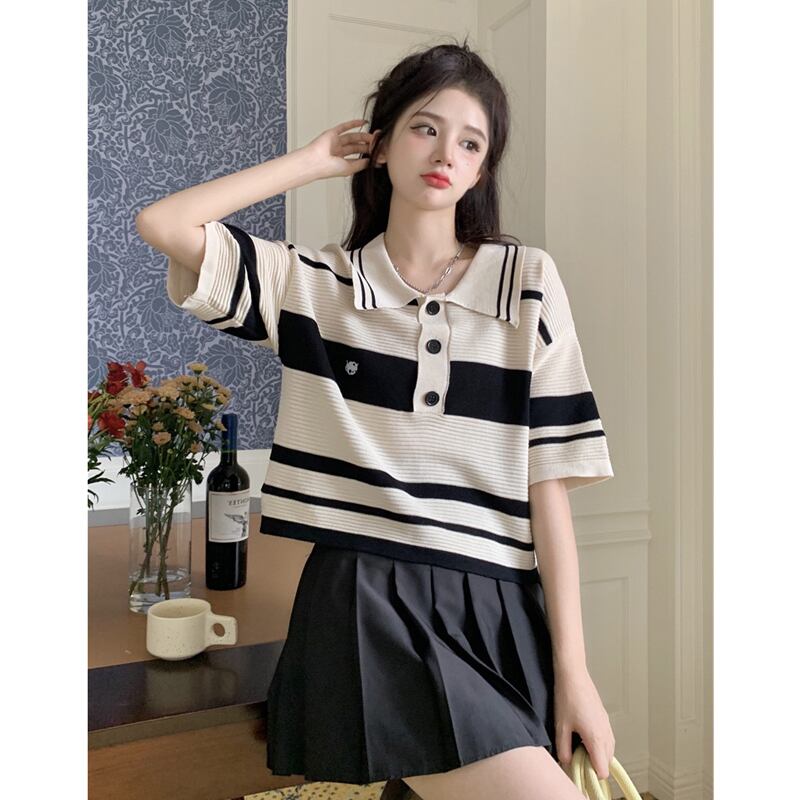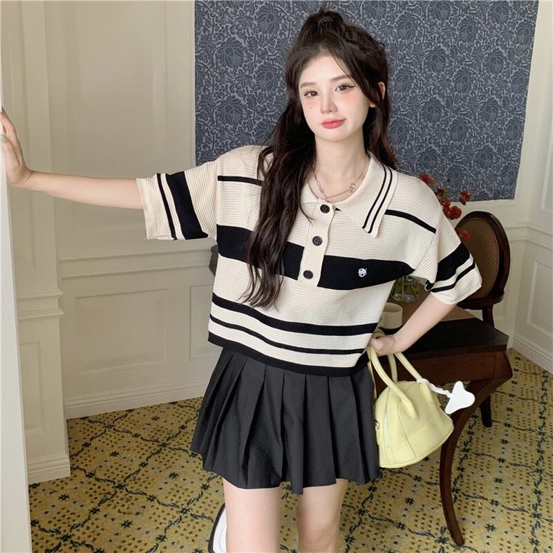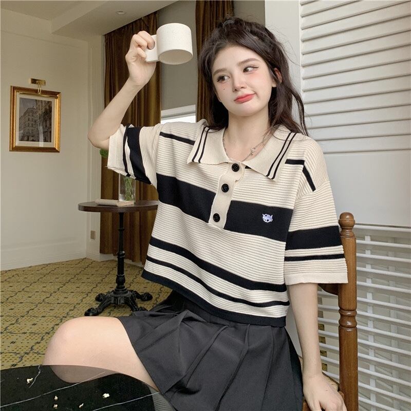アイスシルクニットポロシャツラペルストライプ半袖Tシャツレディースサマープラスサイズシックで薄くて肉を覆うルーズトップ 大きめサイズ 夏物 7460034363169938 | framboise21