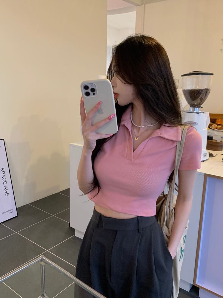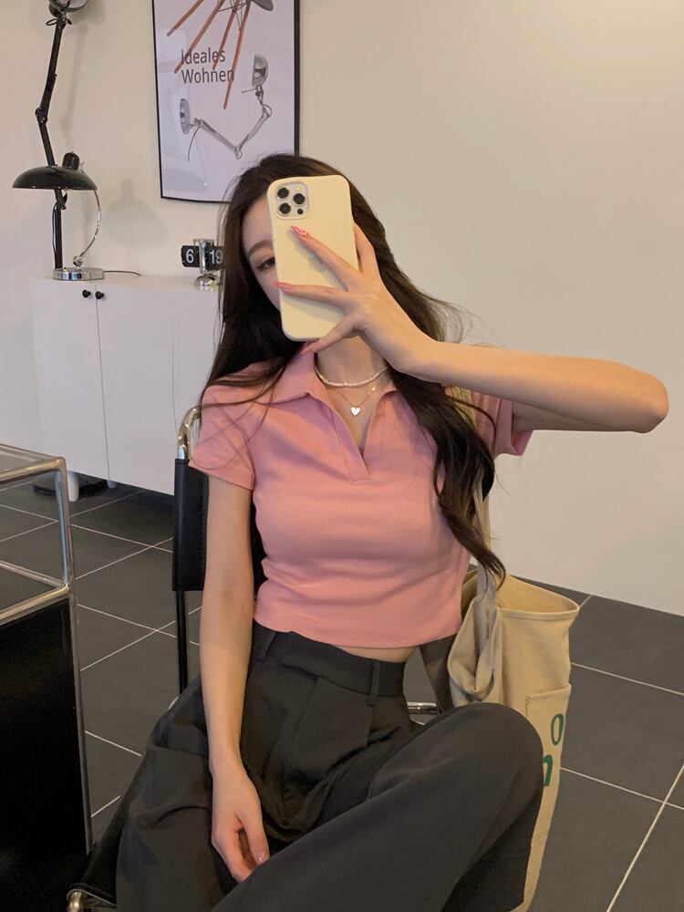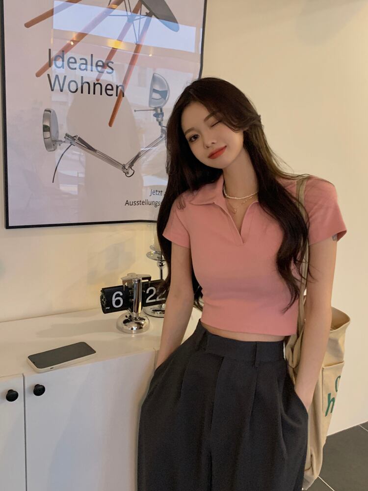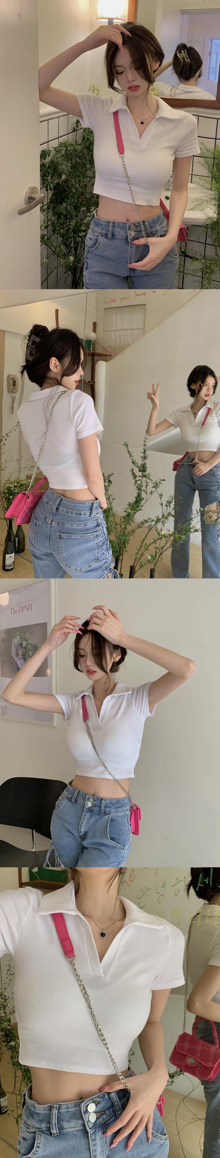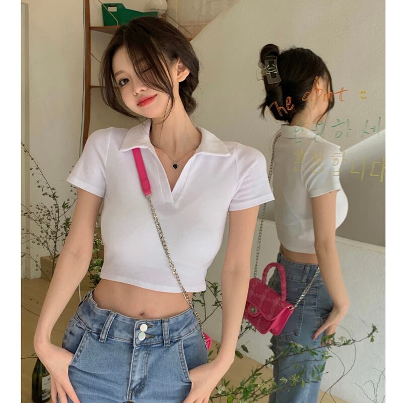 ホットホワイトウエストとおへそポロカラーTシャツレディースデザインセンスフロントショルダー半袖ハイウエストショートbmスタイルトップサマー ハイウェスト ハーフスリーブ 夏物 746006622127166 | framboise21
