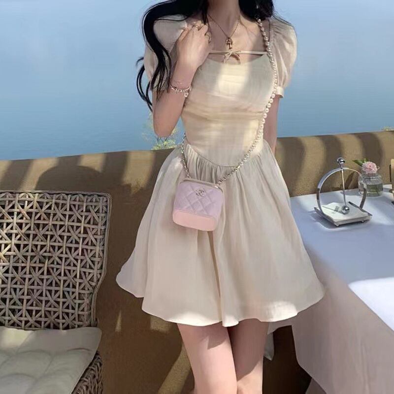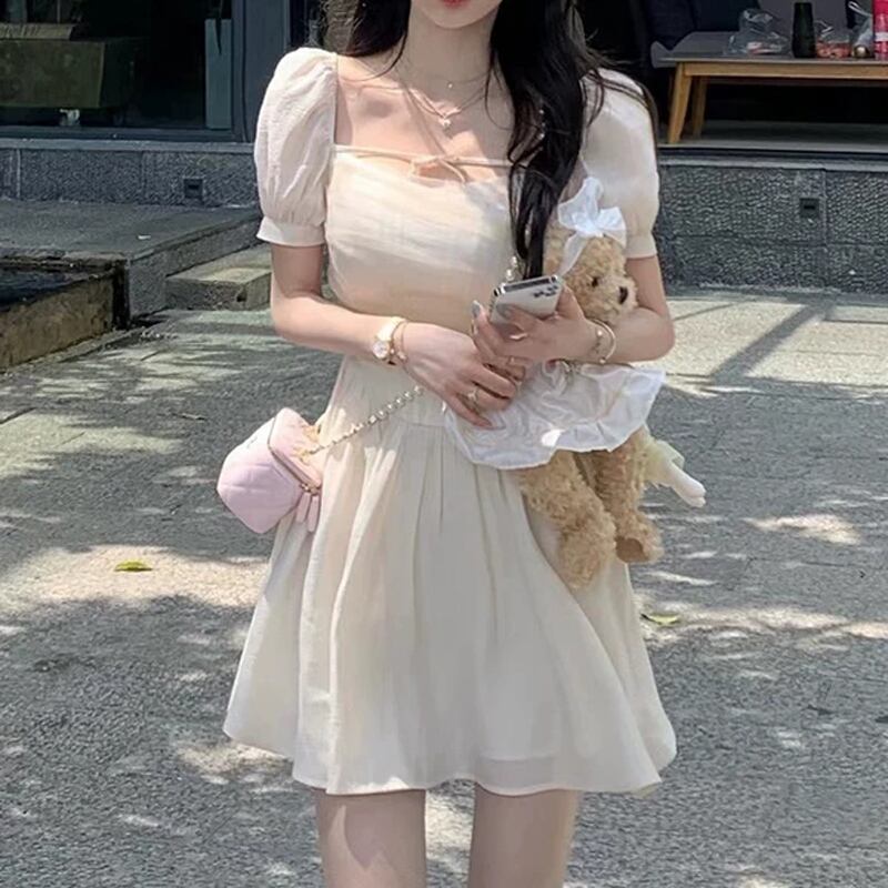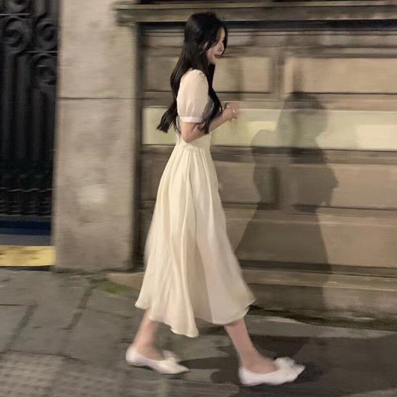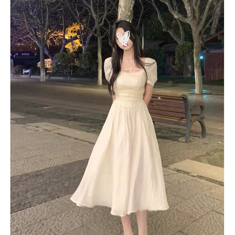 ホワイトスクエアネックメッシュフィッシュボーンドレス女性サマーガーゼスカートピュアスウィートファーストラブスカートパフスリーブショートスカート 大人ガーリー キュート カジュアル 夏物 スクウェア 7460023737076099 | framboise21