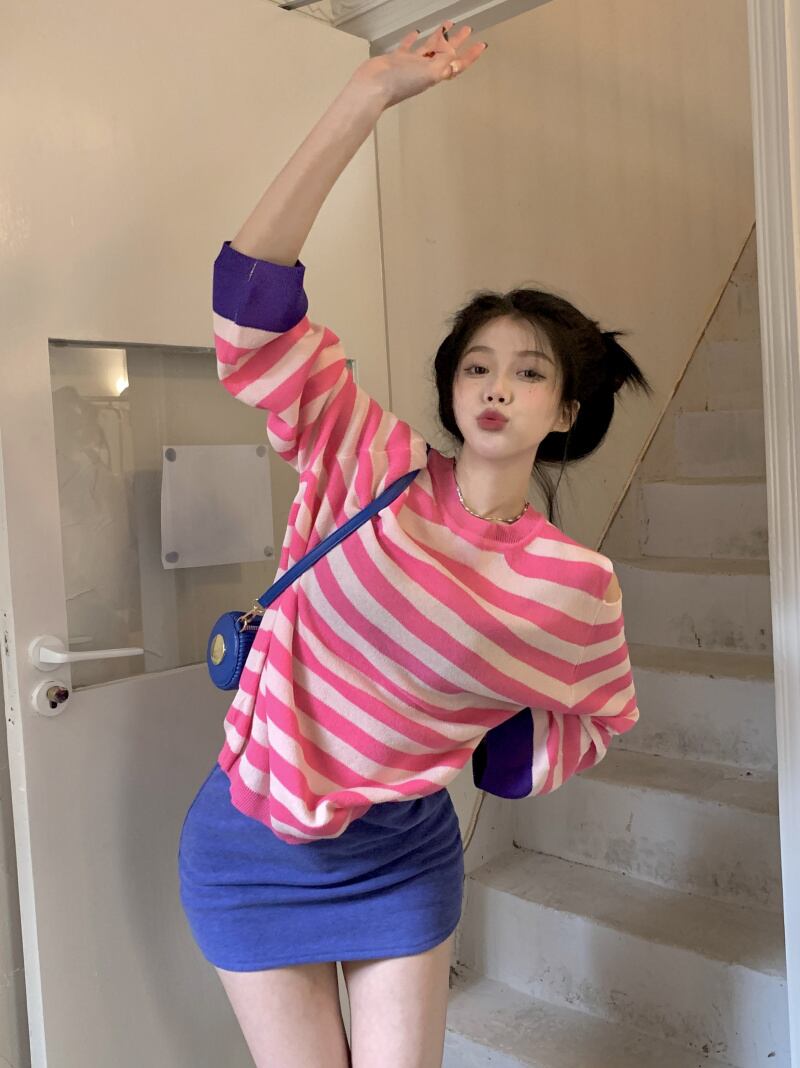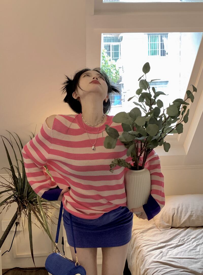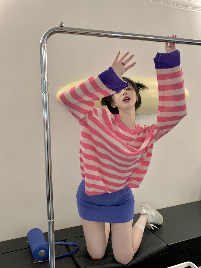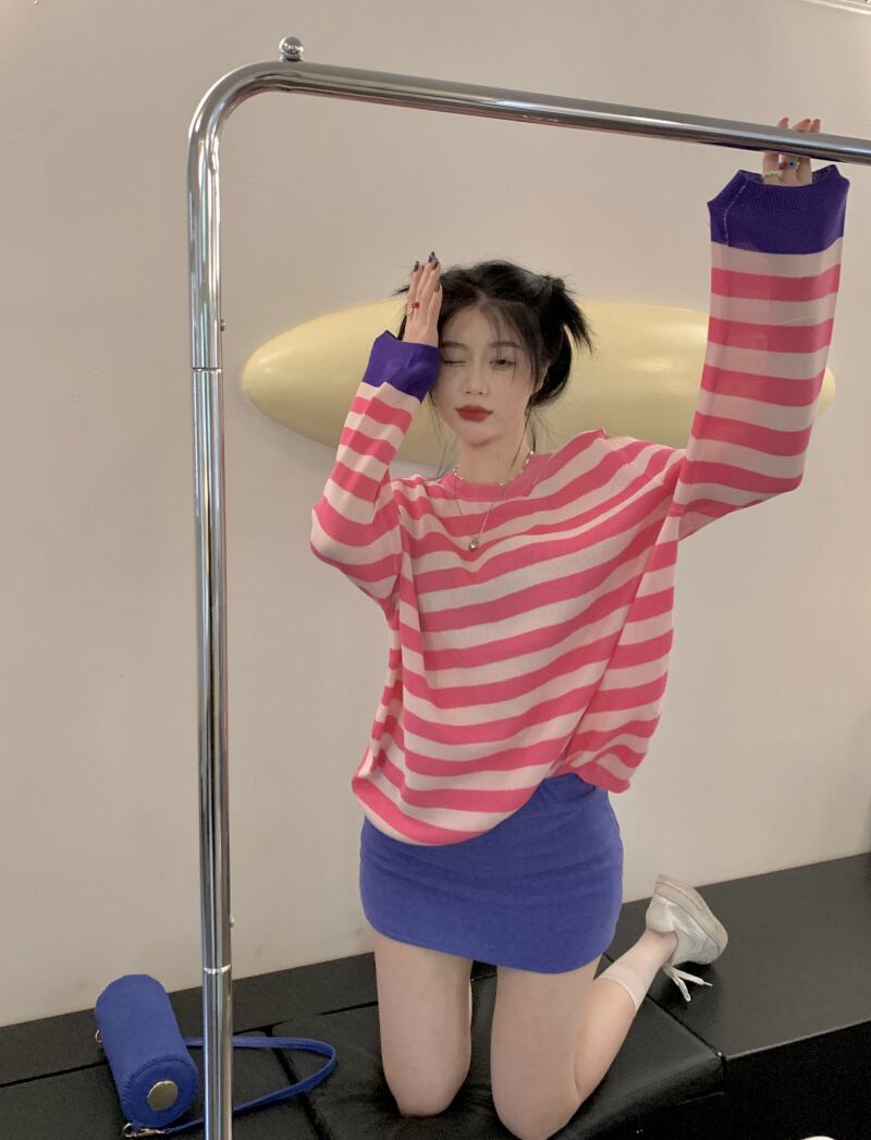 対照的なカラーストライプオフショルダー長袖日焼け止めシャツTシャツ女性香港スタイルの気質甘くて涼しい風の年齢を減らす甘いルーズトップトレンディ ロング 大人ガーリー スウィート キュート カジュアル 746003491341380 | framboise21