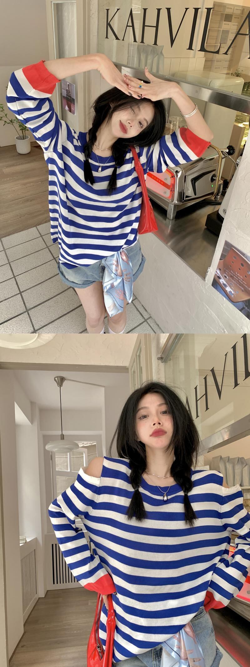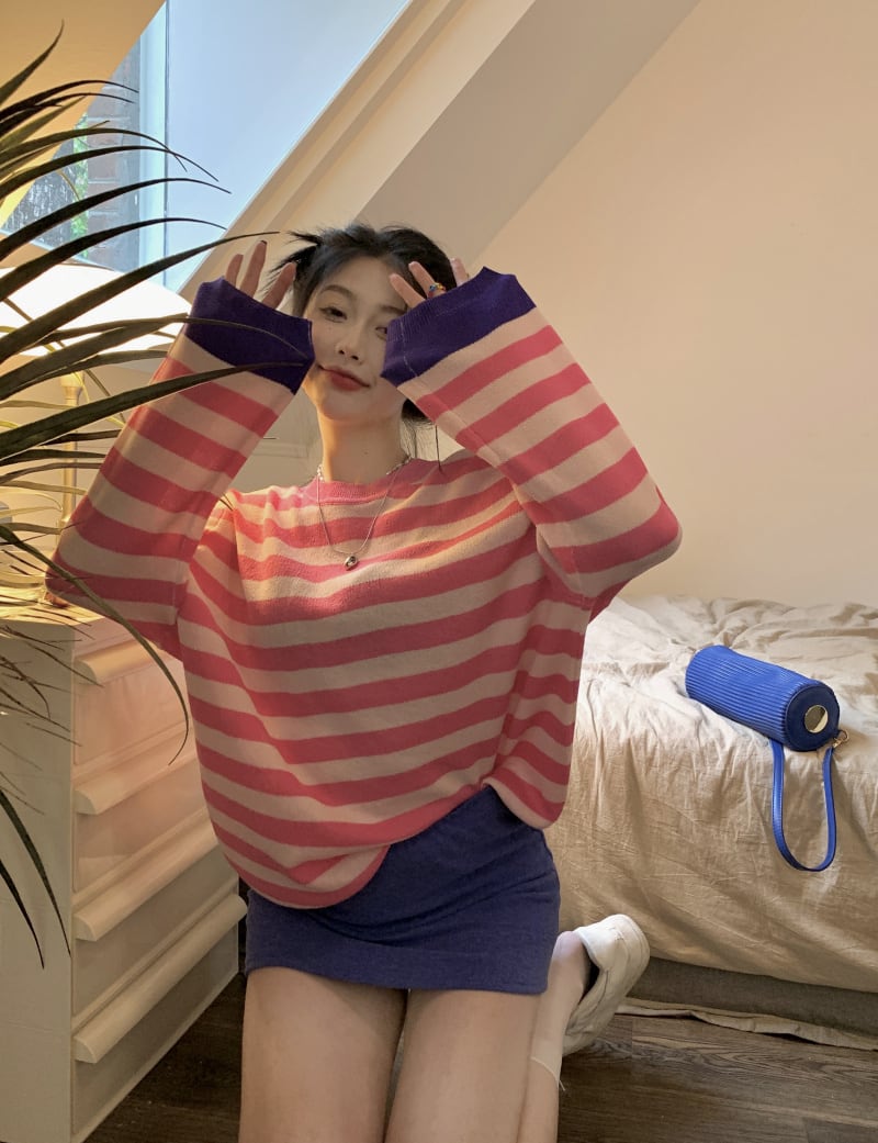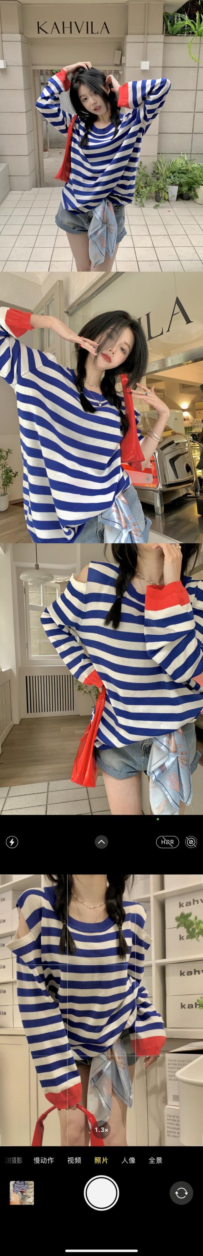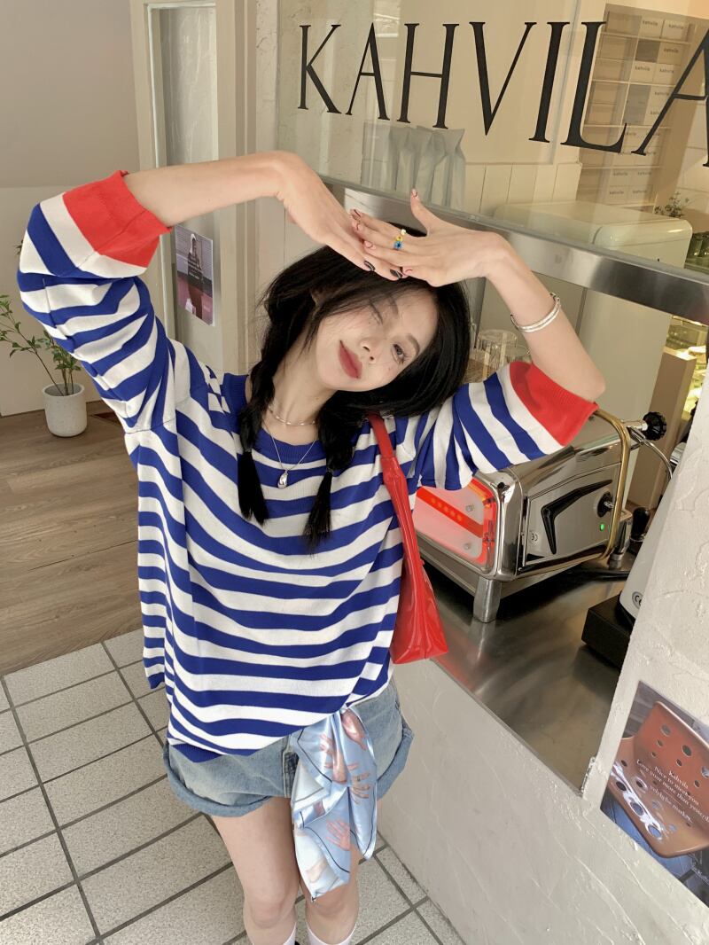対照的なカラーストライプオフショルダー長袖日焼け止めシャツTシャツ女性香港スタイルの気質甘くて涼しい風の年齢を減らす甘いルーズトップトレンディ ロング 大人ガーリー スウィート キュート カジュアル 746003491341380 | framboise21