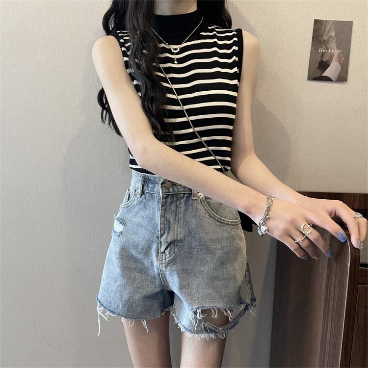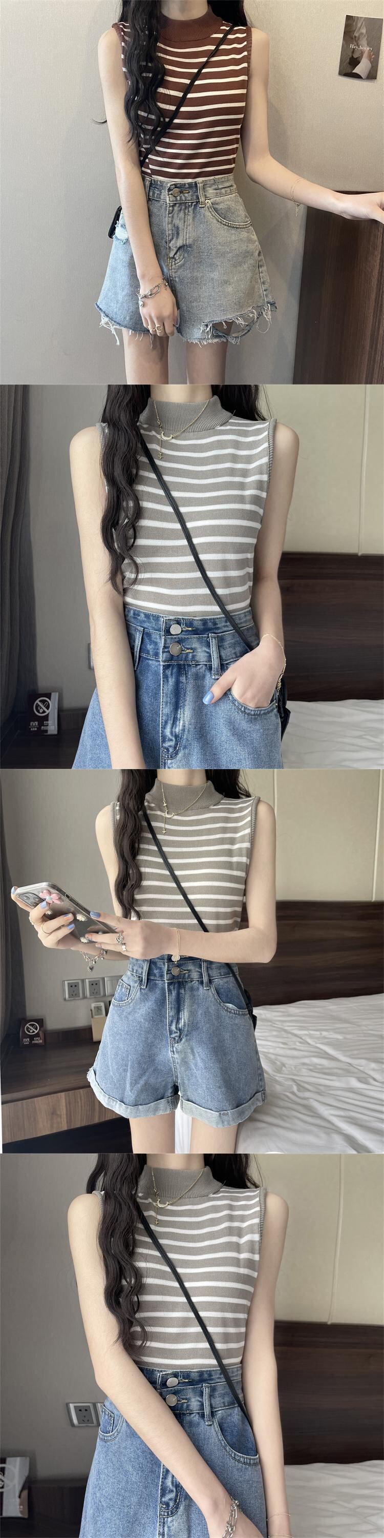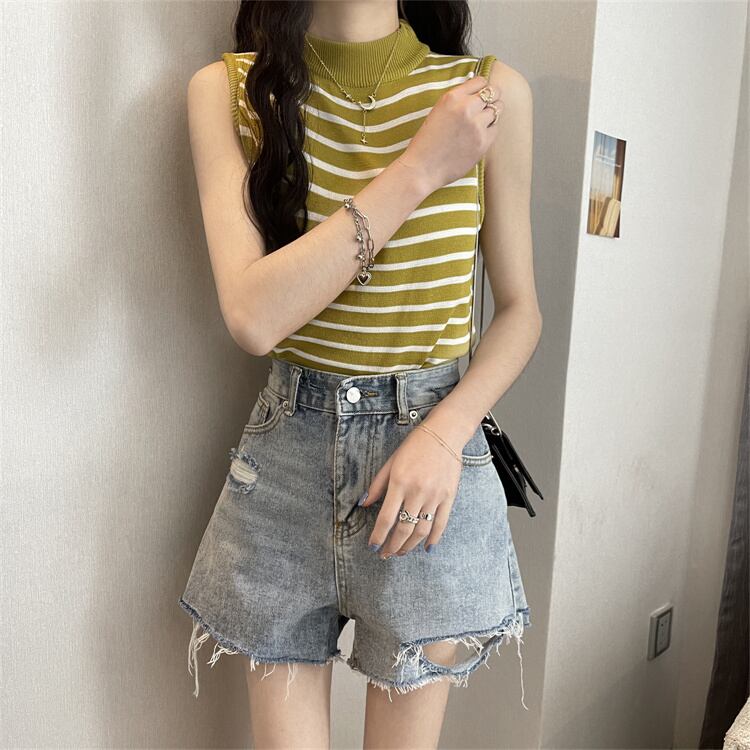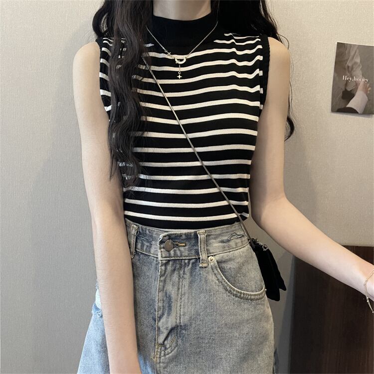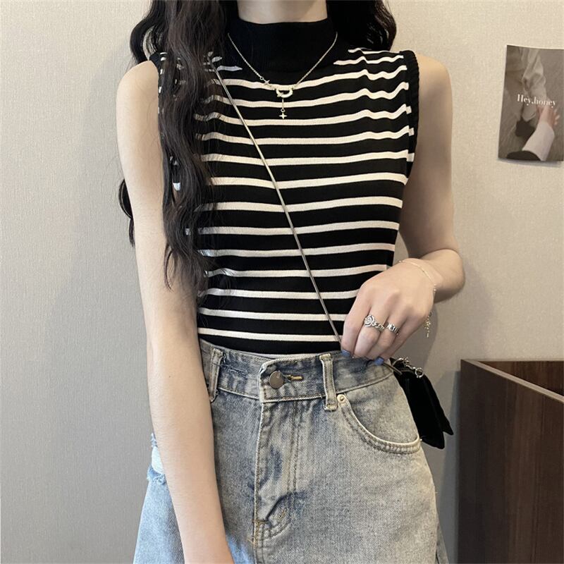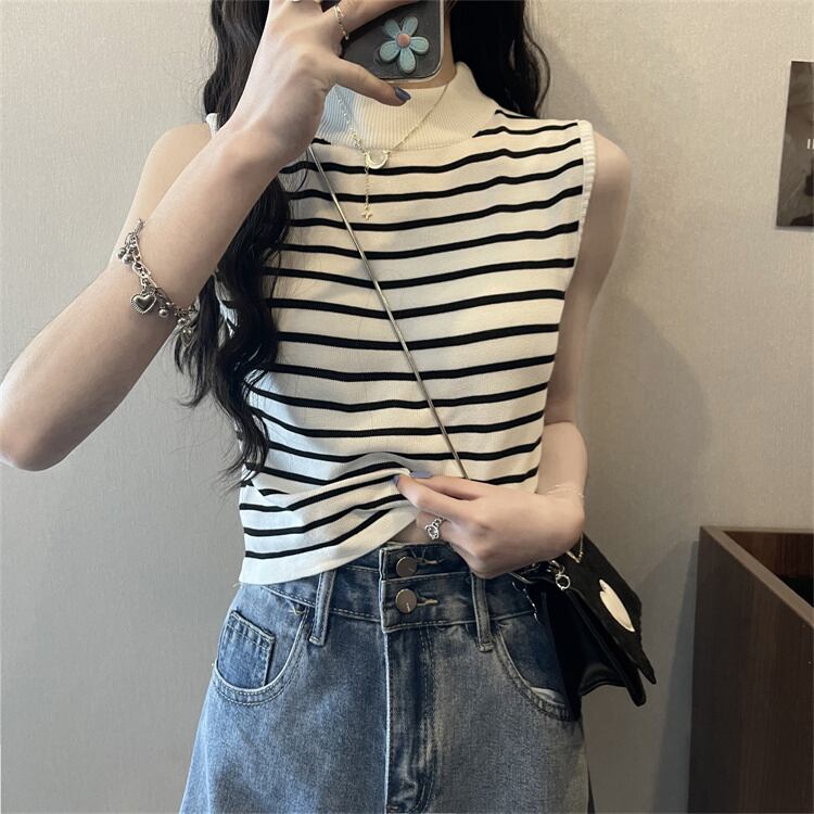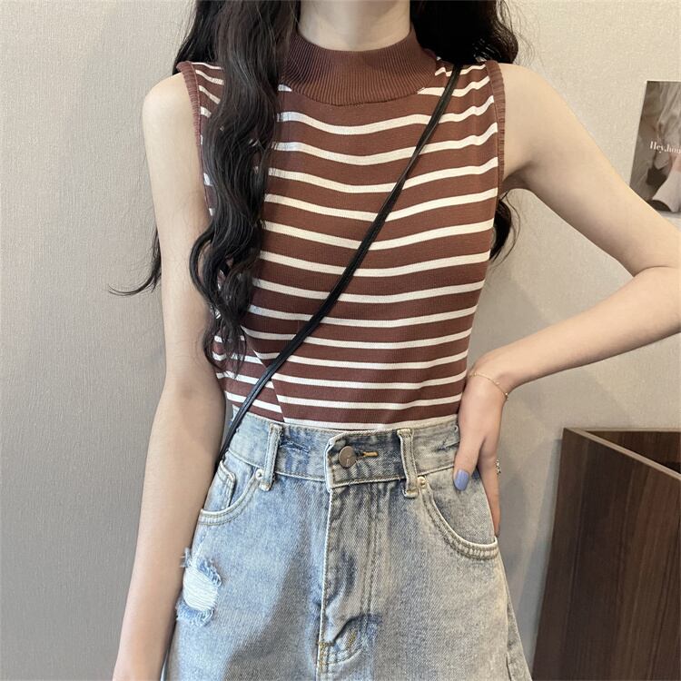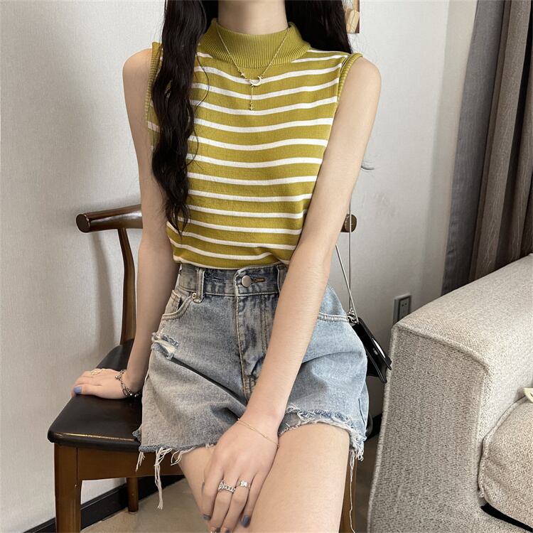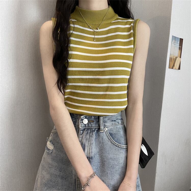 ストライプハーフタートルネックアイスシルクニットベストレディースサマーセルフカルチャーノースリーブTシャツボトミングシャツショートトップ 夏物 7460087920418815 | framboise21