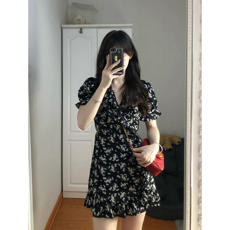 ブラックフローラルドレスレディース夏2022爆発スタイルハイエンドデザインセンス小さな美しいティーブレイクVネックスカート サマー 夏物 花柄 746004592227121 | framboise21