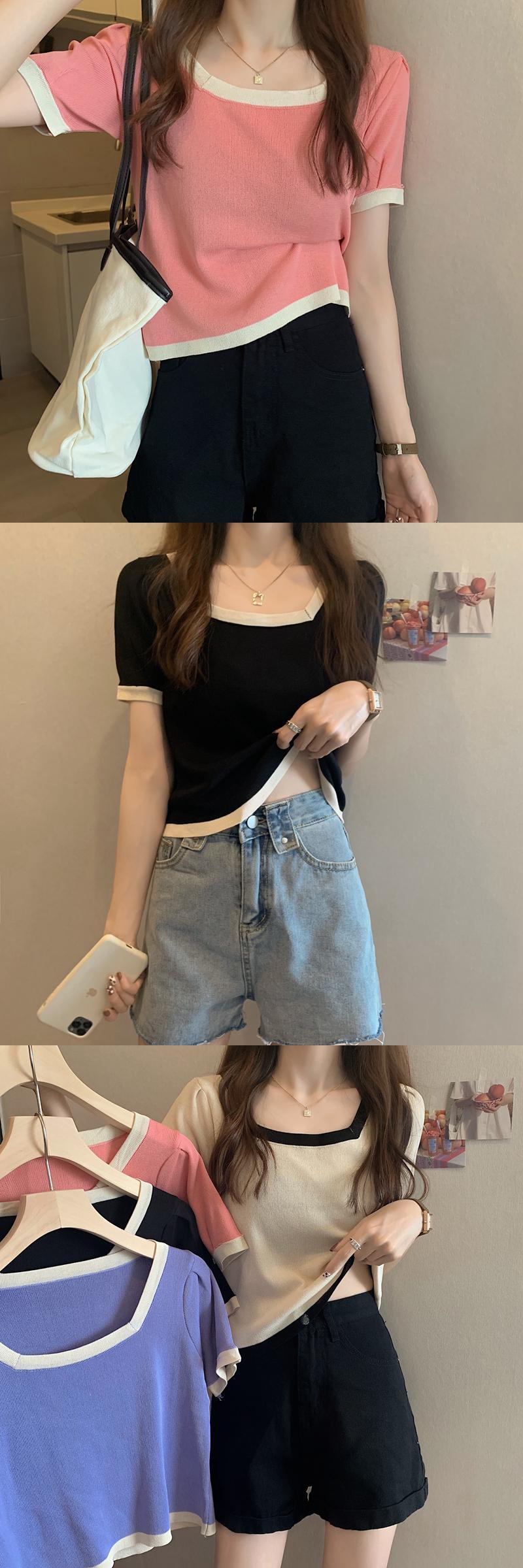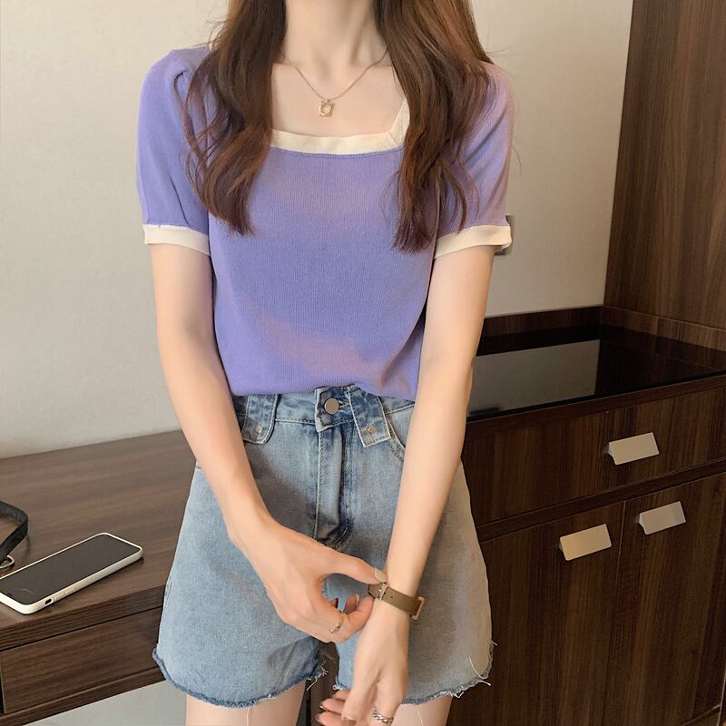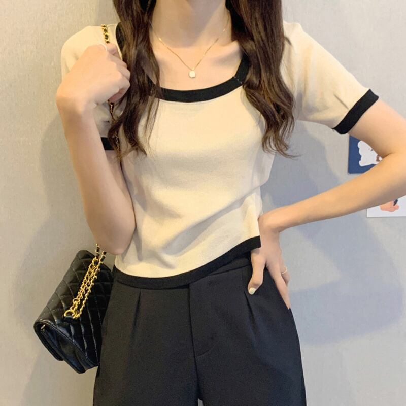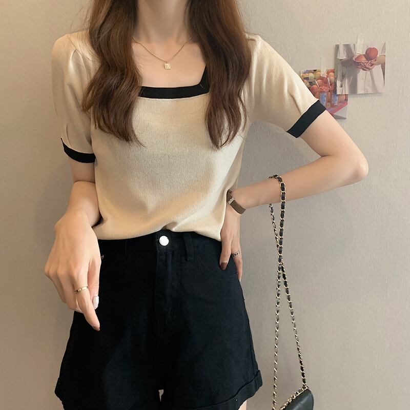 スクエアネックニット半袖Tシャツレディースアイスシルクフロントショルダーハーフスリーブデザインニッチスリムショートピュアスウィートトップ 大人ガーリー キュート カジュアル スクウェア 7460078538211776 | framboise21