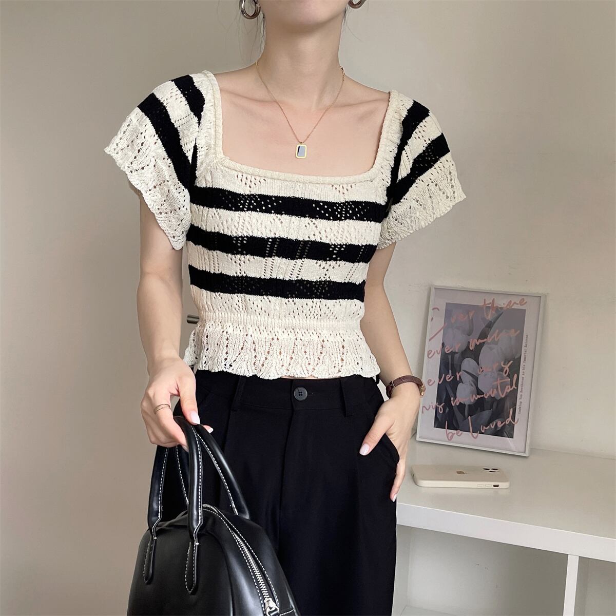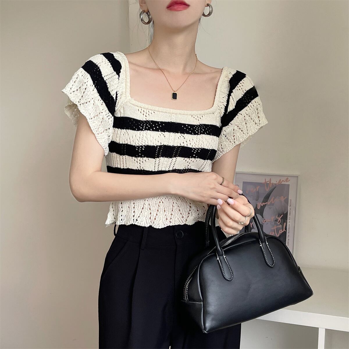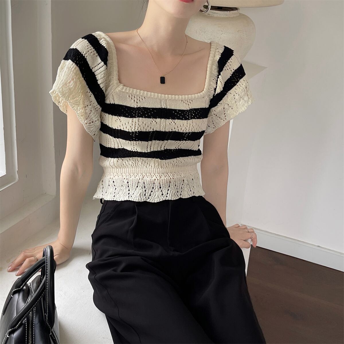 フレンチブラックとホワイトのストライプアイスシルクニットセーターレディース半袖スクエアネックTシャツサマーエインスタイルスモールシャツホローショートトップ 夏物 スクウェア 7460080887096606 | framboise21