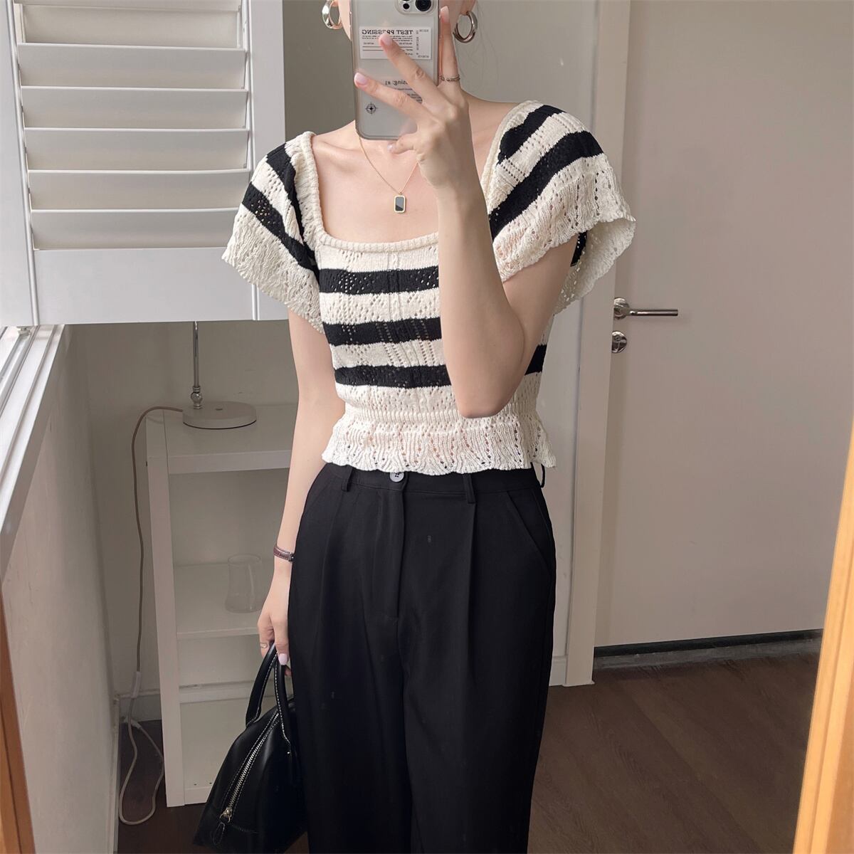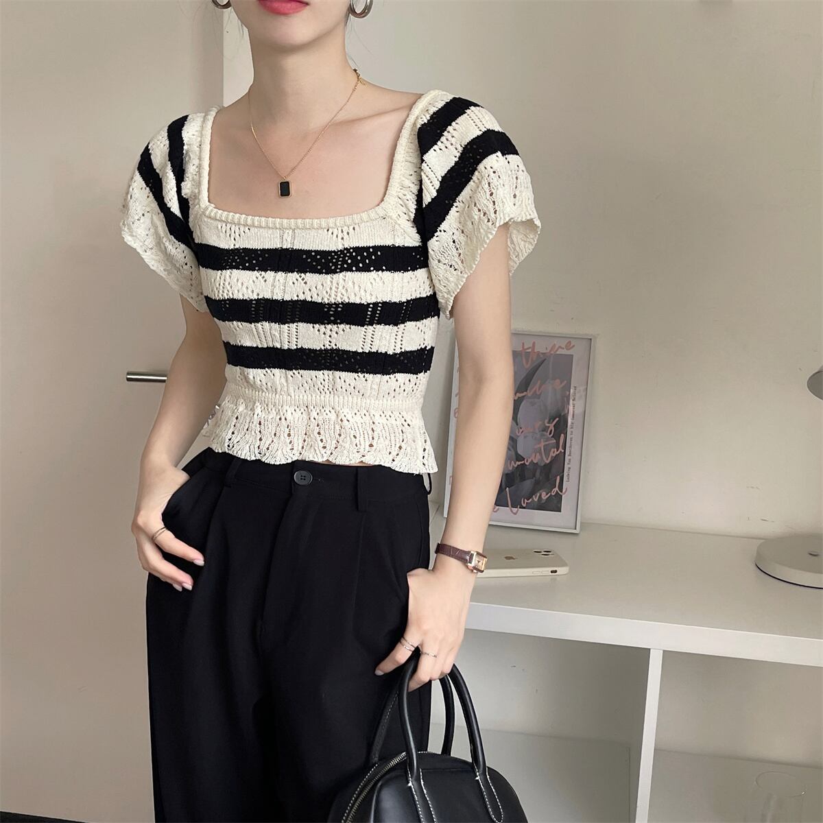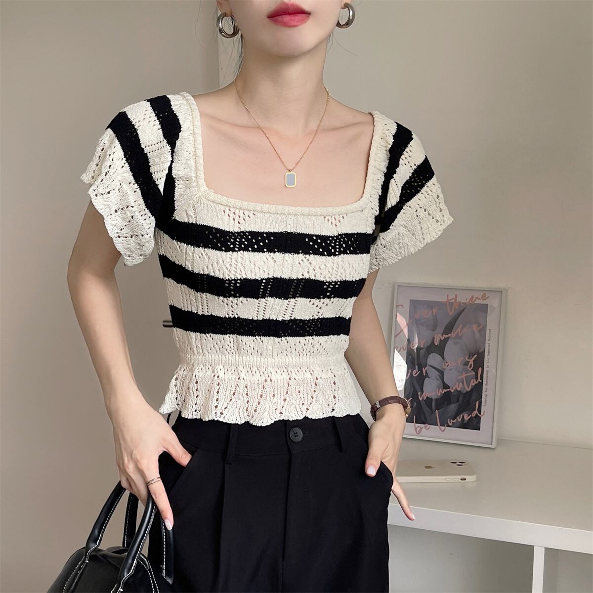 フレンチブラックとホワイトのストライプアイスシルクニットセーターレディース半袖スクエアネックTシャツサマーエインスタイルスモールシャツホローショートトップ 夏物 スクウェア 7460080887096606 | framboise21