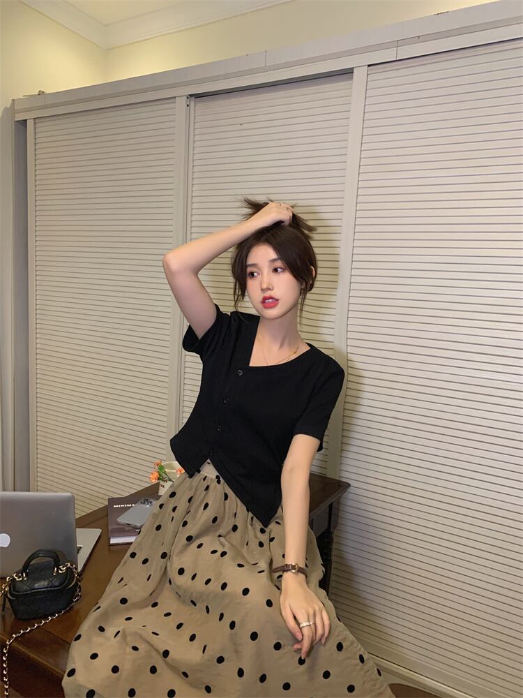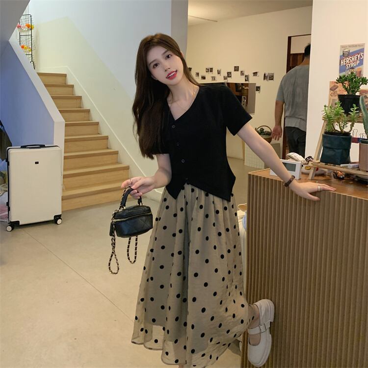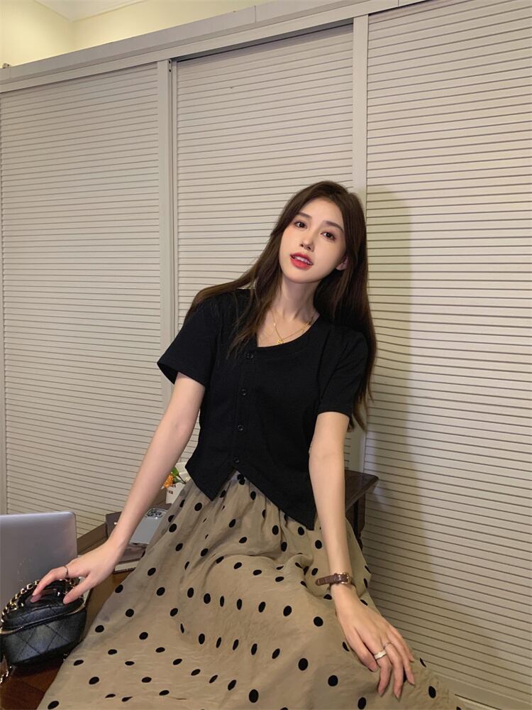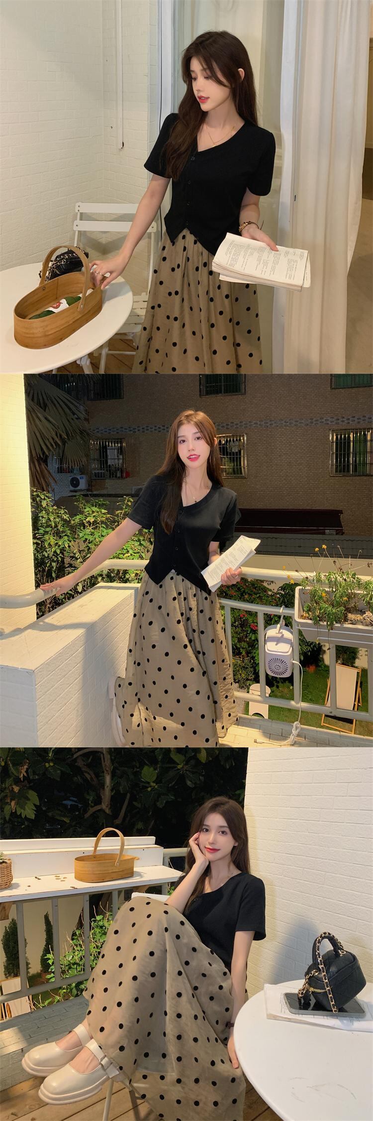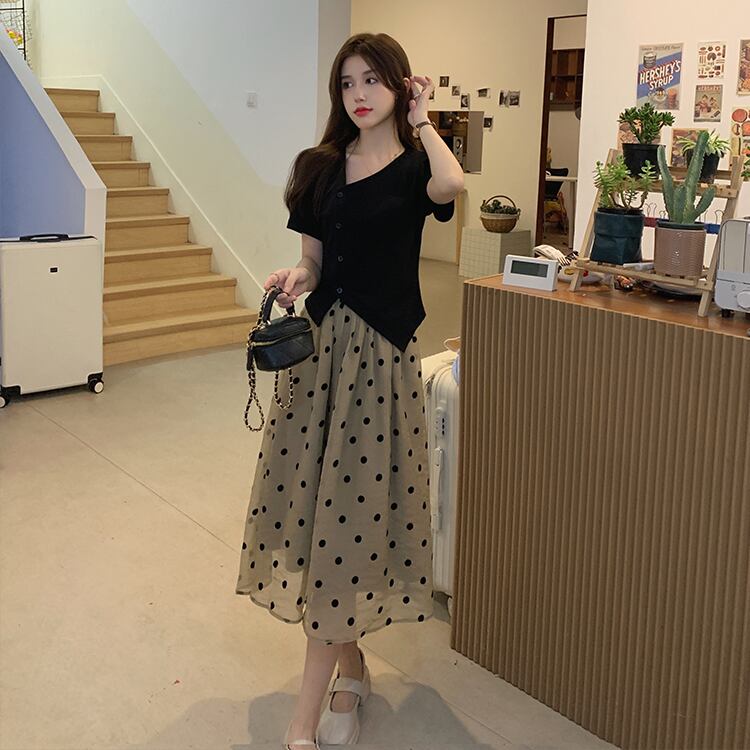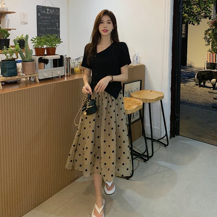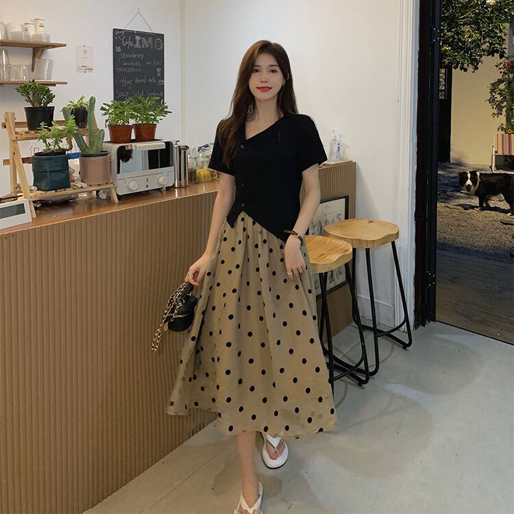 色:黒いTシャツ,水玉スカート