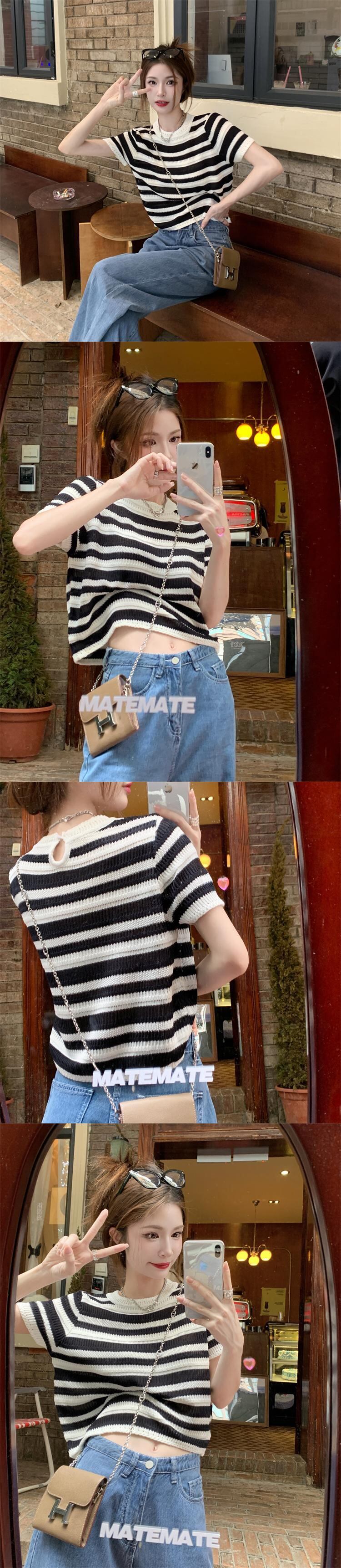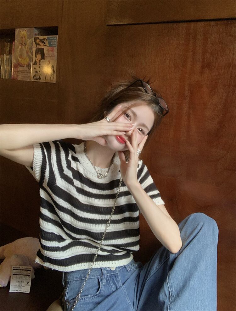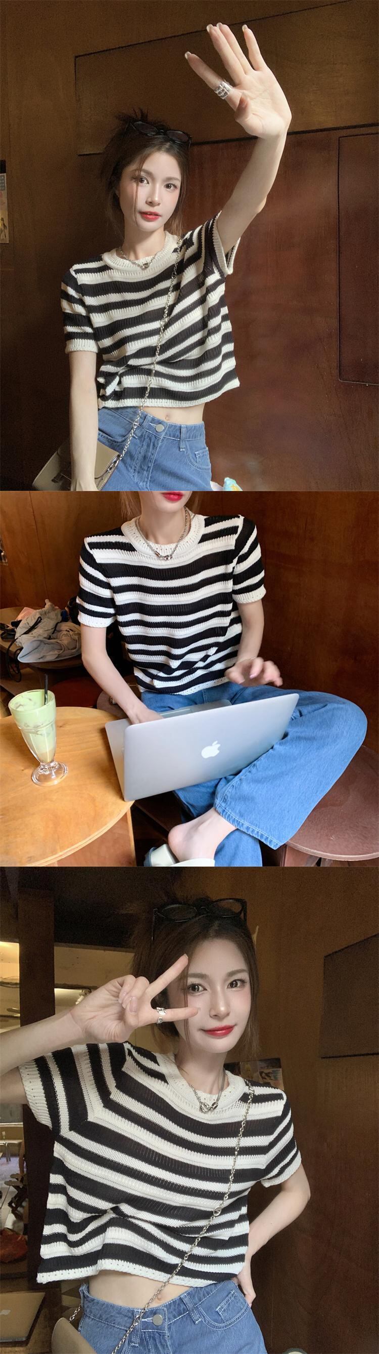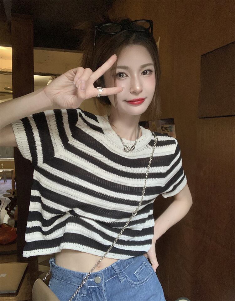 黒と白のストライプの中空ニット半袖フロントショルダーTシャツ女性の夏のスリムフィットと薄い露出したへそショートトップ薄いセクション ホワイト ブラック サマー 夏物 7460056779921453 | framboise21