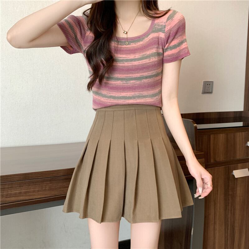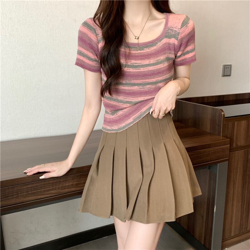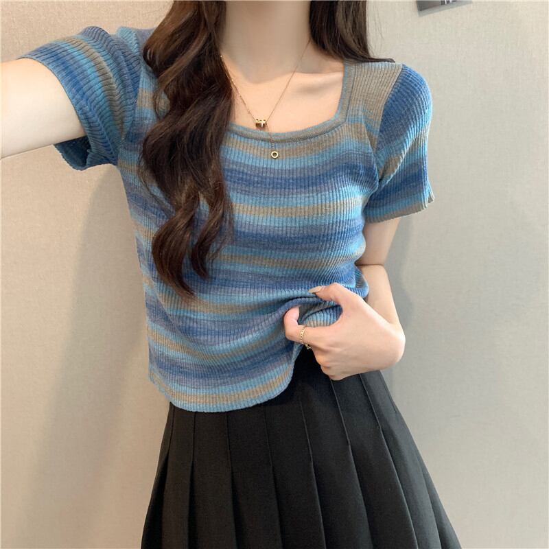アイスシルクニット半袖Tシャツレディースサマーデザインニッチフレンチカラーボーンスクエアカラーストライプショルダーショートトップ 夏物 スクウェア 7460015969718472 | framboise21