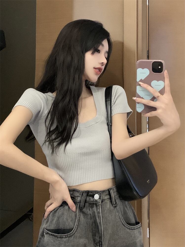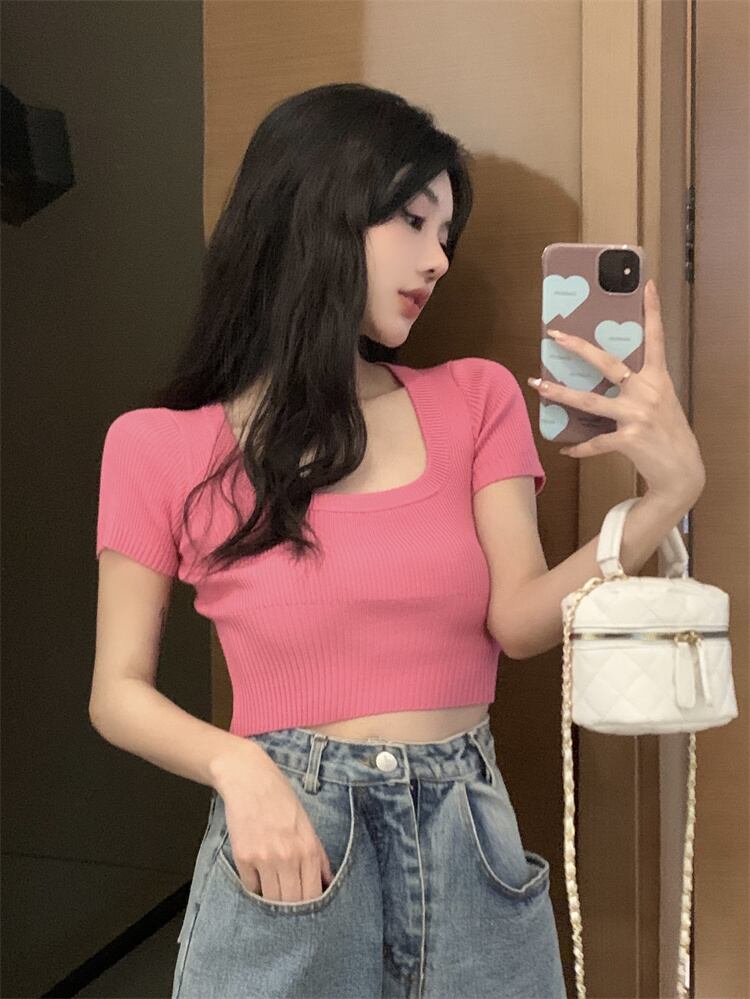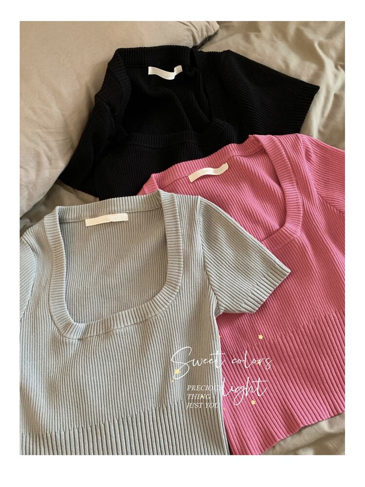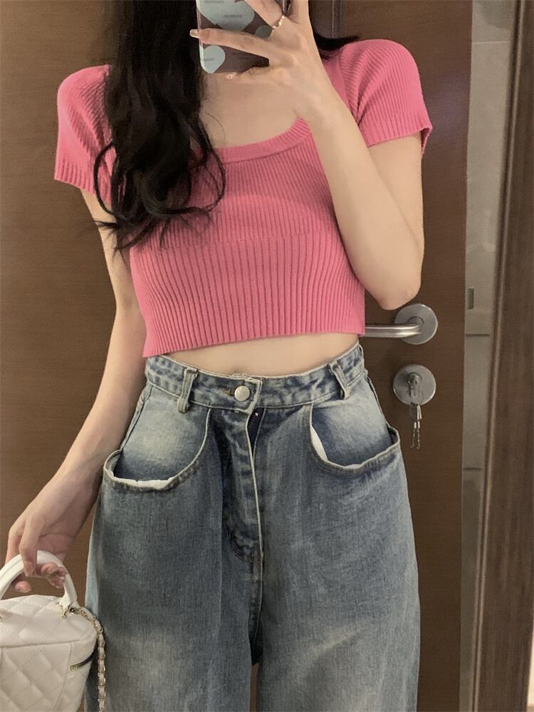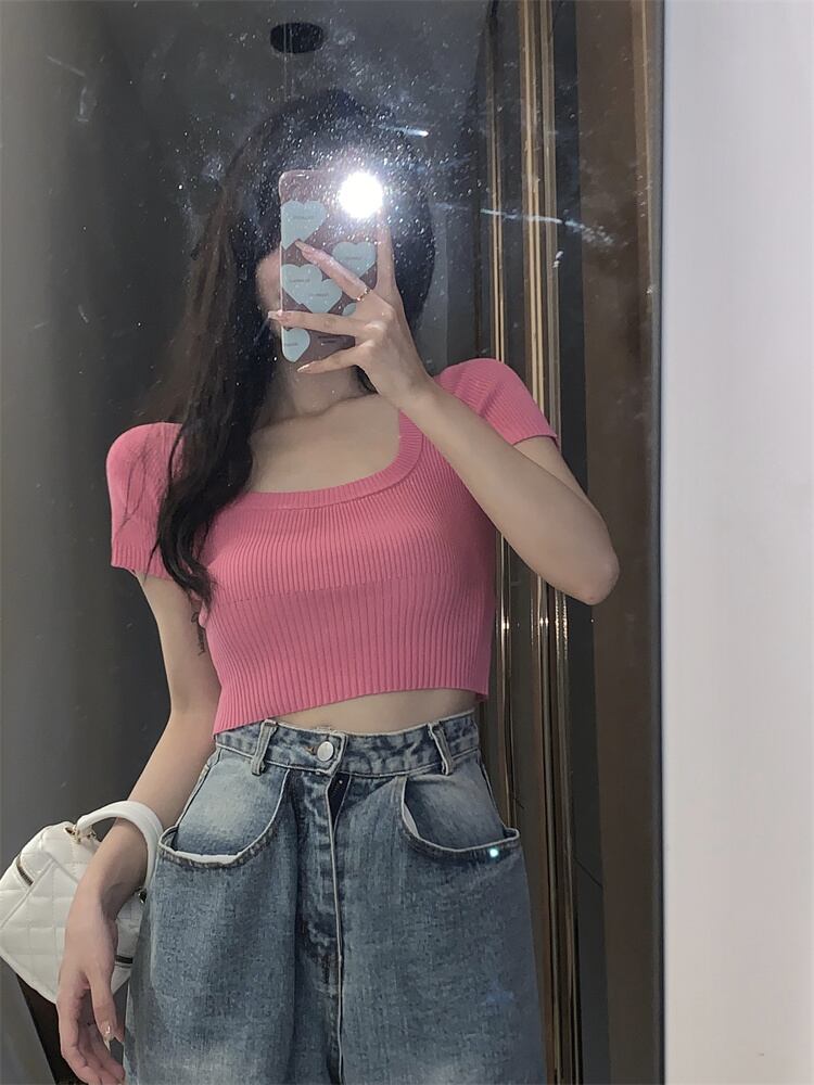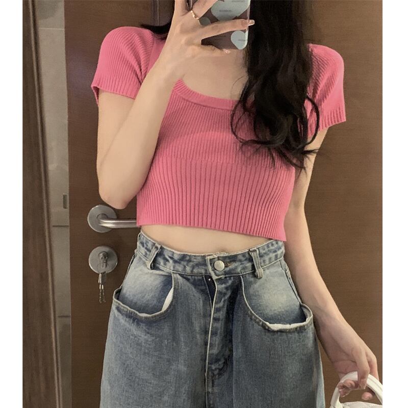 2022年の新しい夏の女性の純粋な欲望ハイウエストの短いへそトップスのスリムフィットとスリムなスクエアネックの半袖セーター ショート サマー 夏物 ピュア スクウェア 7460096111964275 | framboise21