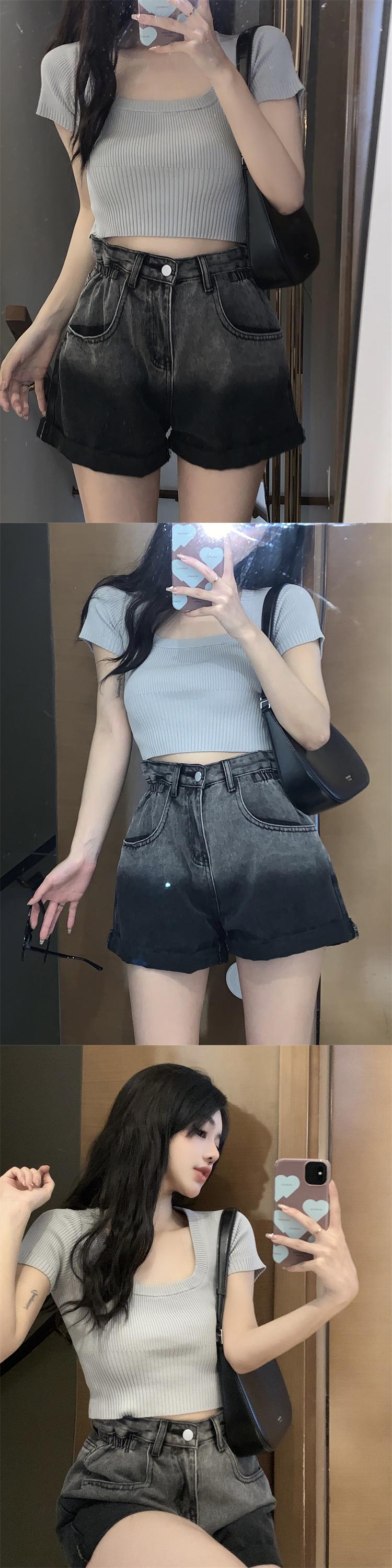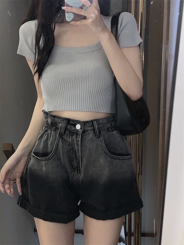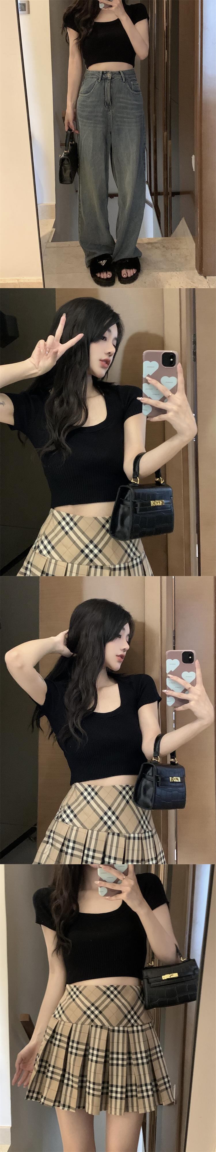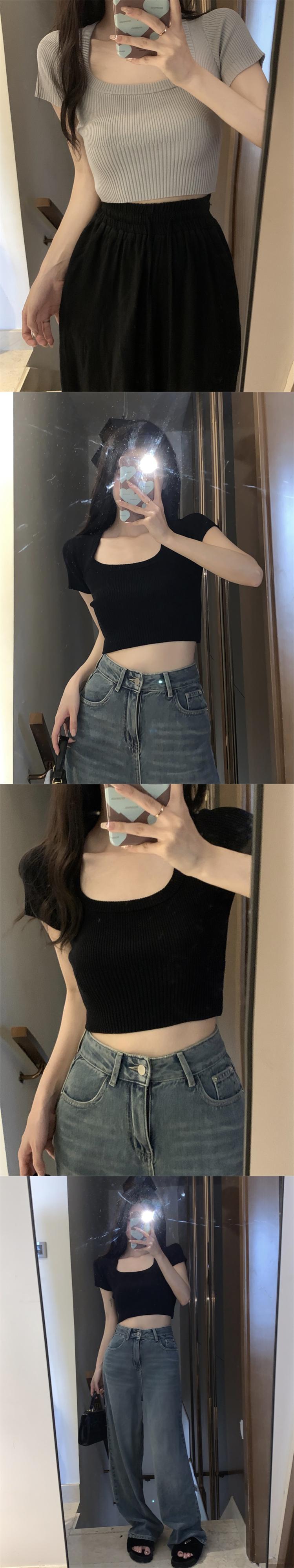 2022年の新しい夏の女性の純粋な欲望ハイウエストの短いへそトップスのスリムフィットとスリムなスクエアネックの半袖セーター ショート サマー 夏物 ピュア スクウェア 7460096111964275 | framboise21