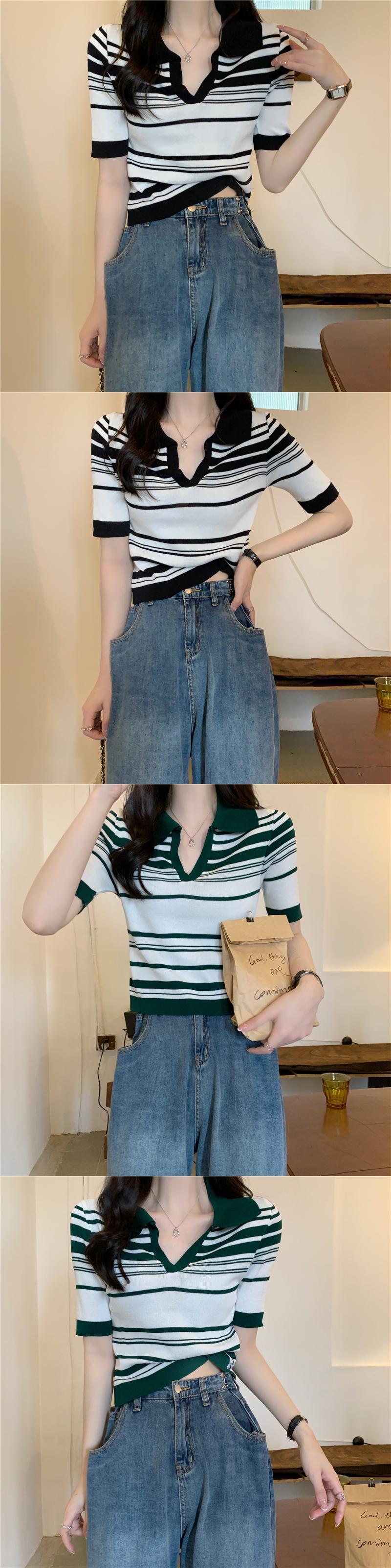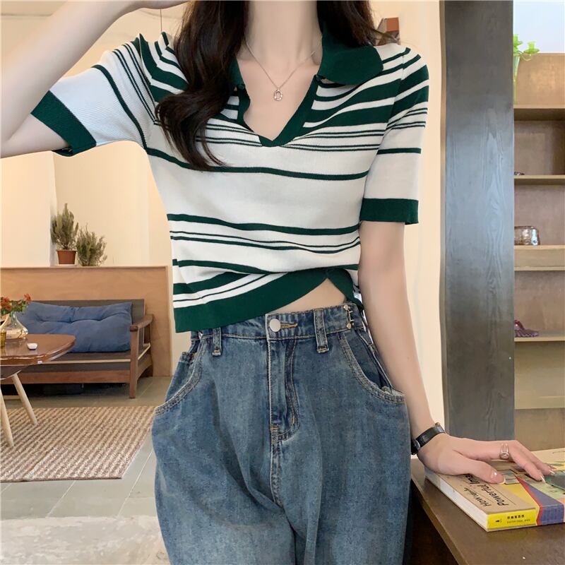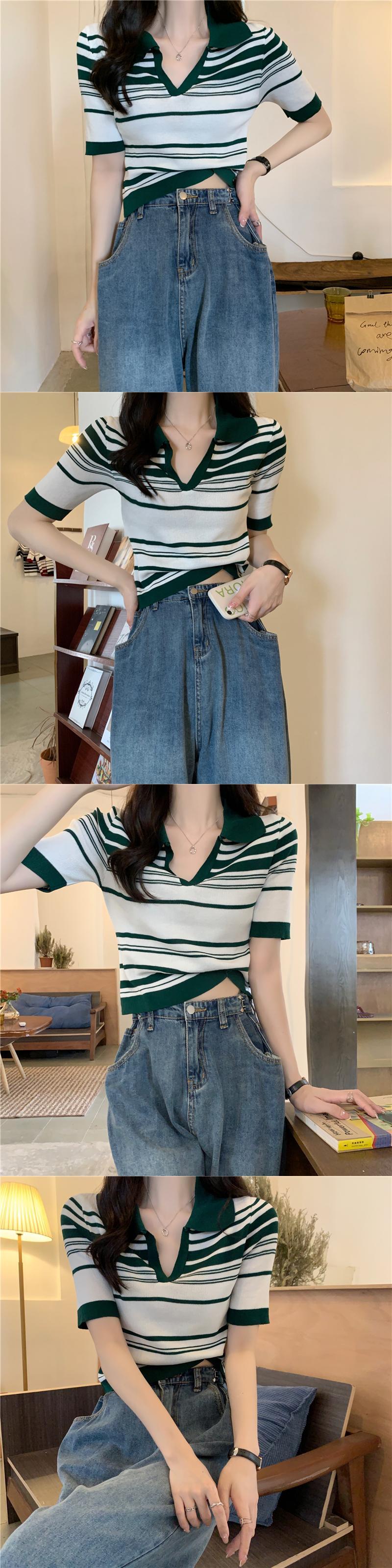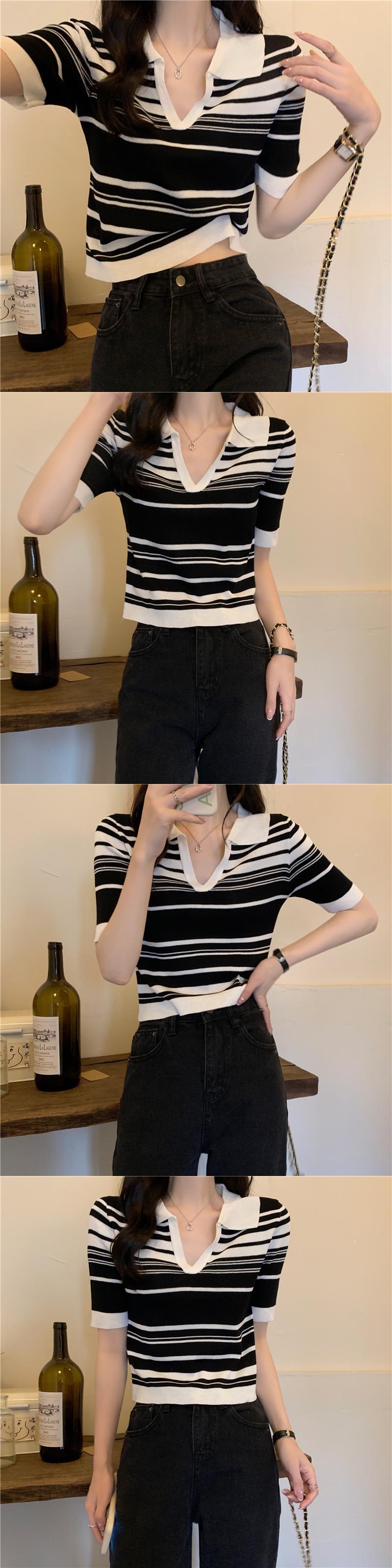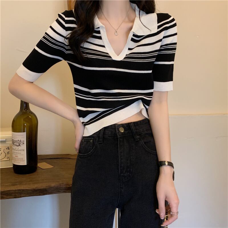 黒と白のストライプのポロシャツ半袖Tシャツ女性の夏のデザインニッチフロントショルダーVネックショートトップ、ハイウエストパンツ ハイウェスト ホワイト ブラック サマー 夏物 7460080907588552 | framboise21