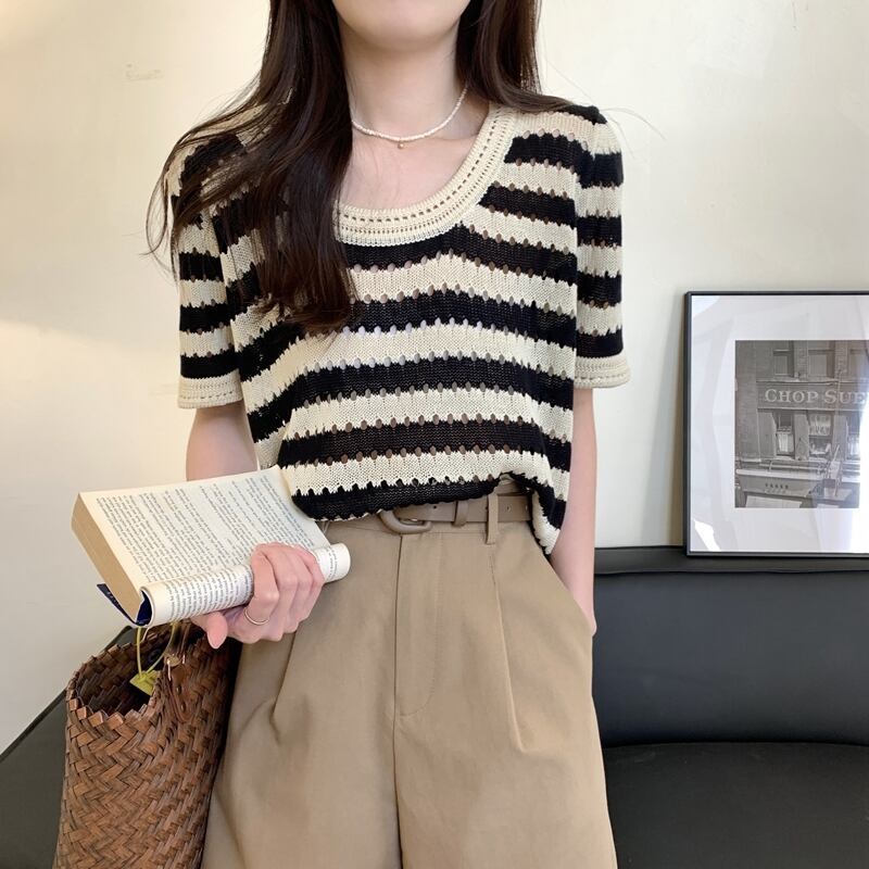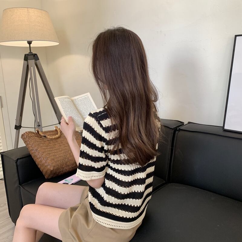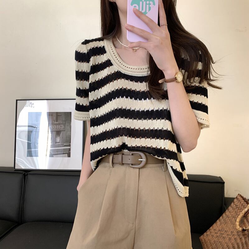 ストライプニット半袖Tシャツレディース2022年夏の新しいウエスタンスタイルの年齢を減らすルーズなデザインの中空の薄いトップ サマー 夏物 7460075983040765 | framboise21