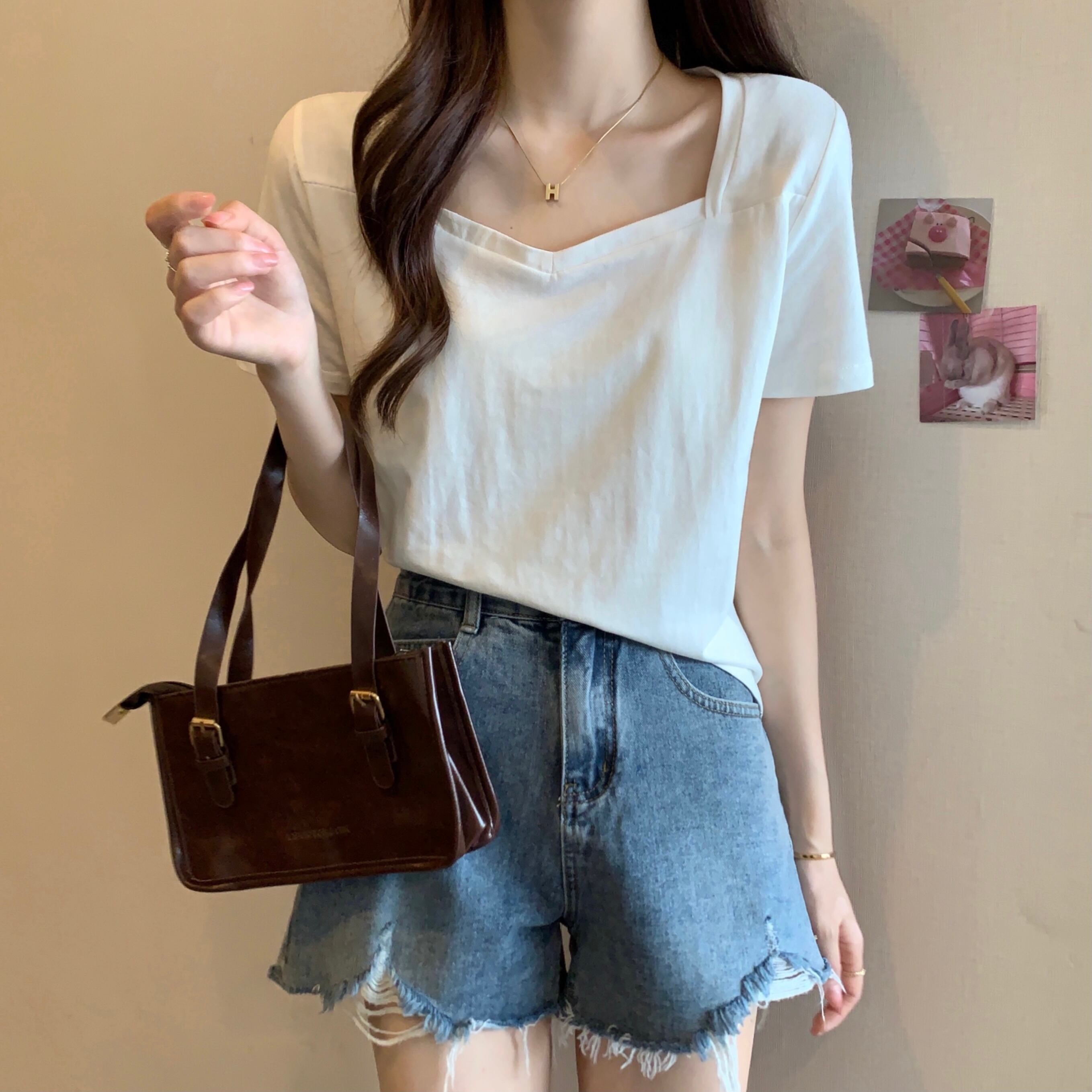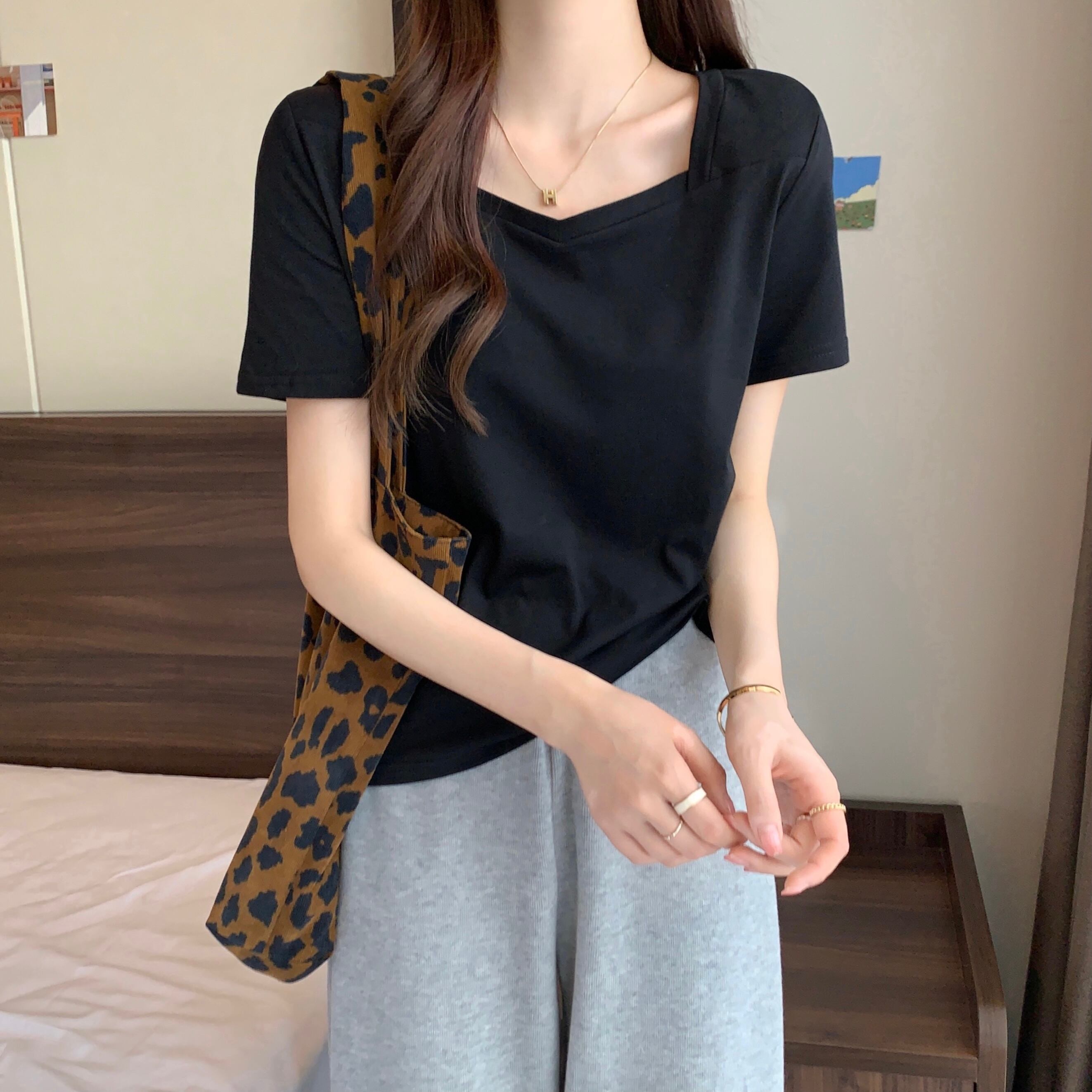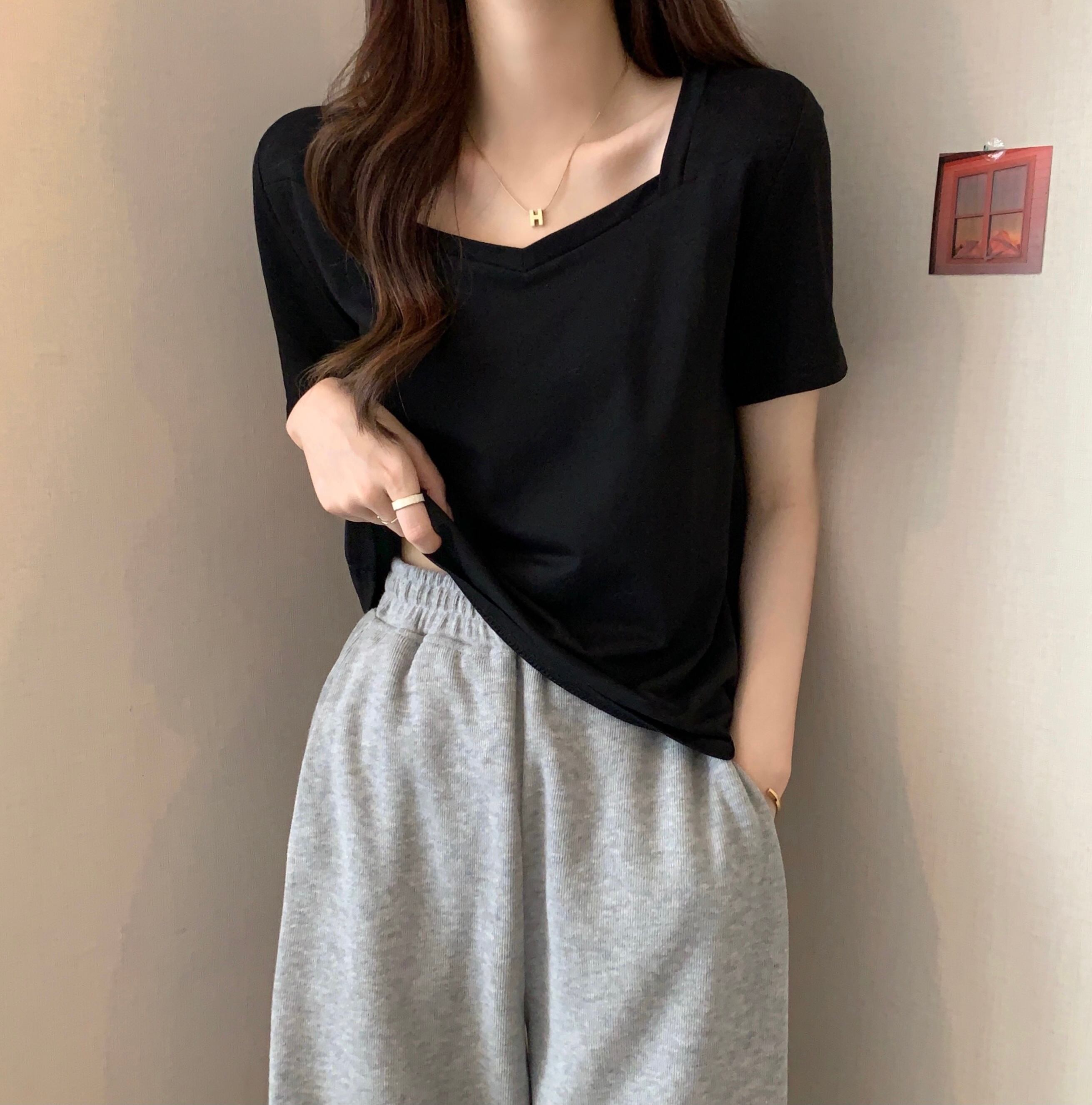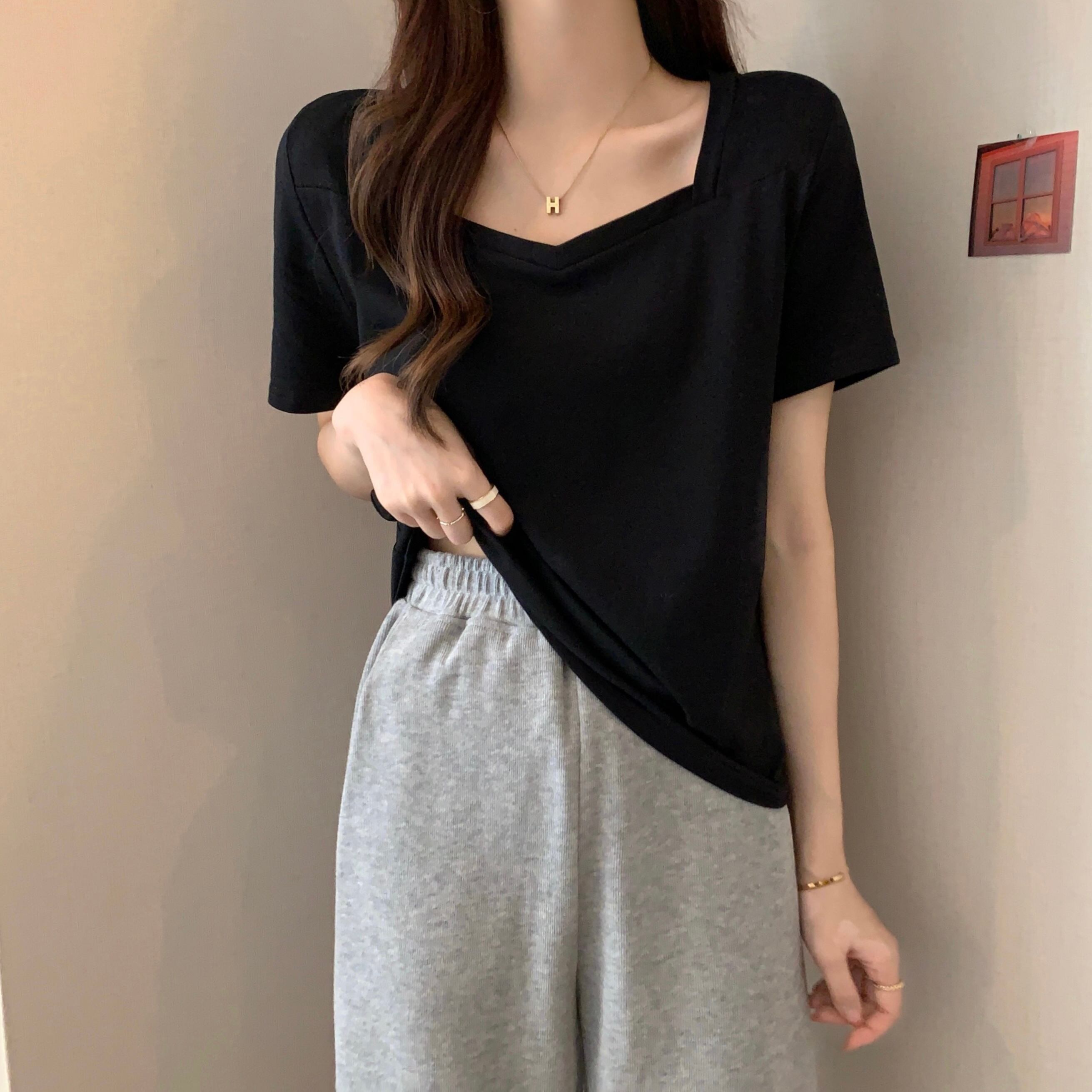 スクエアネックショルダーTシャツレディース半袖2022年夏新作ルーズコットンTシャツデザインスリムVネックトップ サマー 夏物 スクウェア 7460018792229399 | framboise21