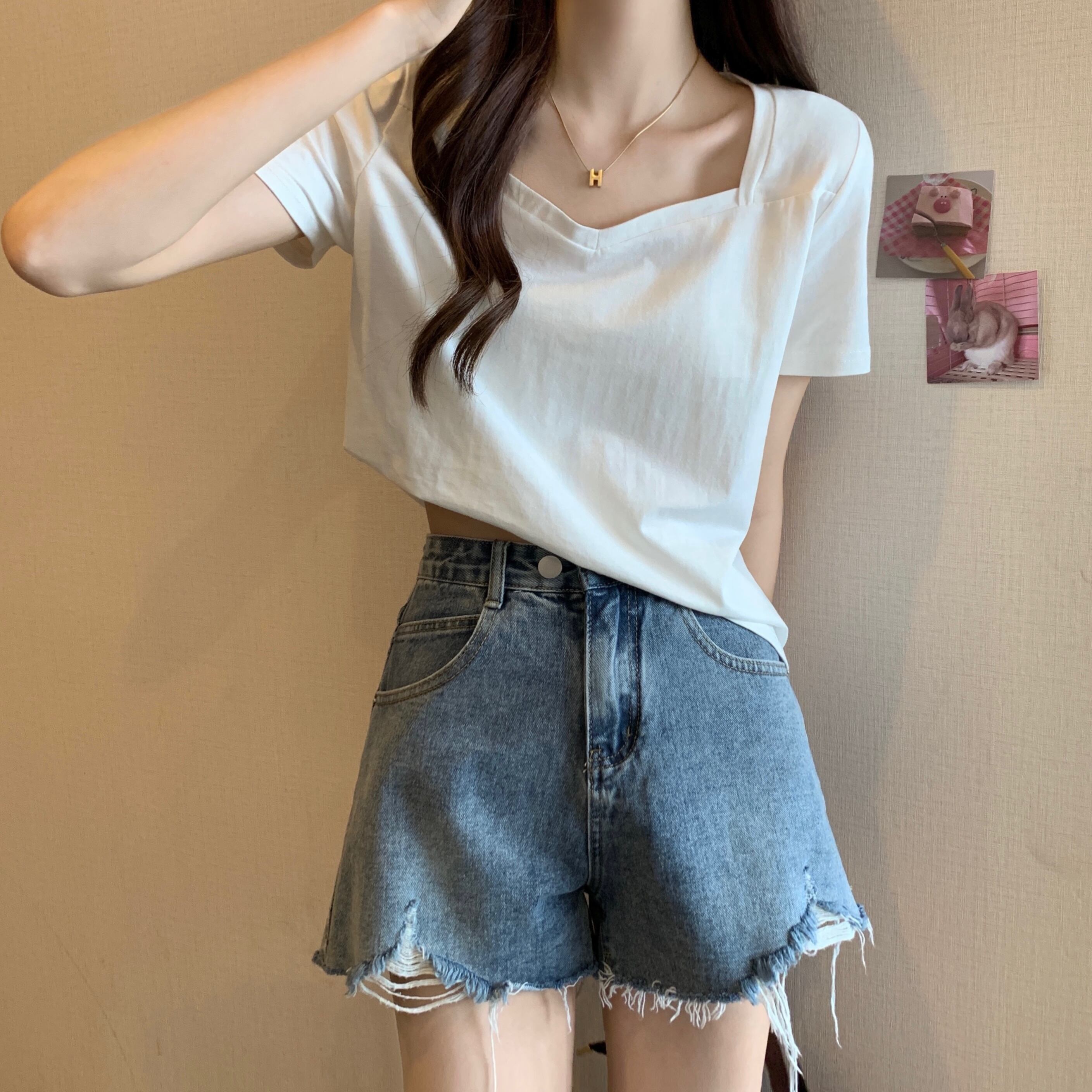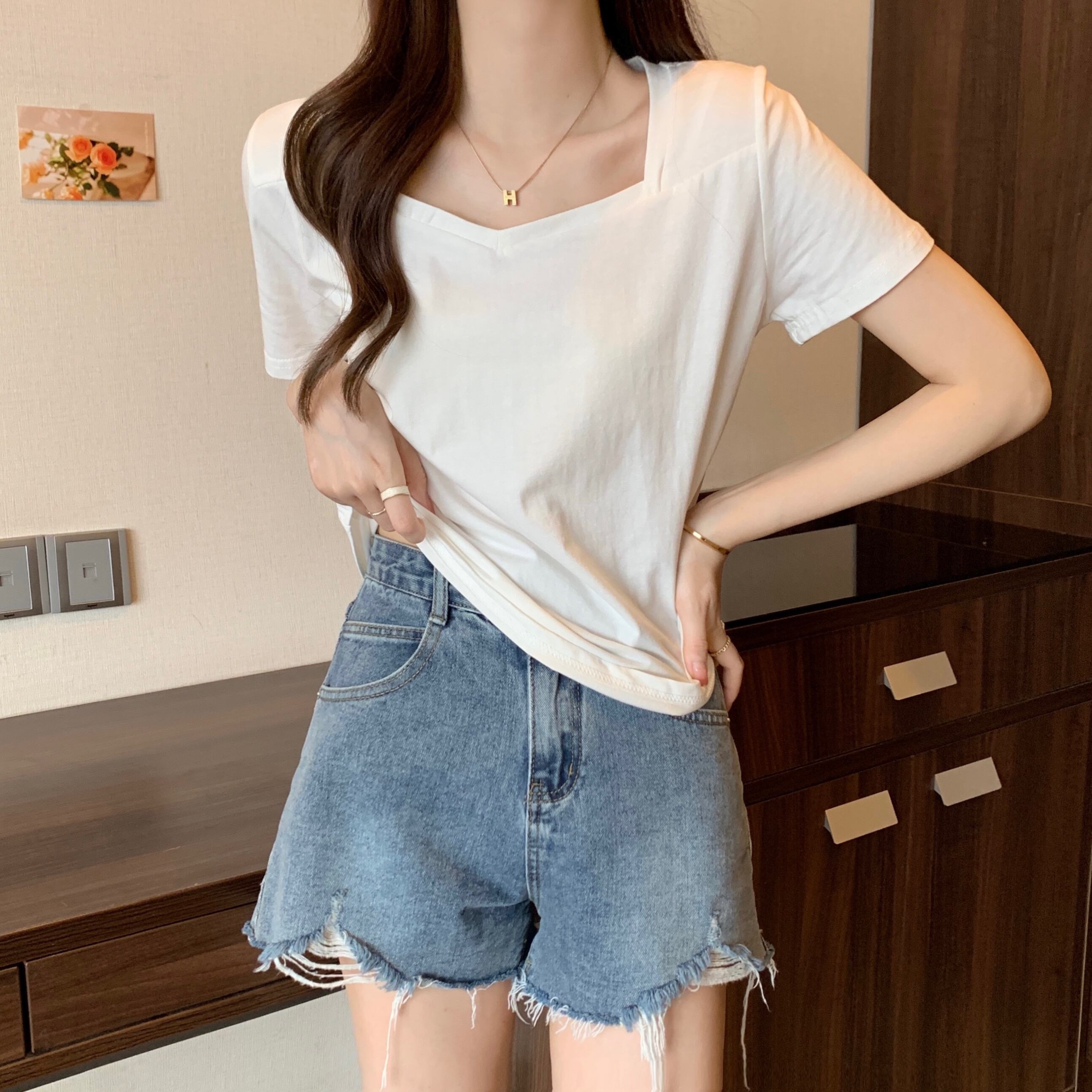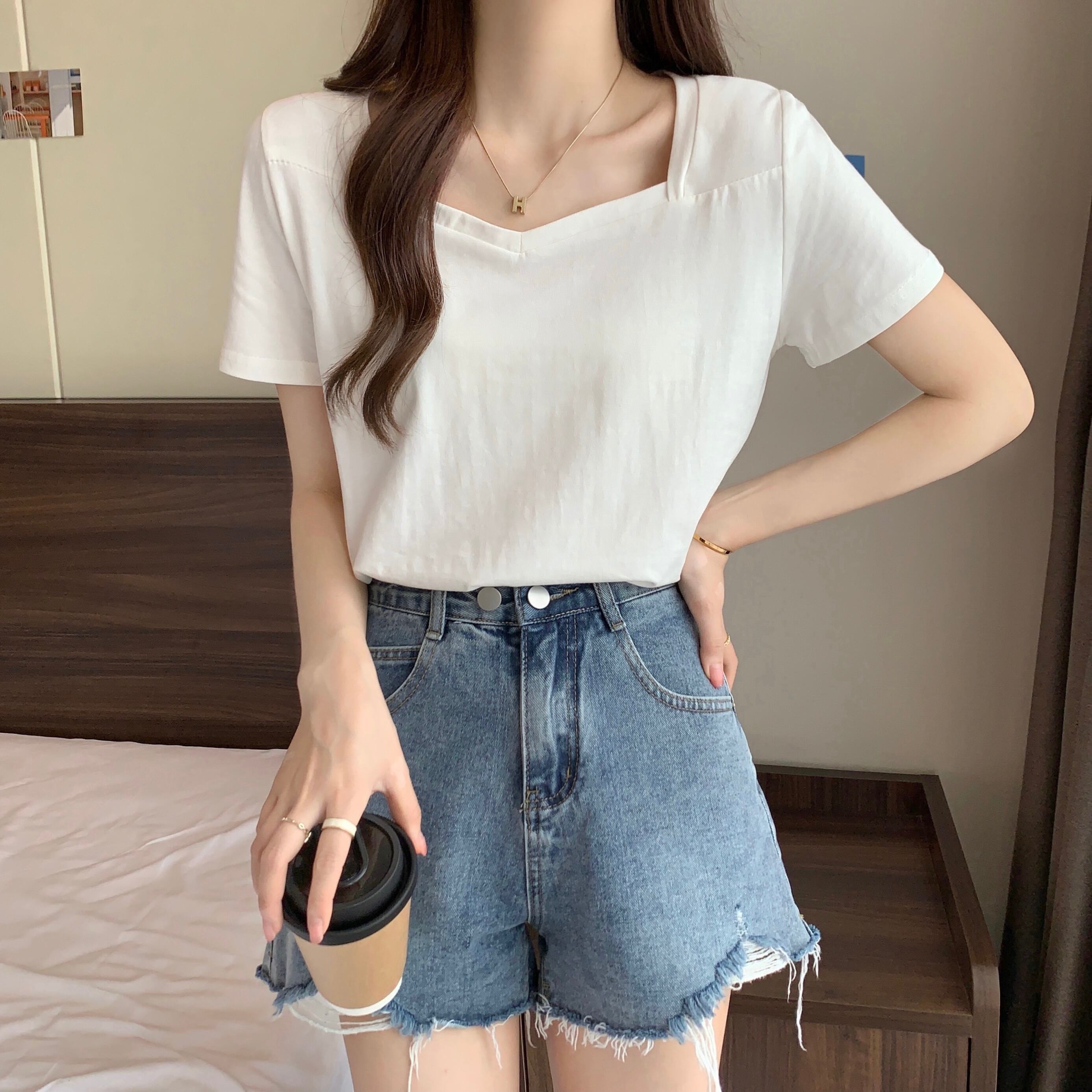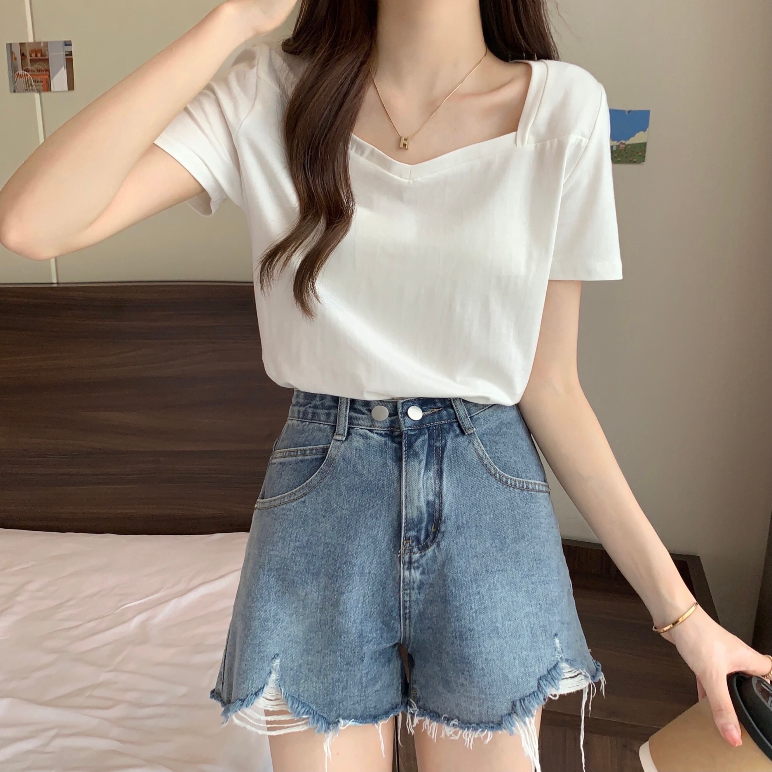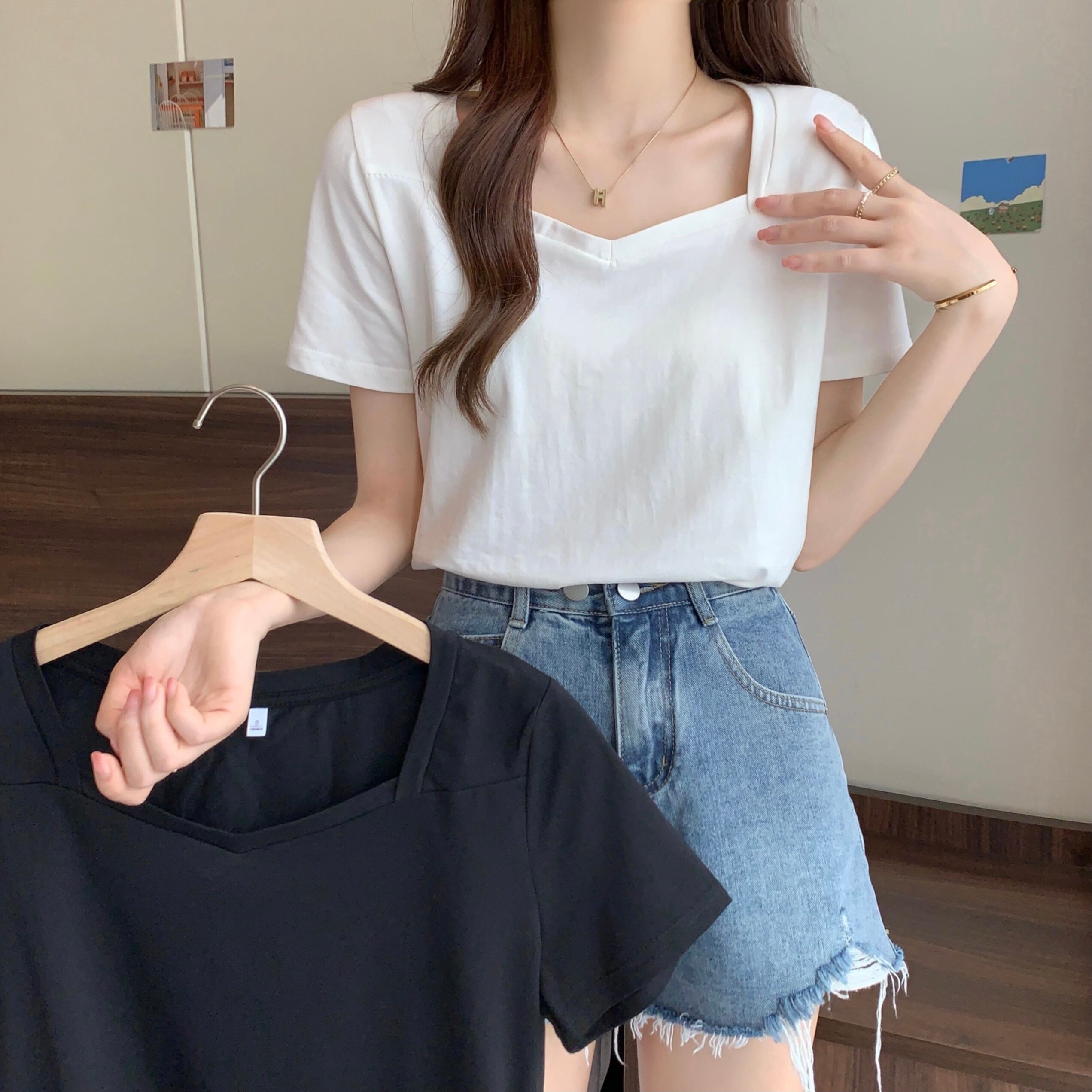 スクエアネックショルダーTシャツレディース半袖2022年夏新作ルーズコットンTシャツデザインスリムVネックトップ サマー 夏物 スクウェア 7460018792229399 | framboise21