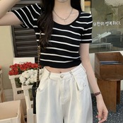 レトロなストライプの半袖Tシャツ女性の2022年夏の新しいイン香港スタイルのシックなショートへそニットセータートップ サマー 夏物 7460023973765693