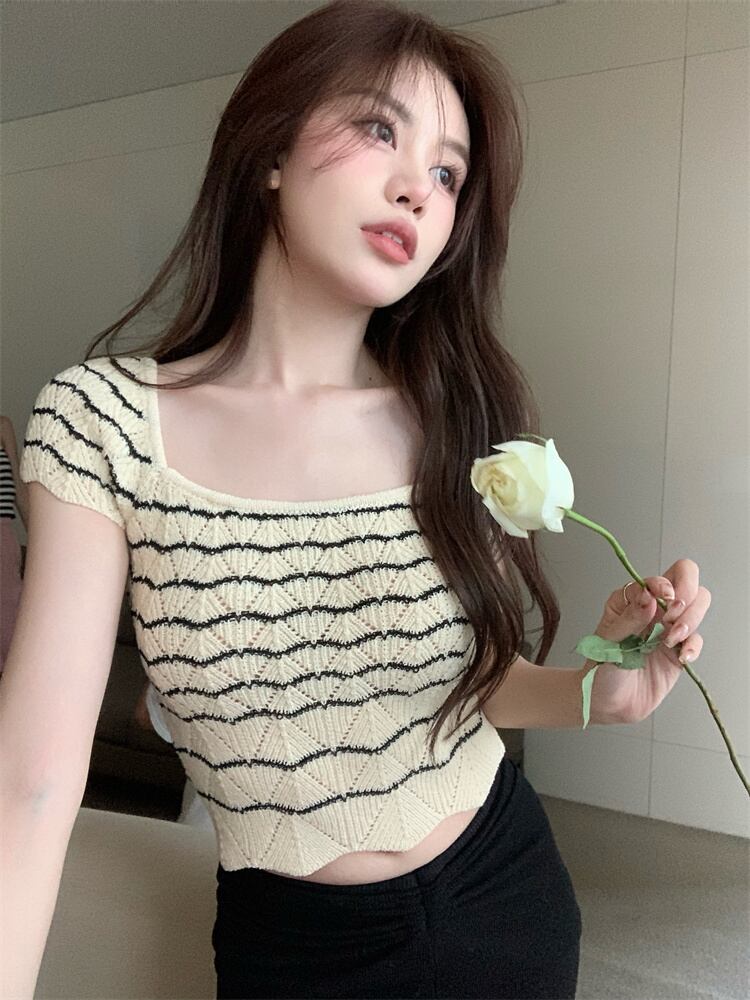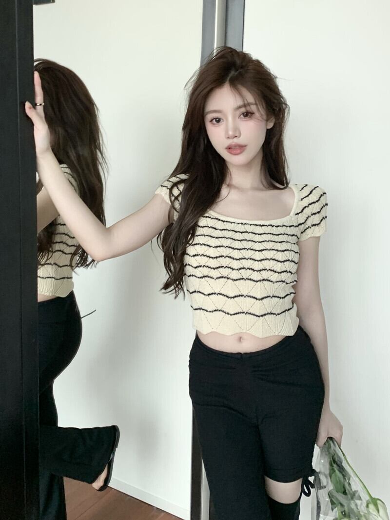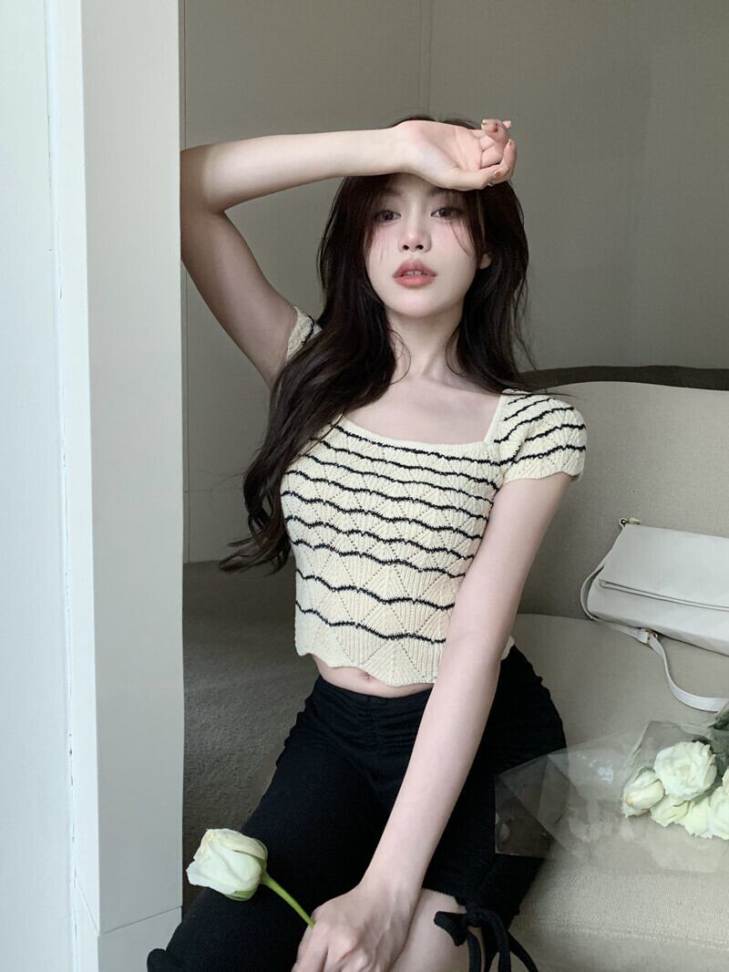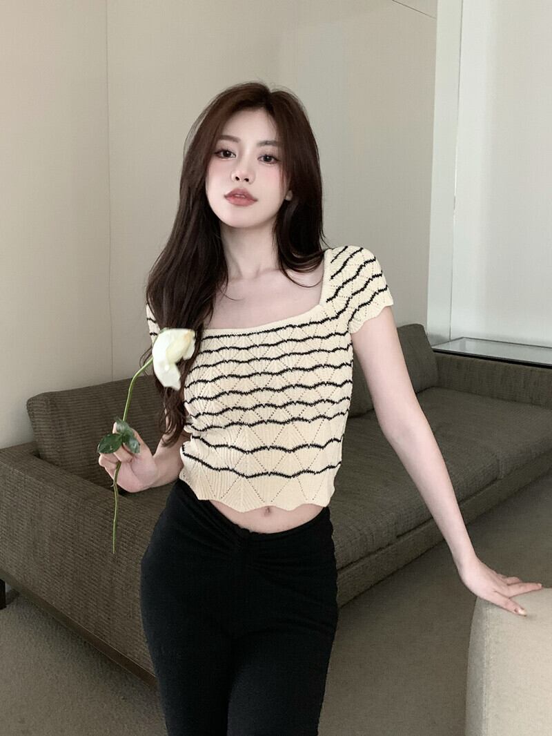 アイスシルクニット半袖スクエアネックレトロTシャツレディースストライプトップデザインハイウエストショートローネックサマードレス 夏物 スクウェア 7460033972187522 | framboise21