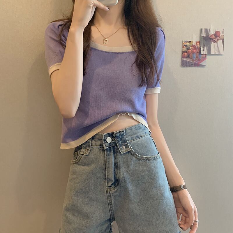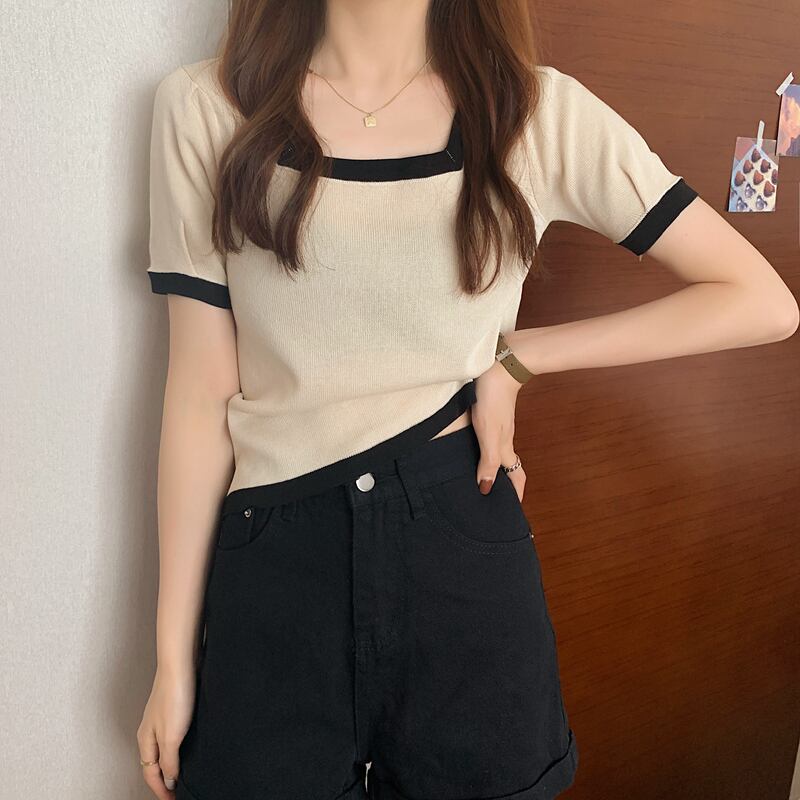 夏の女性ネットセレブヒョンヤスタイルブラックスクエアネックオールマッチ薄手ニットセーターTシャツ半袖アイスシルクボトミングトップトレンディ サマー 夏物 スクウェア 7460085887449176 | framboise21