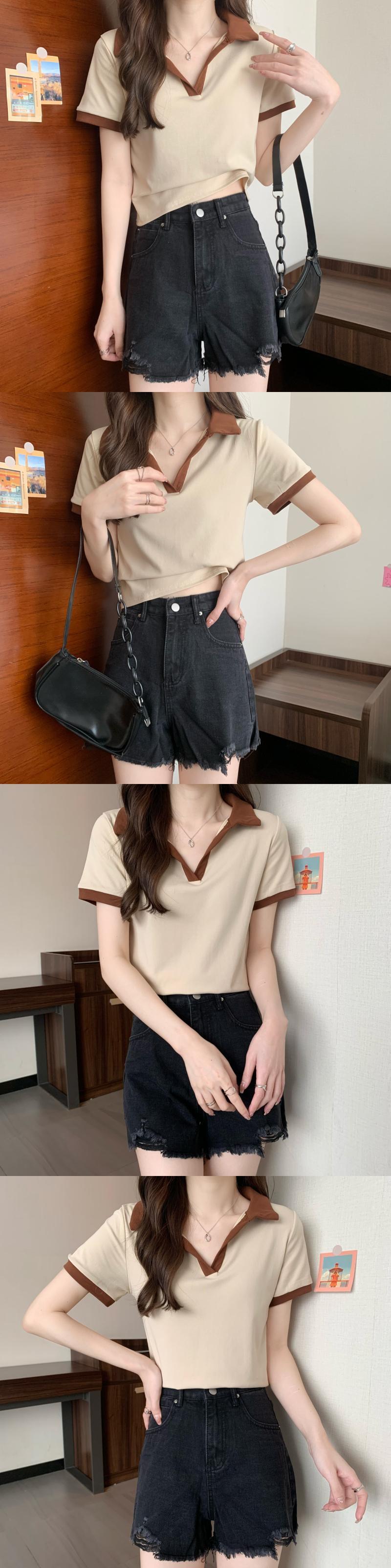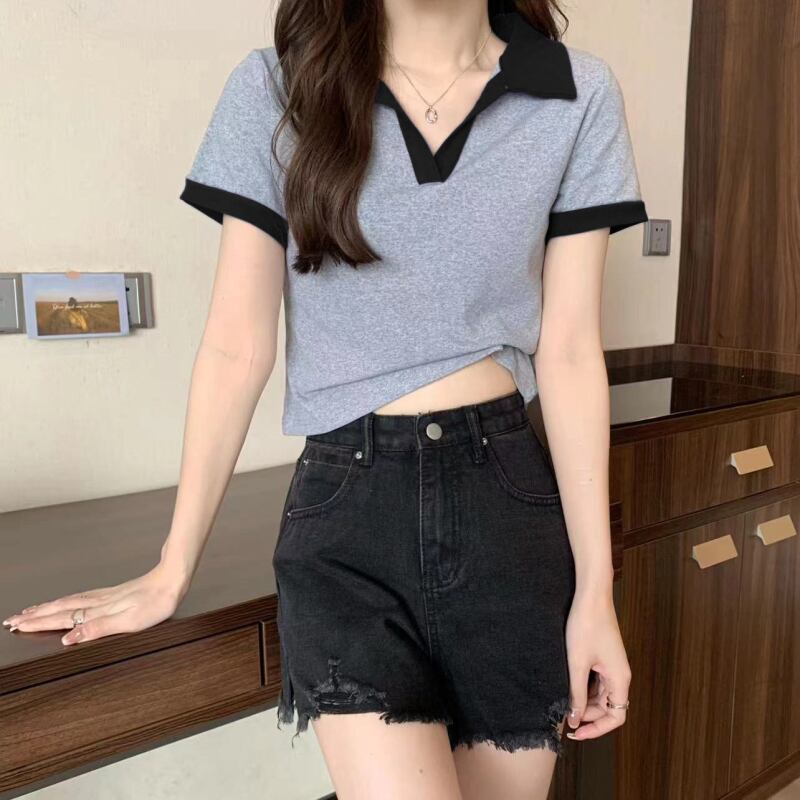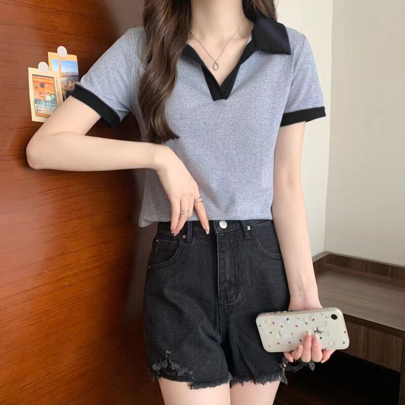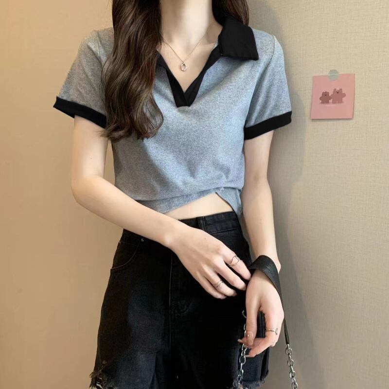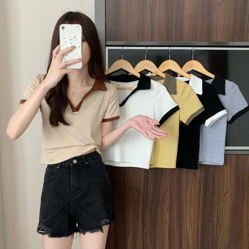 コントラストカラーのポロシャツ半袖Tシャツ2022年夏の新作ウエスタンスタイルカードウエストスモールシャツラペルショルダーショートトップ サマー 夏物 7460053556593154 | framboise21
