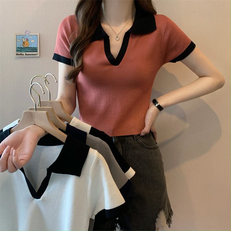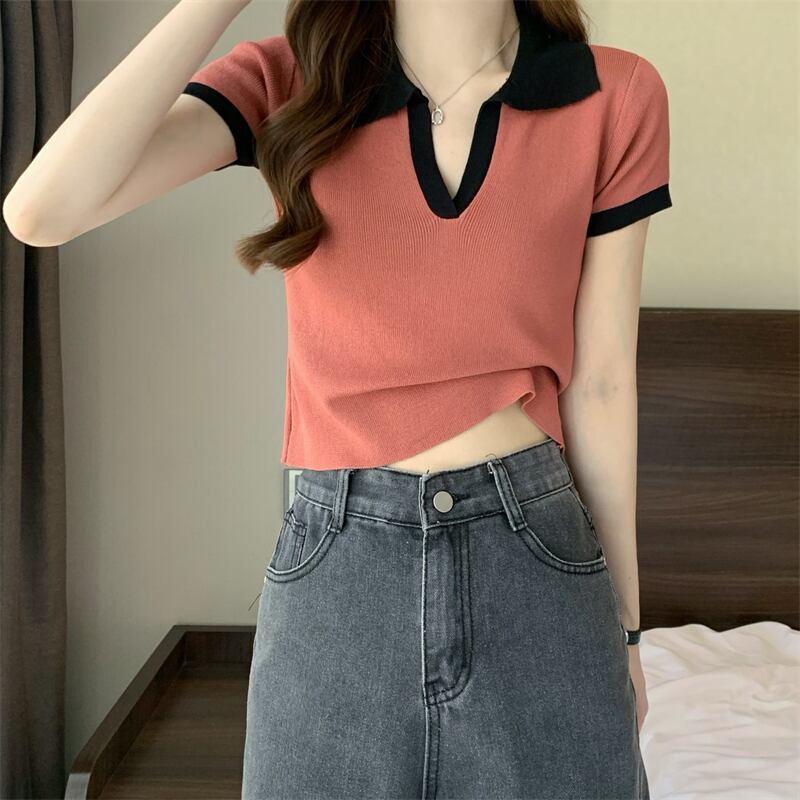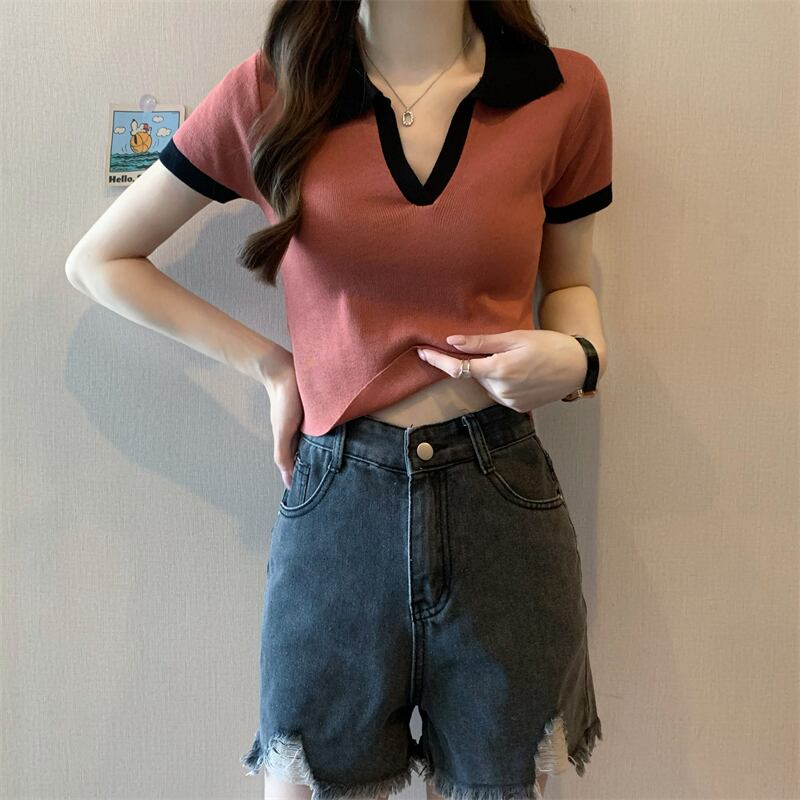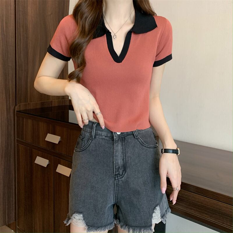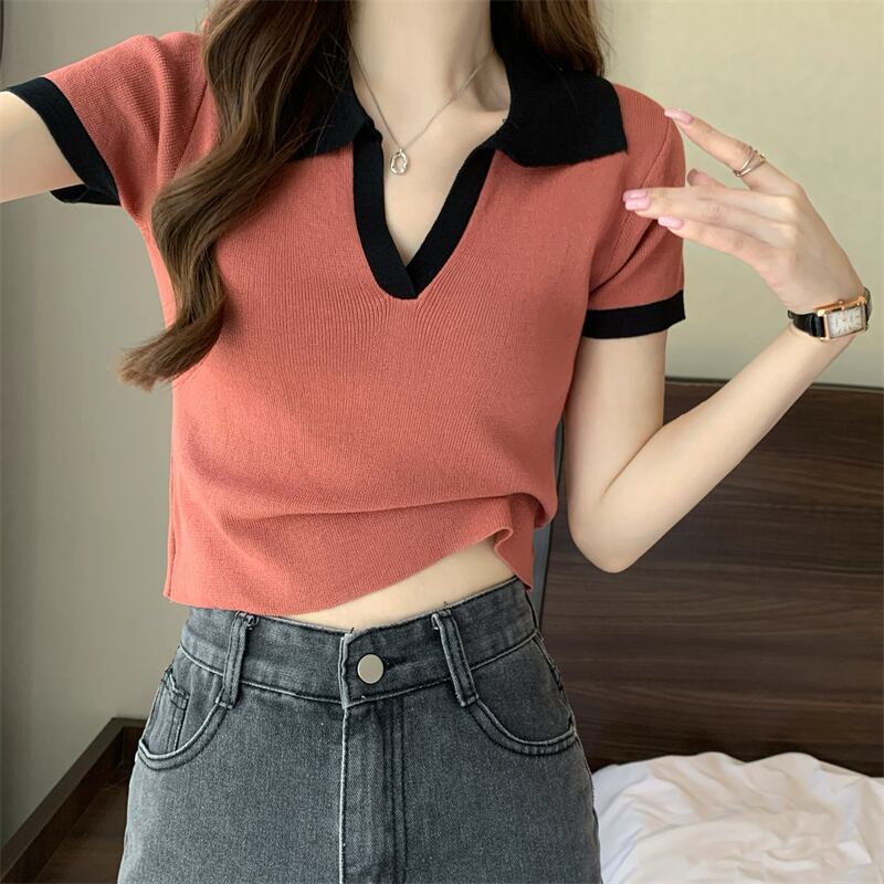 アイスシルク半袖フロントショルダーTシャツレディースサマーフレンチシックスモールポロシャツVネック個性的なハイウエストスリムショートトップ ハイウェスト 夏物 7460065559705447 | framboise21