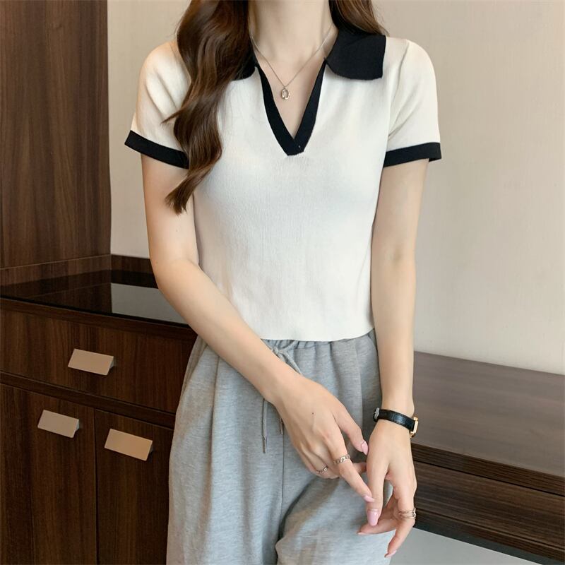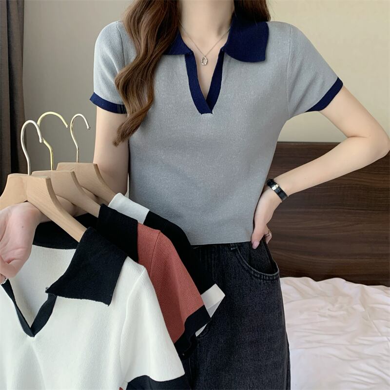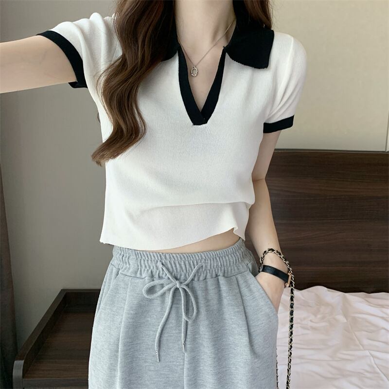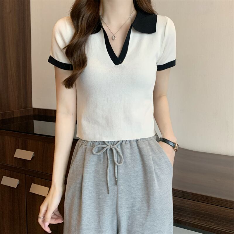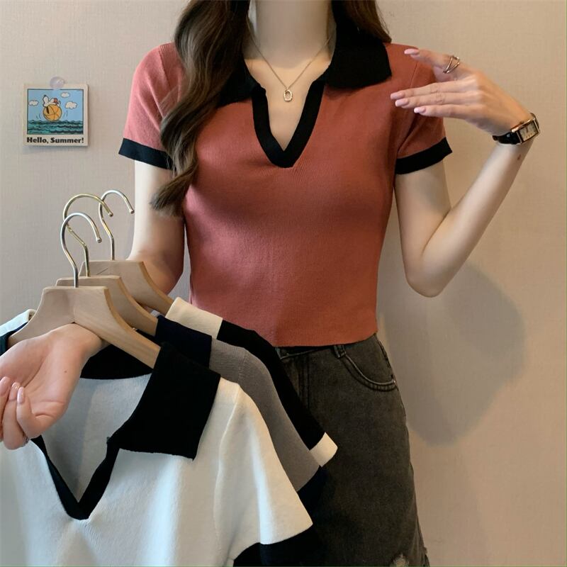 アイスシルク半袖フロントショルダーTシャツレディースサマーフレンチシックスモールポロシャツVネック個性的なハイウエストスリムショートトップ ハイウェスト 夏物 7460065559705447 | framboise21