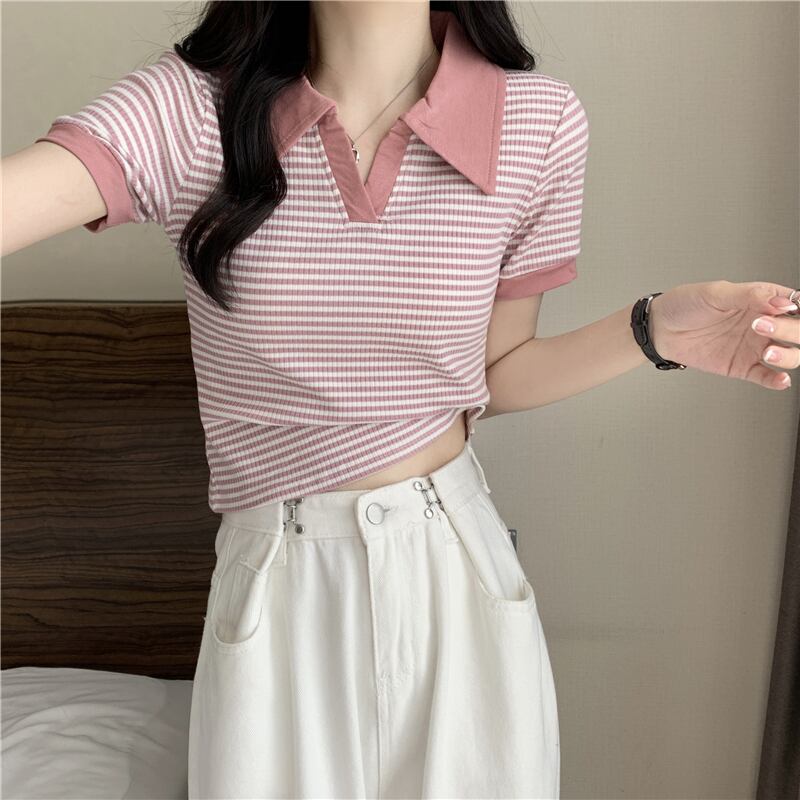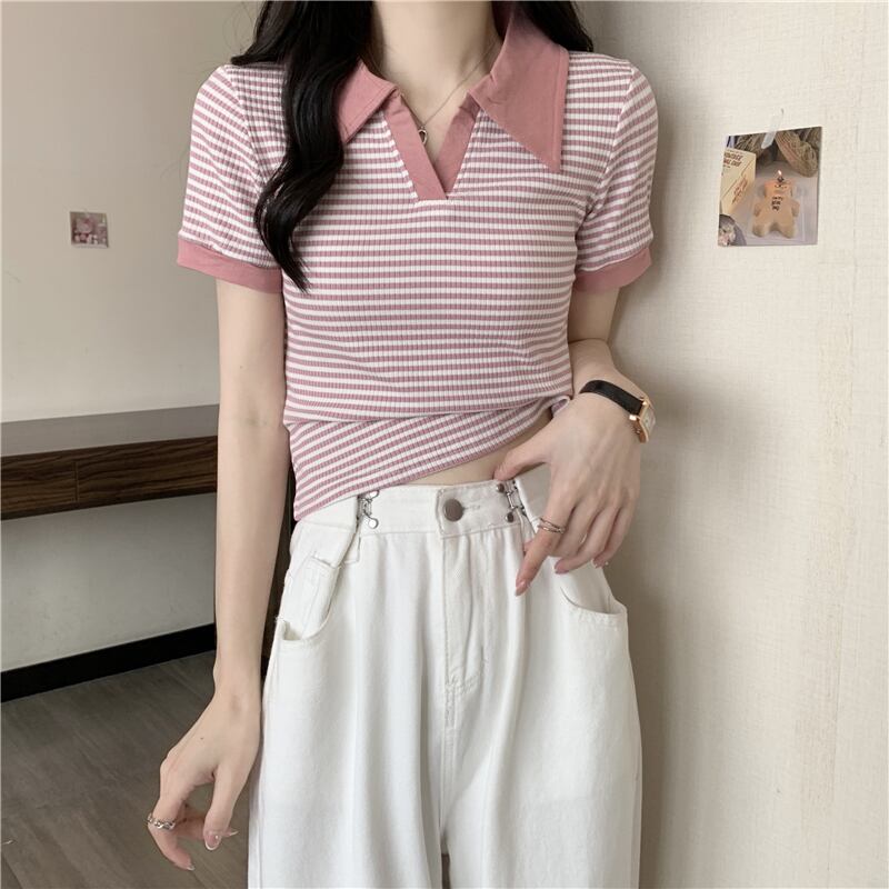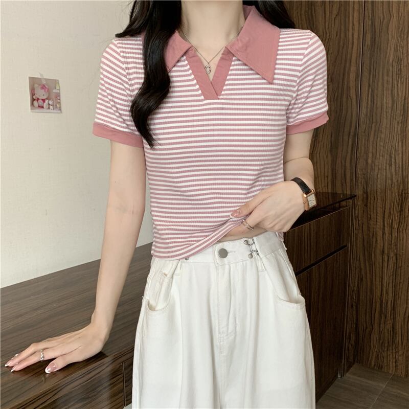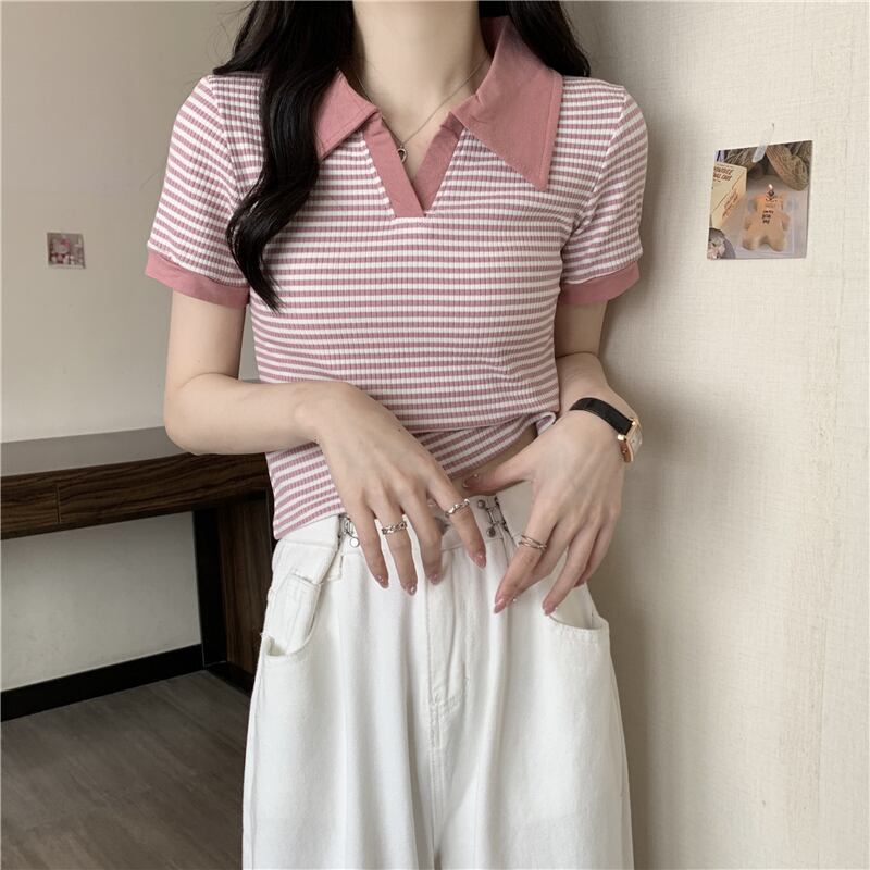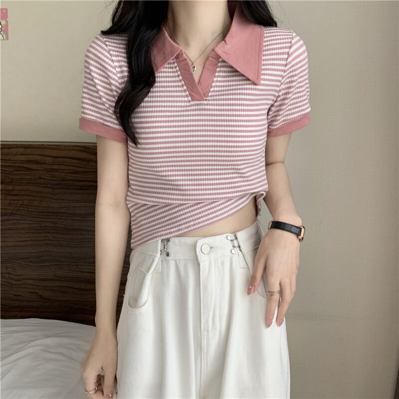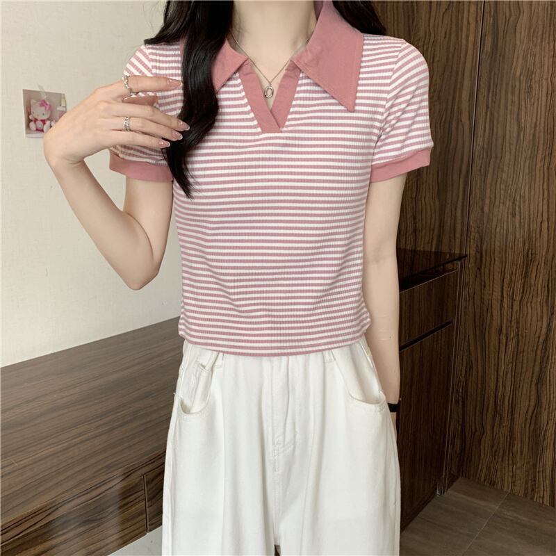 ピンクストライプ半袖ポロカラーニットTシャツレディースフロントショルダーサマースモールアイスシルクピュアトップTシャツ ショート ハーフスリーブ 夏物 7460022077242236 | framboise21