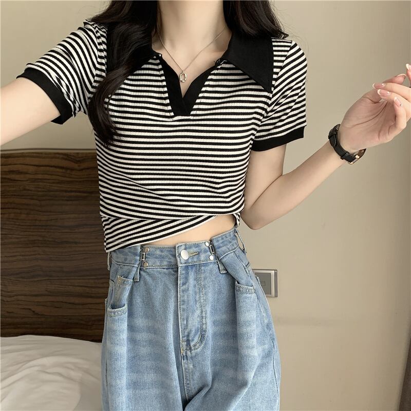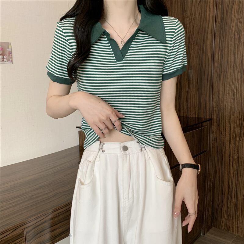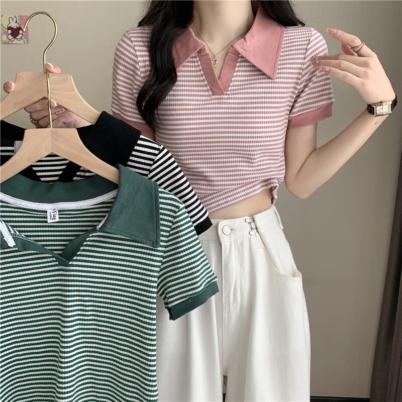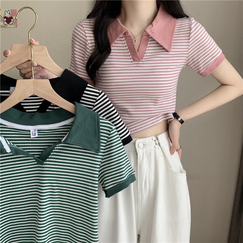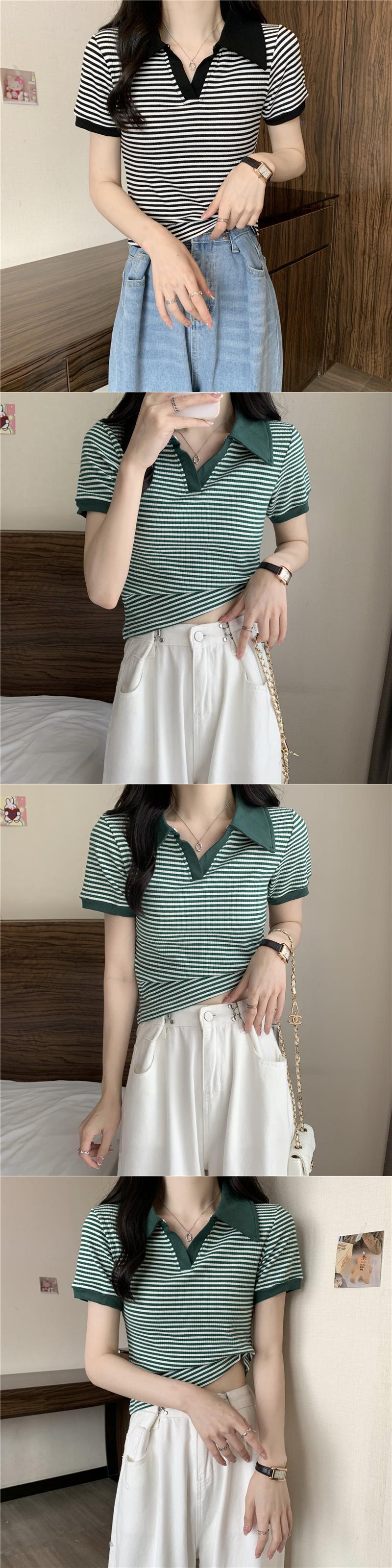 ピンクストライプ半袖ポロカラーニットTシャツレディースフロントショルダーサマースモールアイスシルクピュアトップTシャツ ショート ハーフスリーブ 夏物 7460022077242236 | framboise21