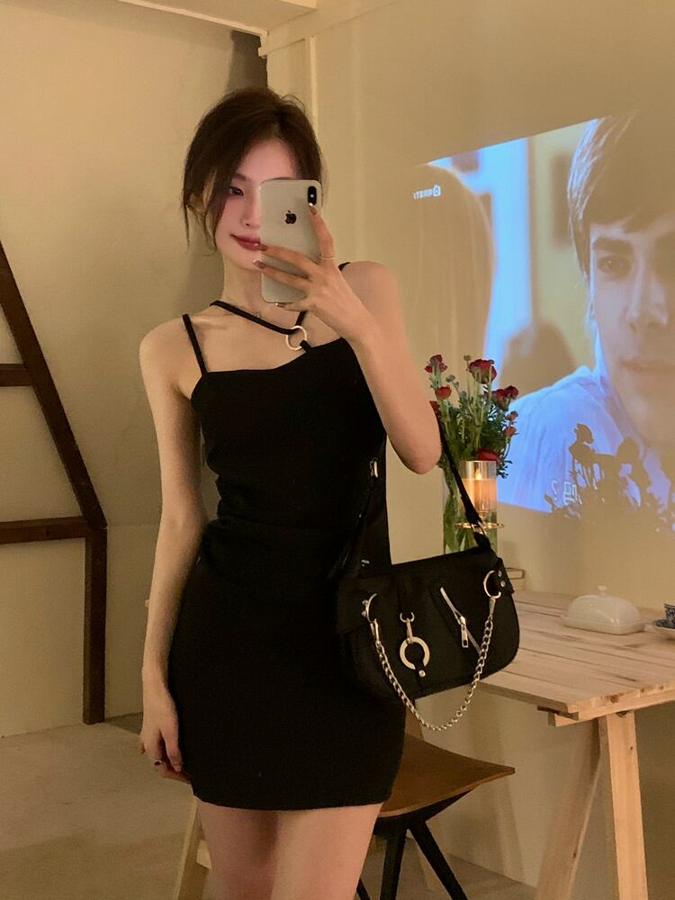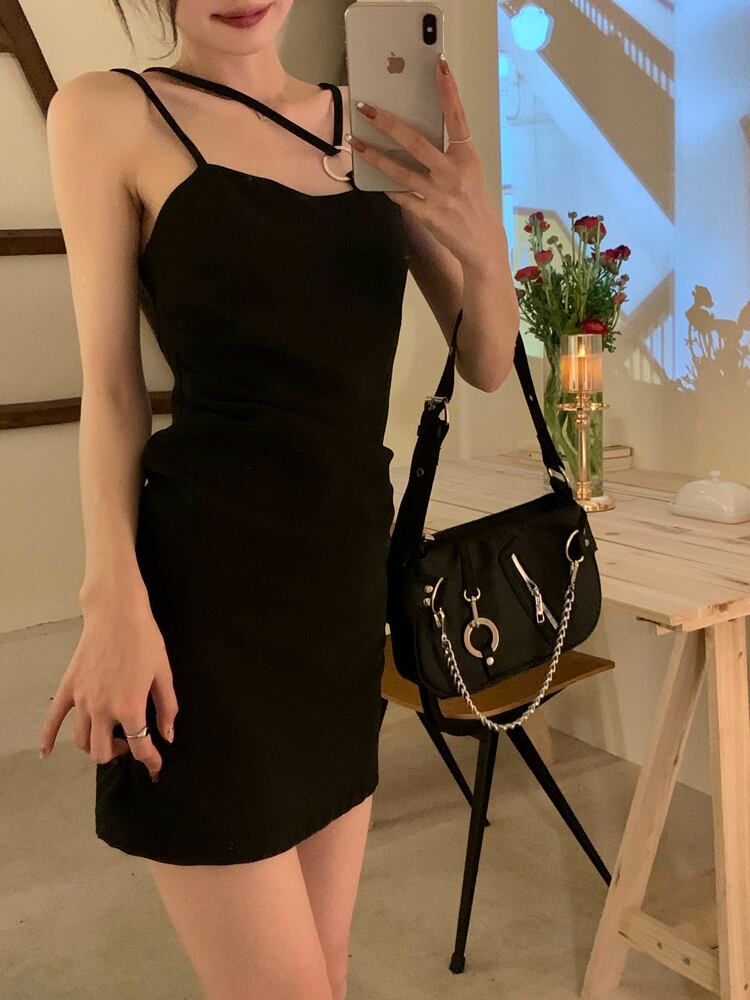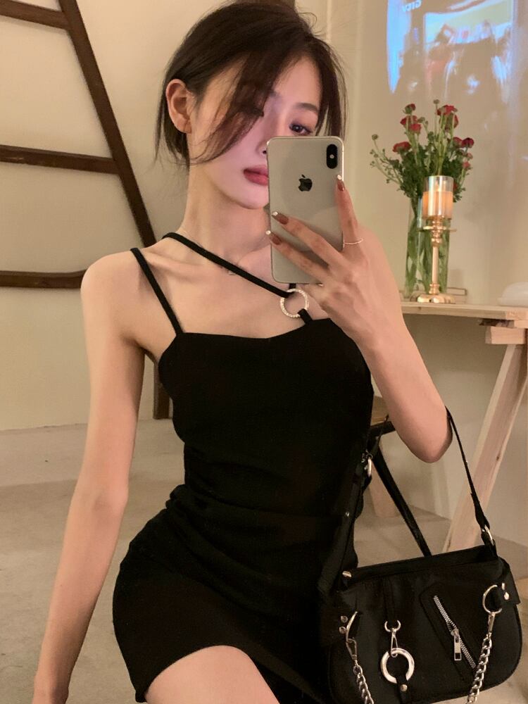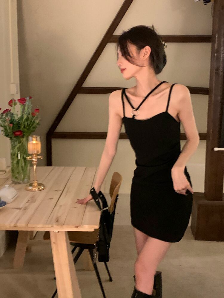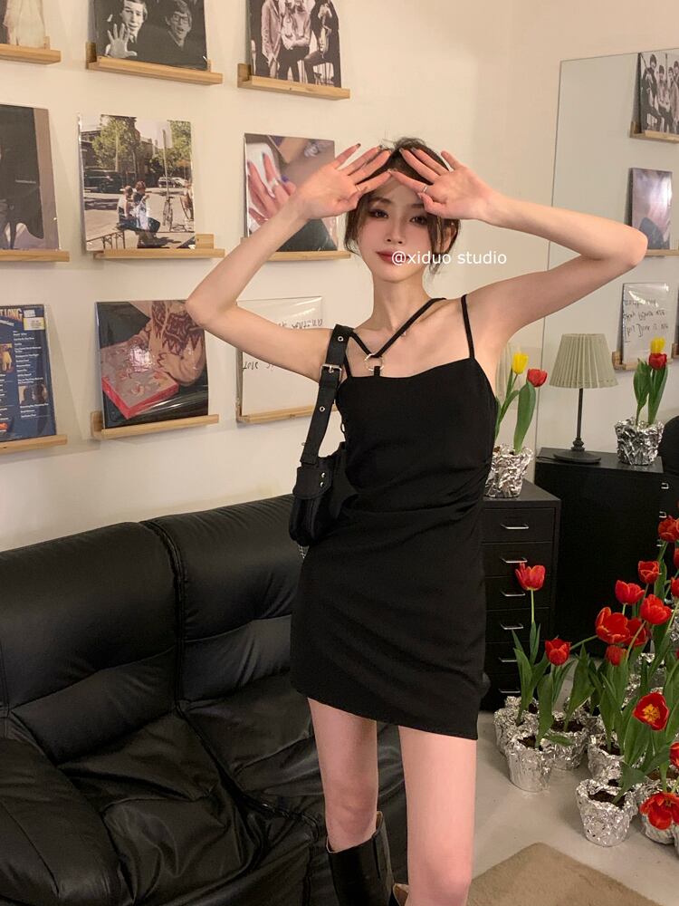 洋風ファッションの夏のデザインセンス純粋な欲望風甘いラウンドバックルサスペンダースカートプリーツウエスト黒ドレス女性 ブラック 大人ガーリー スウィート キュート カジュアル サマー 夏物 ピュア 746004434915261 | framboise21