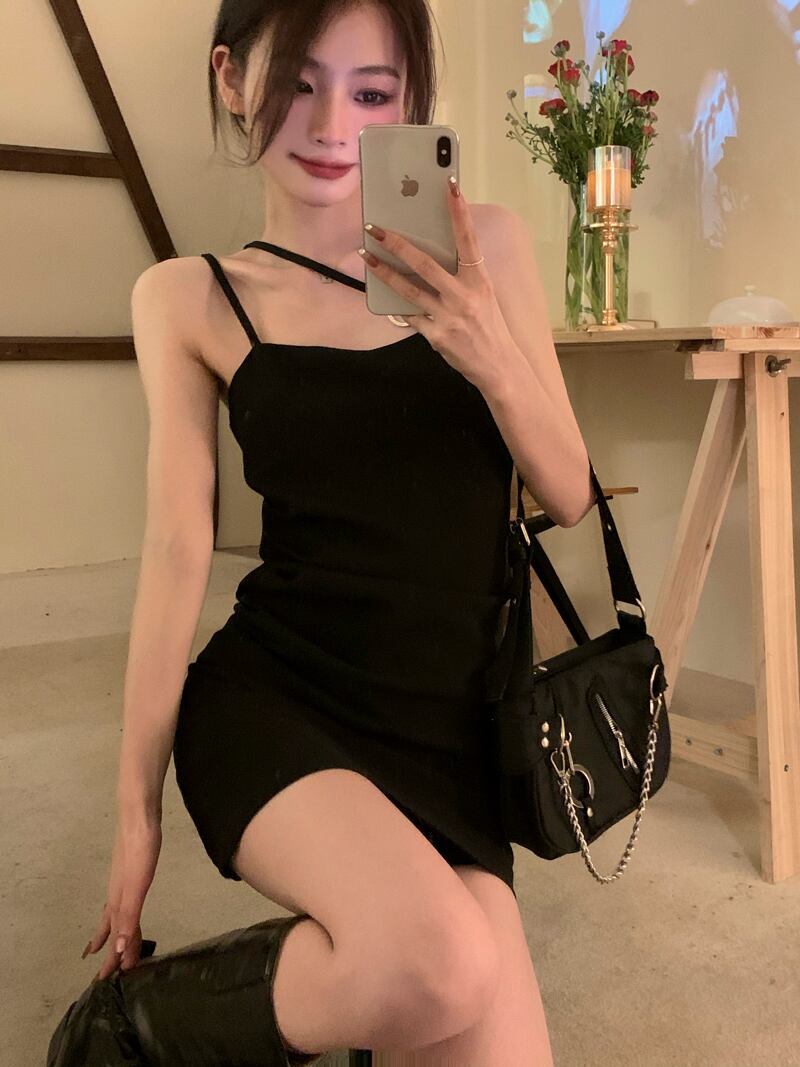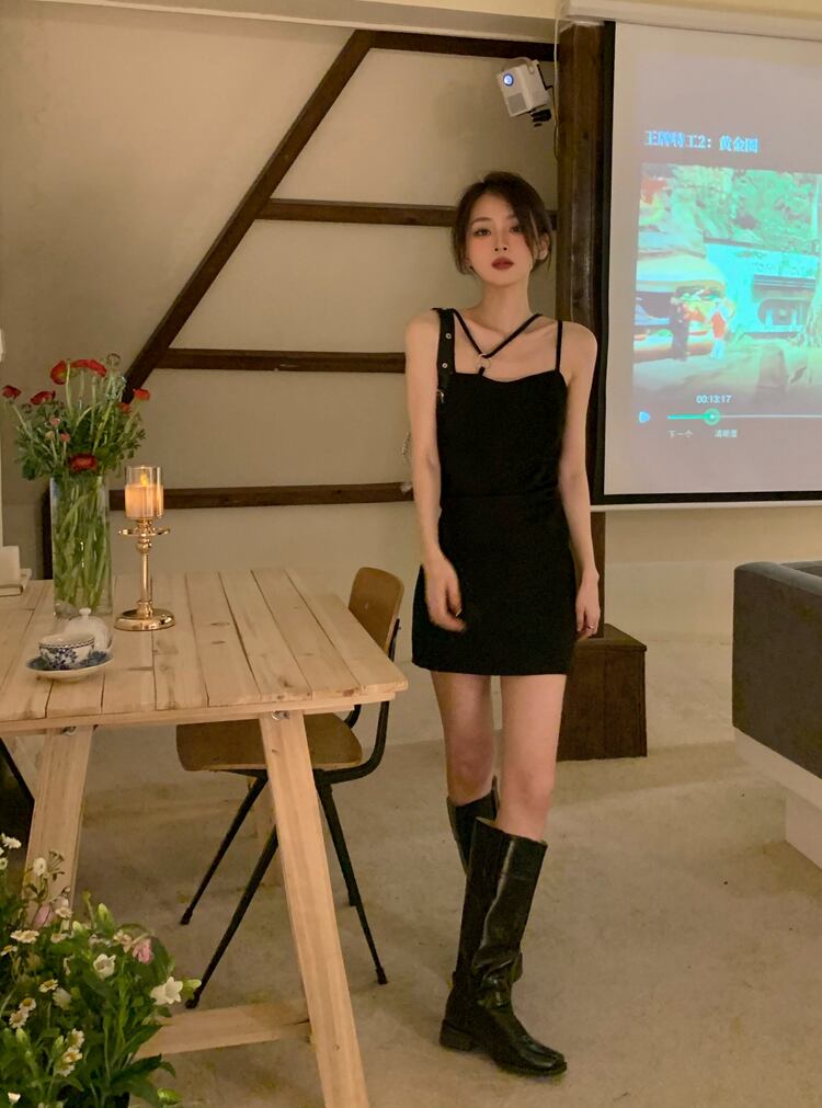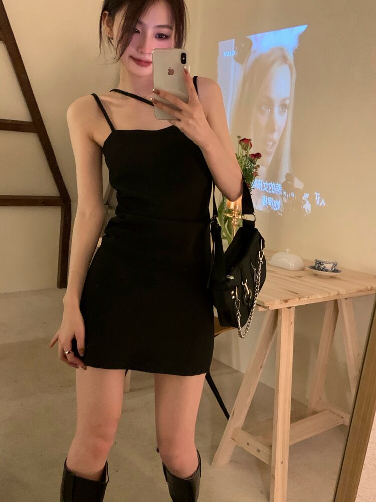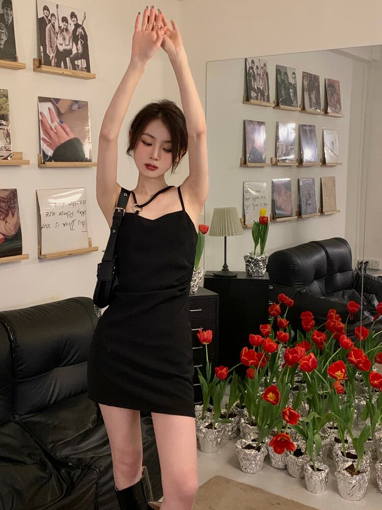洋風ファッションの夏のデザインセンス純粋な欲望風甘いラウンドバックルサスペンダースカートプリーツウエスト黒ドレス女性 ブラック 大人ガーリー スウィート キュート カジュアル サマー 夏物 ピュア 746004434915261 | framboise21