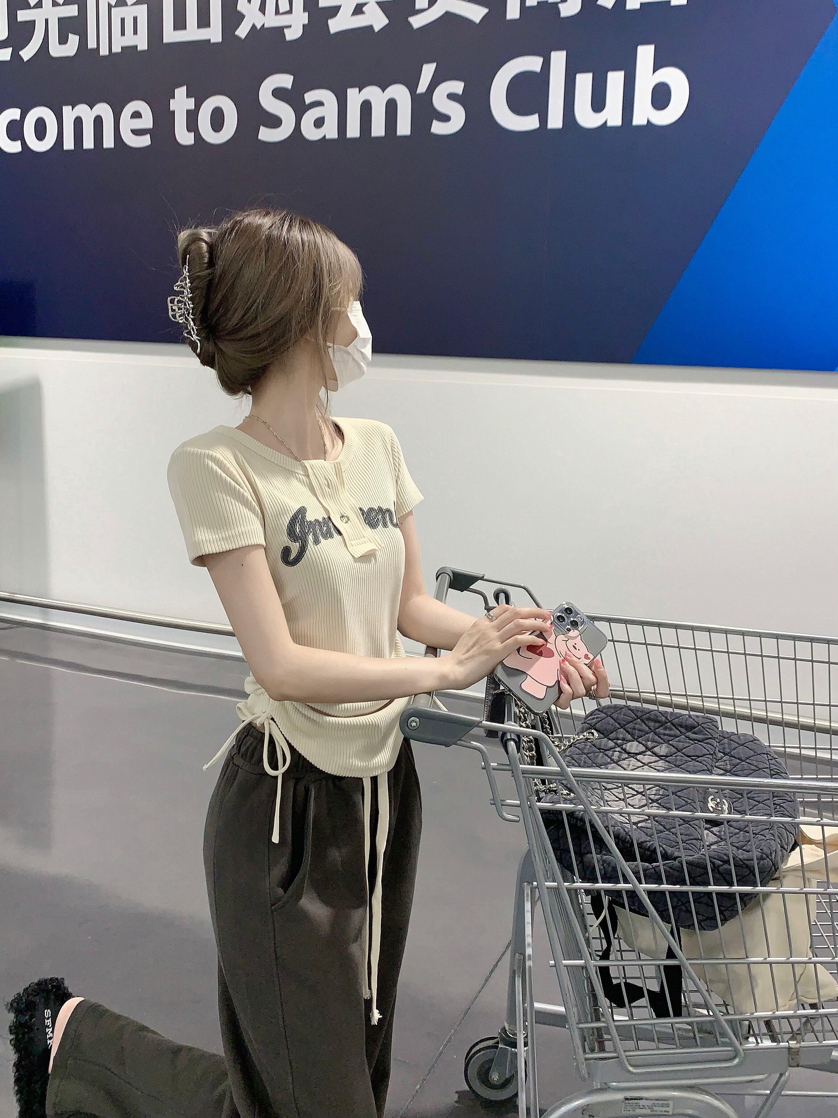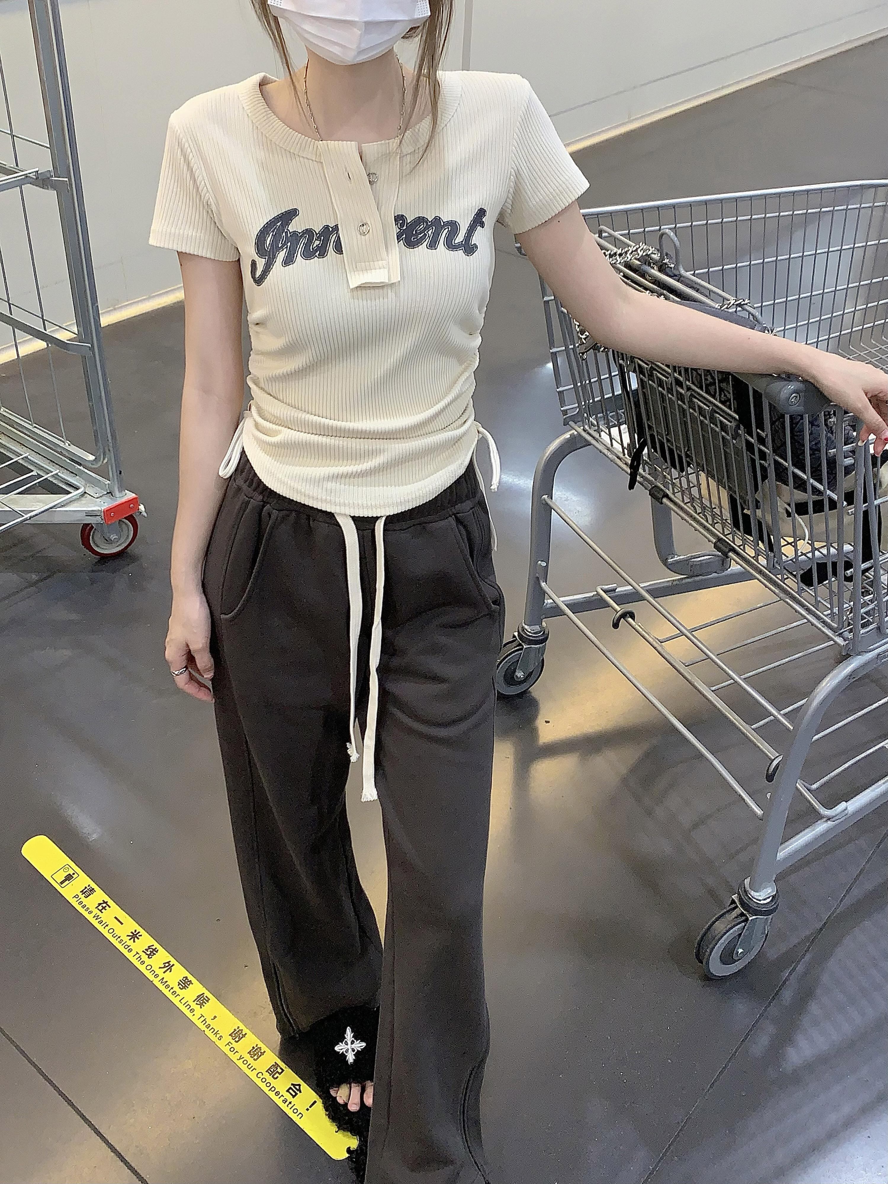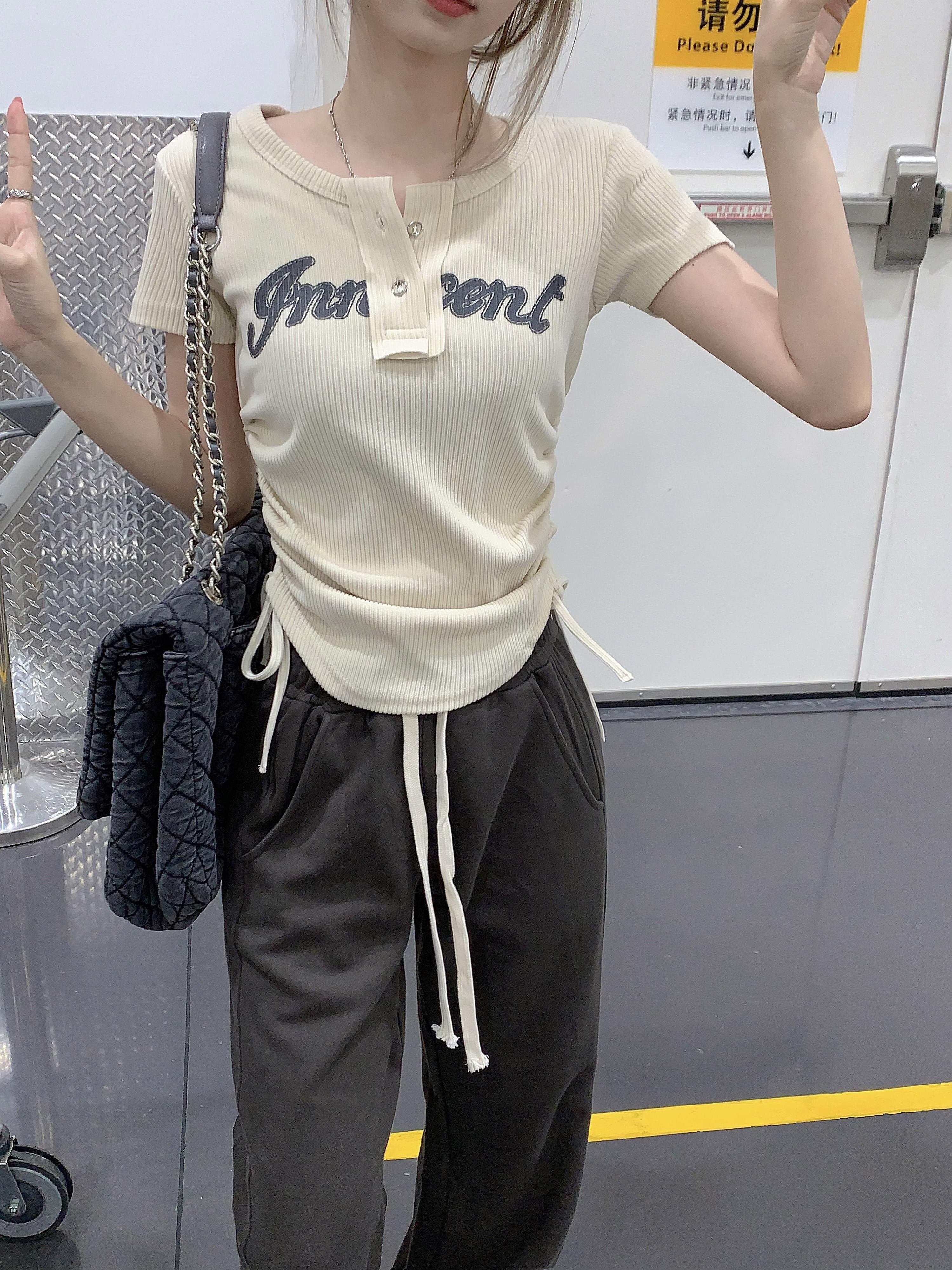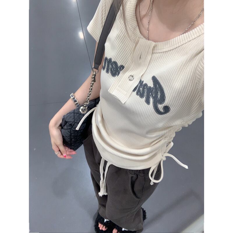 ウエストショートトップレディース夏2022年ニューネットレッドアメリカンデザインスモールドローストリングフロントショルダー半袖Tシャツ ハーフスリーブ サマー 夏物 7460046759701491 | framboise21