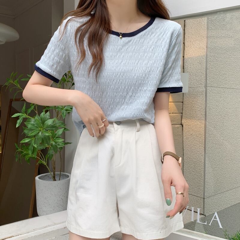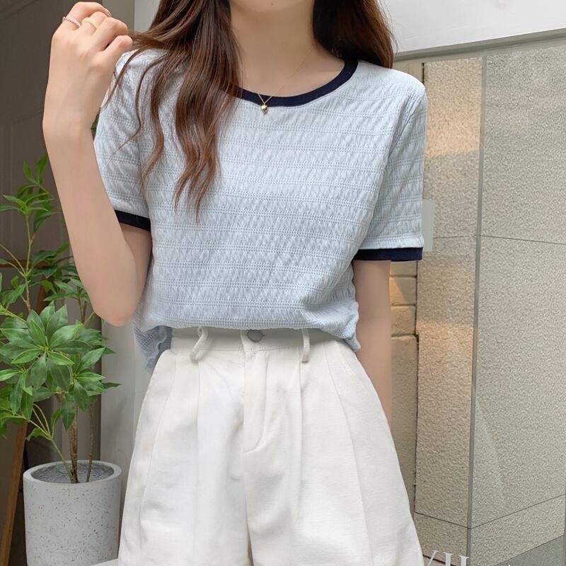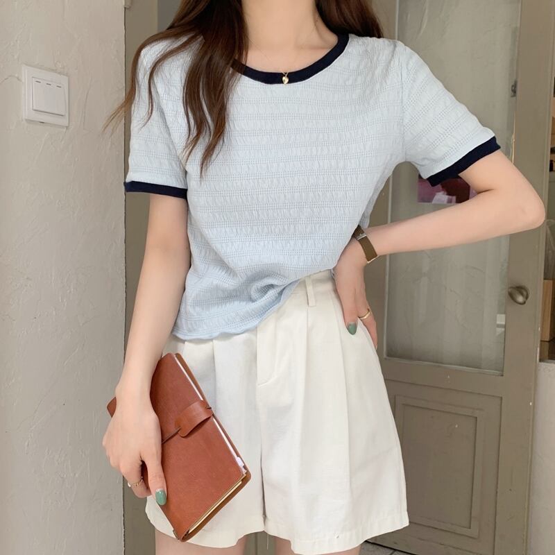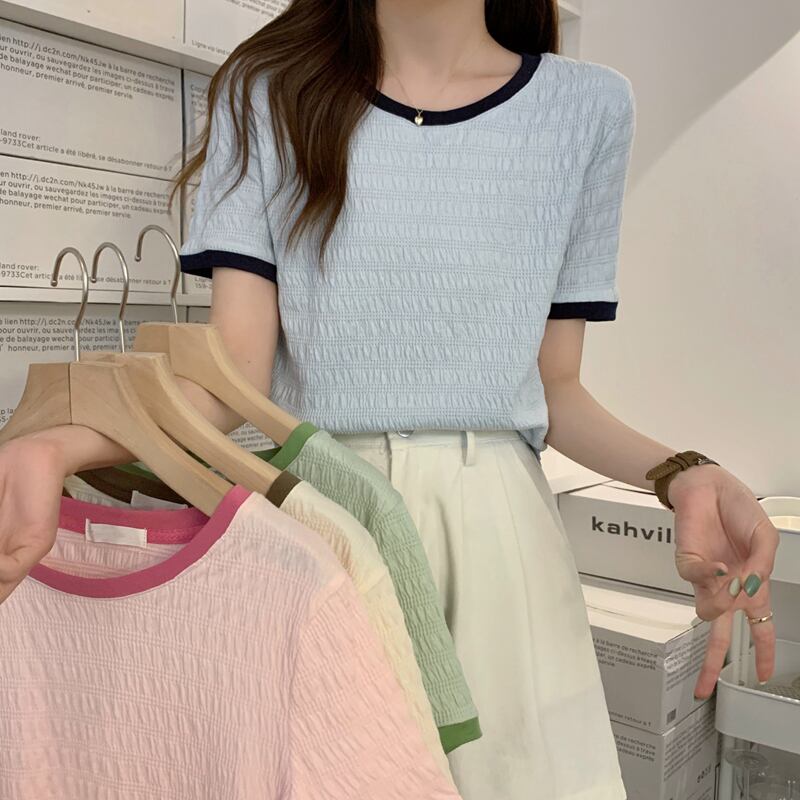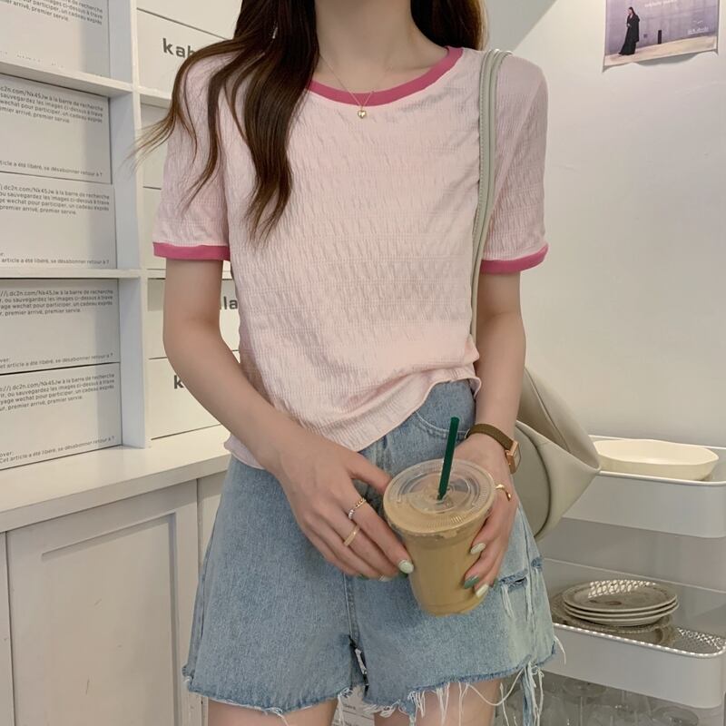 半袖フロントショルダーTシャツレディースサマーデザインセンスニッチ菌エッジ細くシックなコントラストカラーラウンドネックショートトップシン 夏物 Oネック 7460086163321369 | framboise21