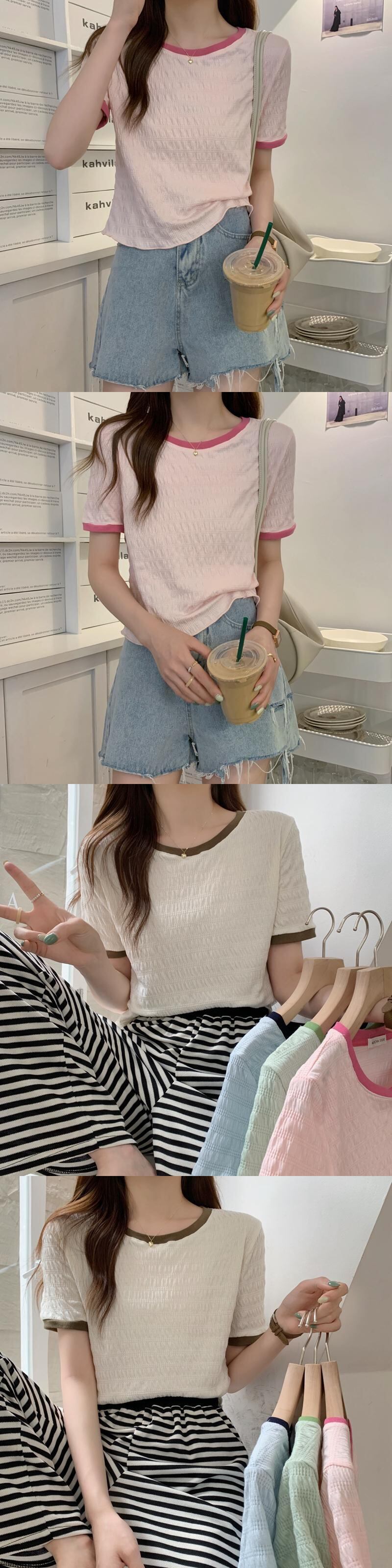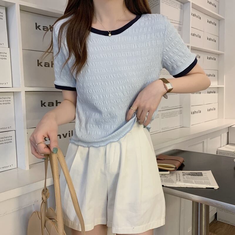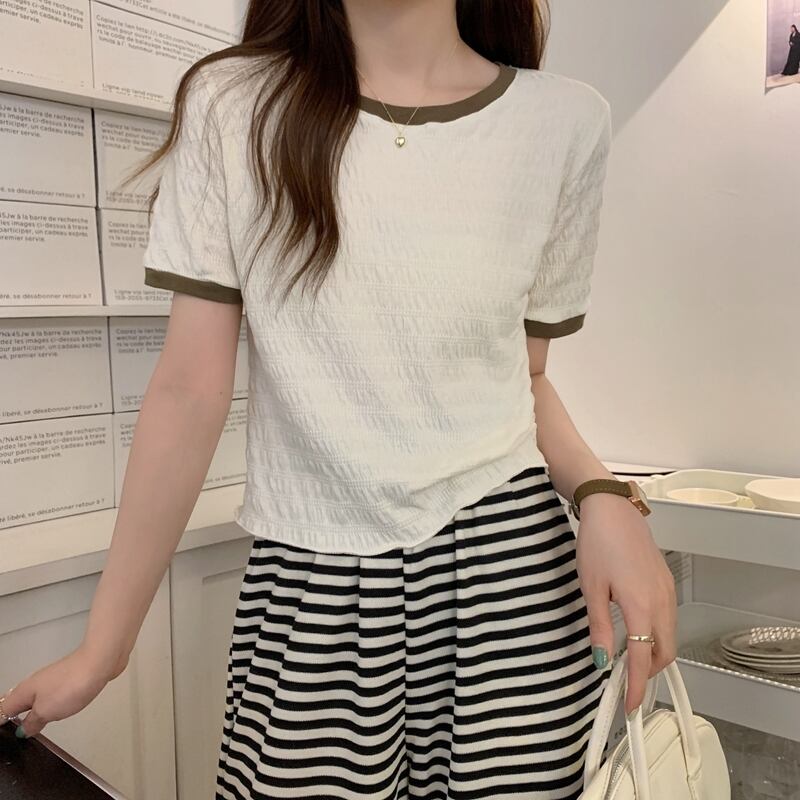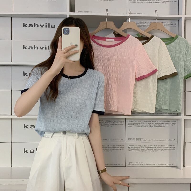 半袖フロントショルダーTシャツレディースサマーデザインセンスニッチ菌エッジ細くシックなコントラストカラーラウンドネックショートトップシン 夏物 Oネック 7460086163321369 | framboise21