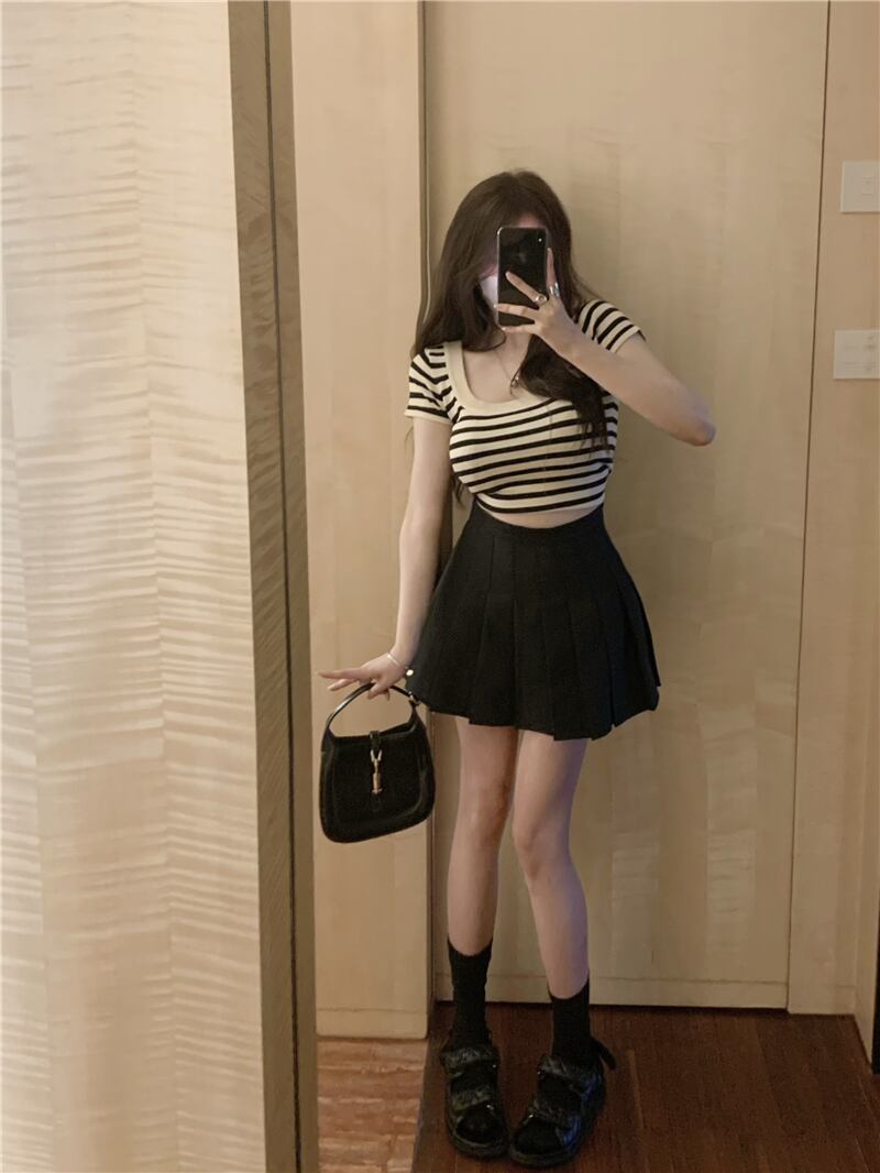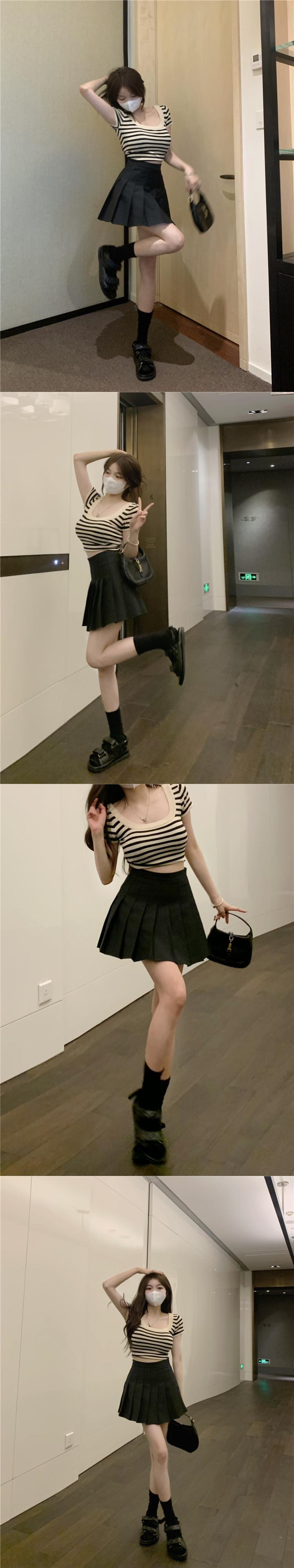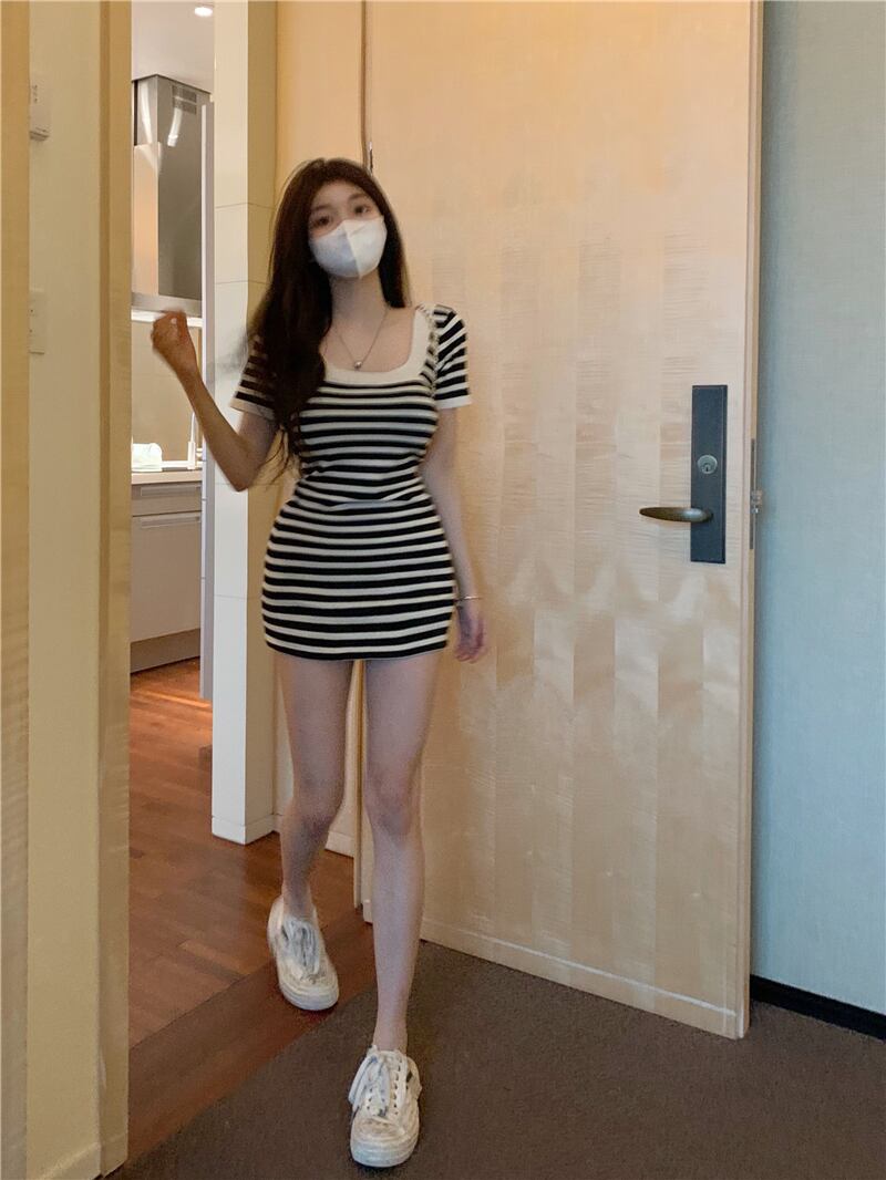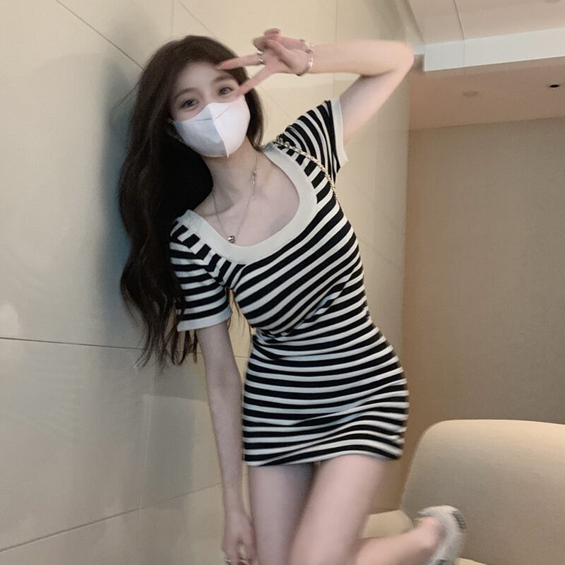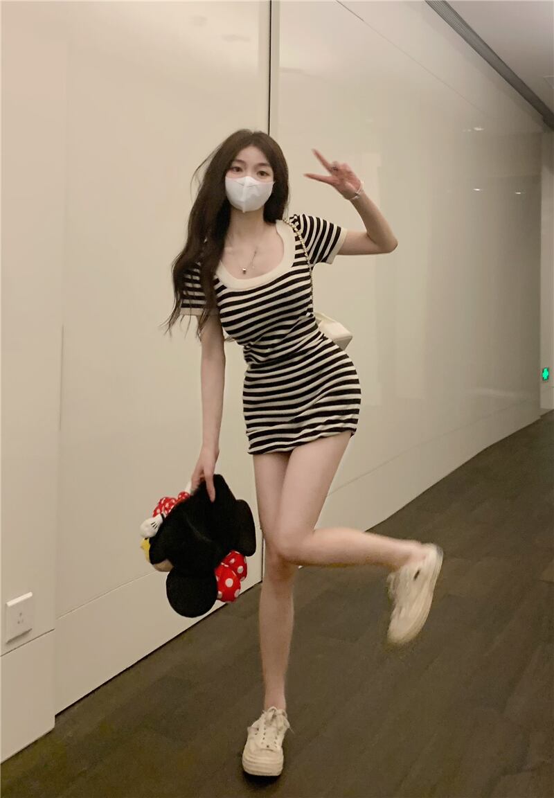 Uネックのセクシーなカラーブロックストライプ半袖ドレス女性の2022年夏のウエストとスリムなファッションバッグヒップスカート サマー 夏物 7460082456086908 | framboise21