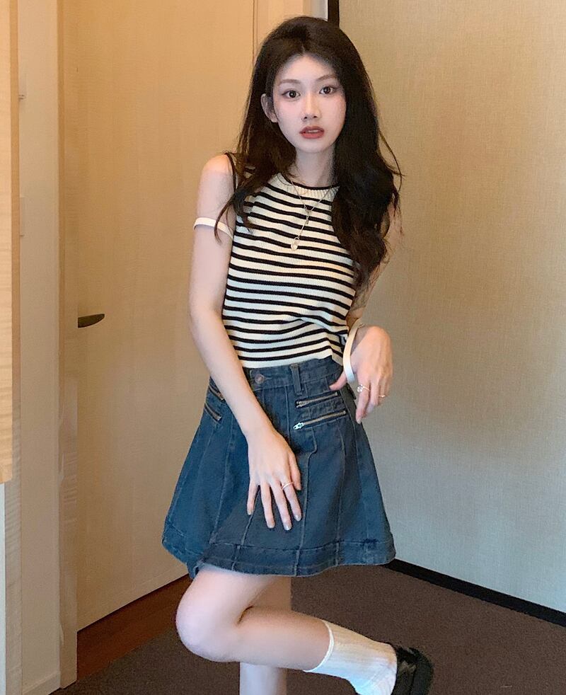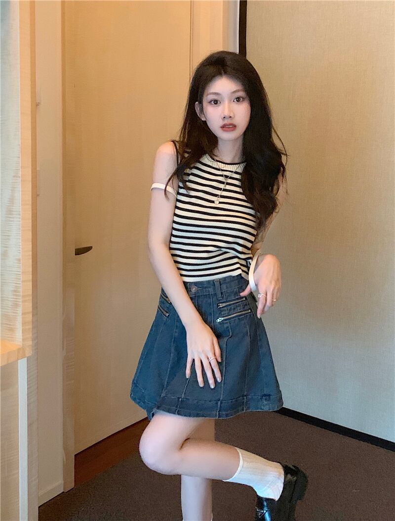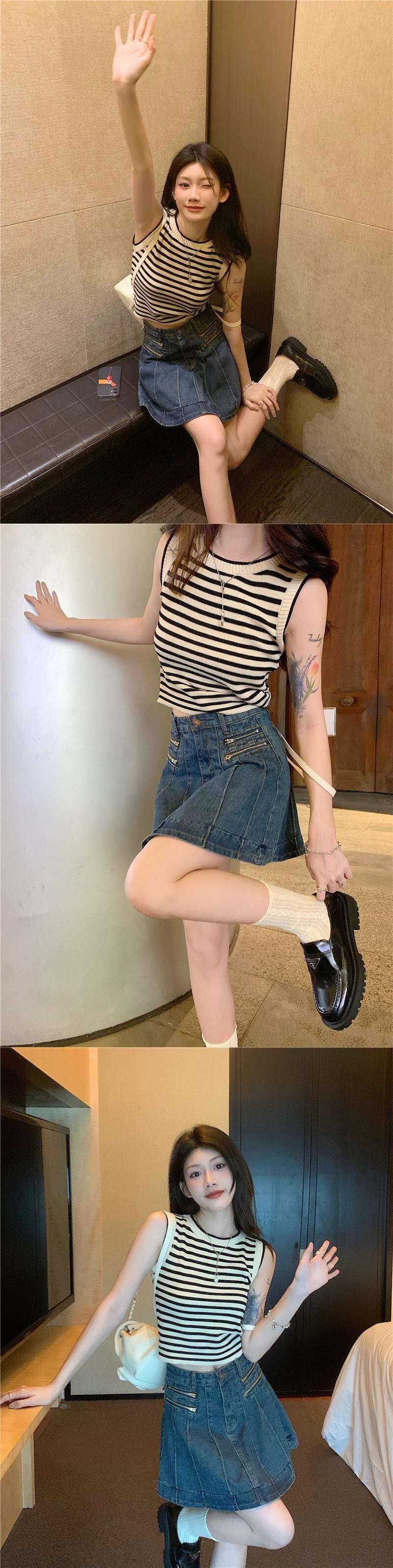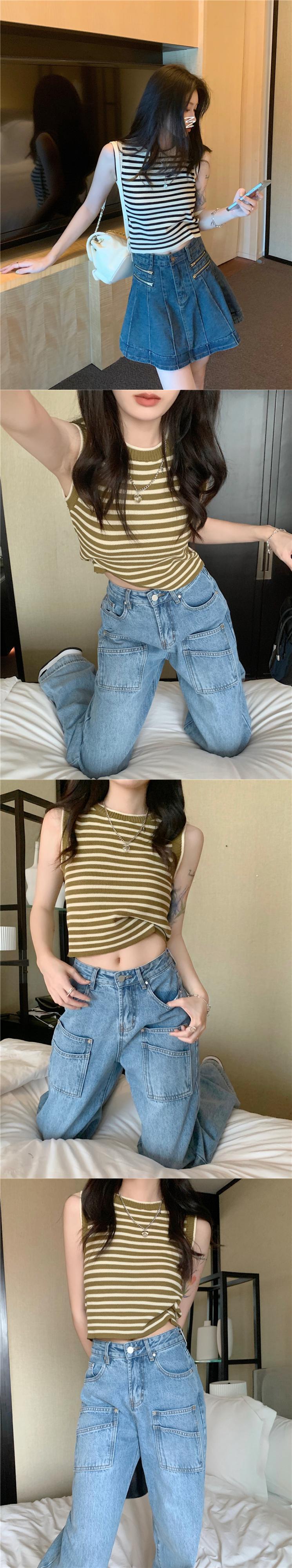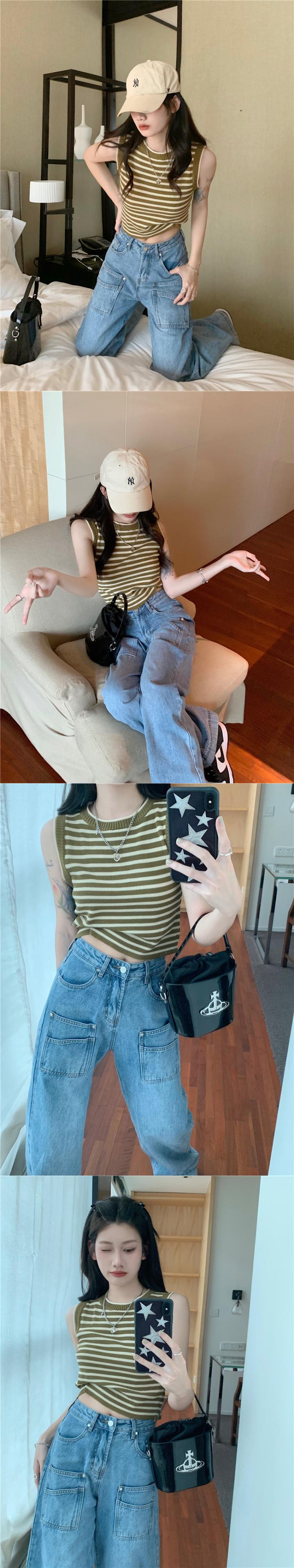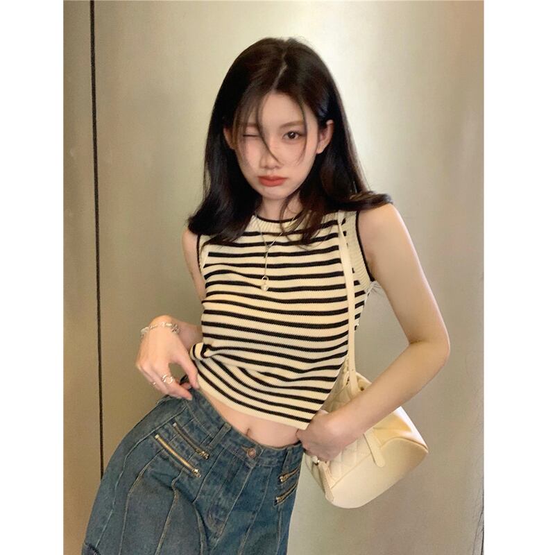 コントラストカラーのストライプワイドショルダーストラップキャミソールレディースサマーデザインニッチショートスタイルシックなノースリーブニットトップサマー 夏物 7460062153247779 | framboise21