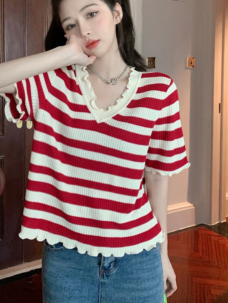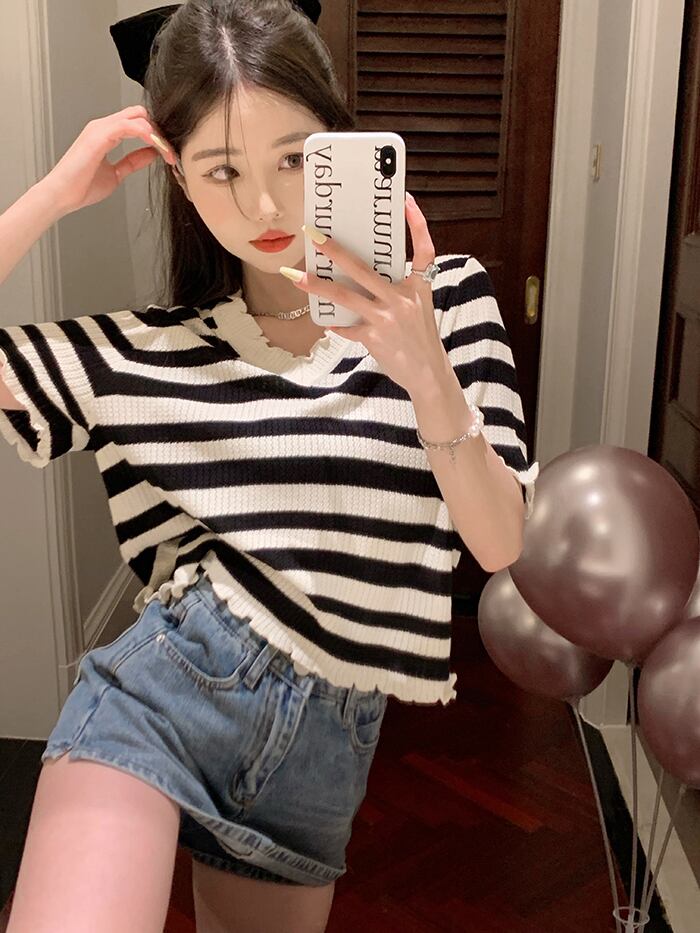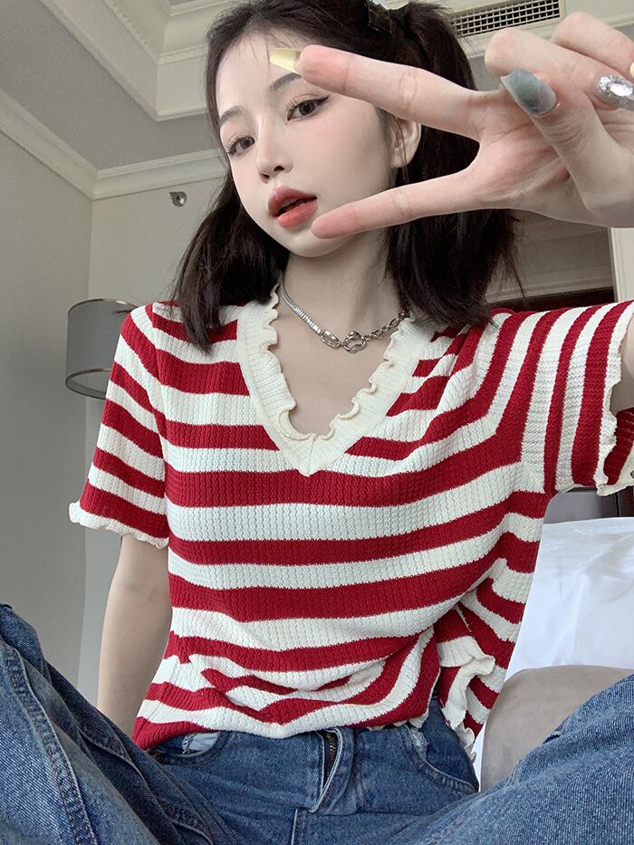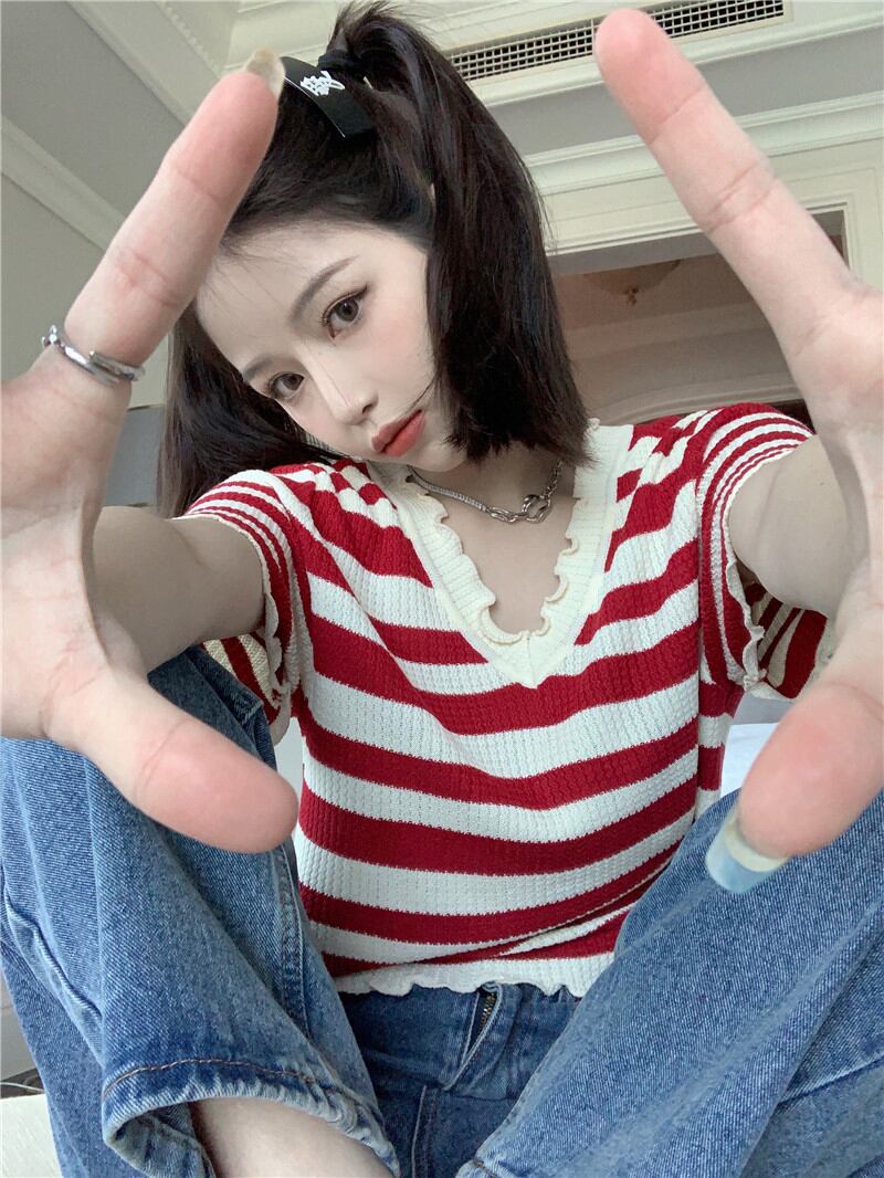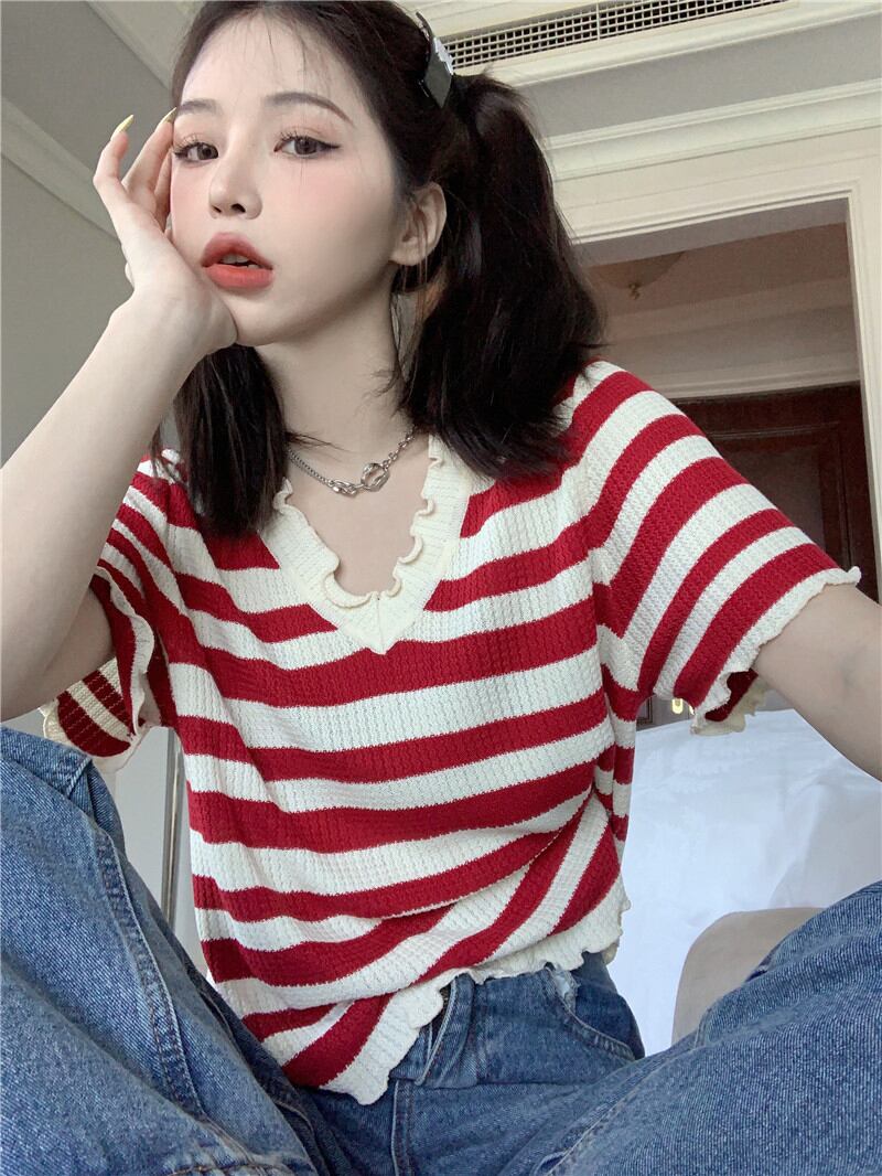 ファンガスエッジVネックニット半袖Tシャツニッチな夏の女性のルーズなオールマッチハイウエストショートフロントショルダーストライプトップトレンディ サマー 夏物 7460074242778048 | framboise21
