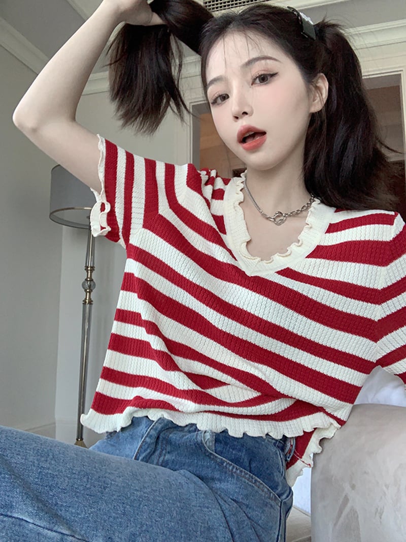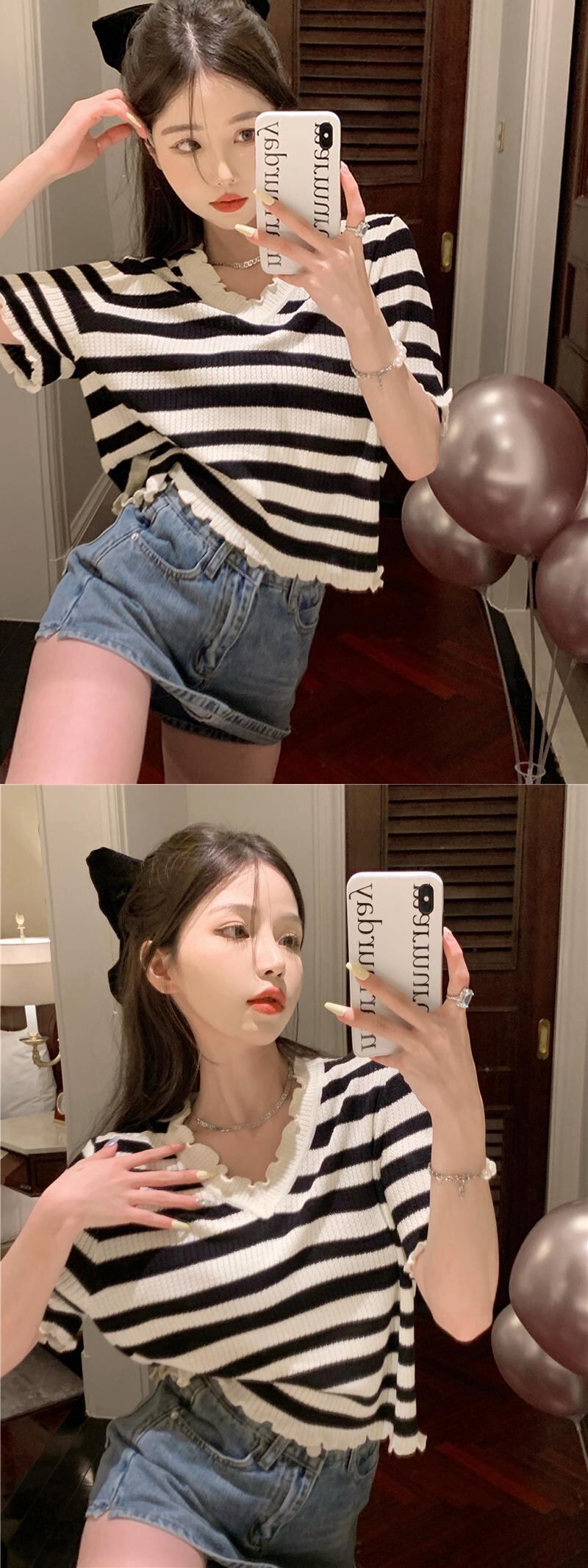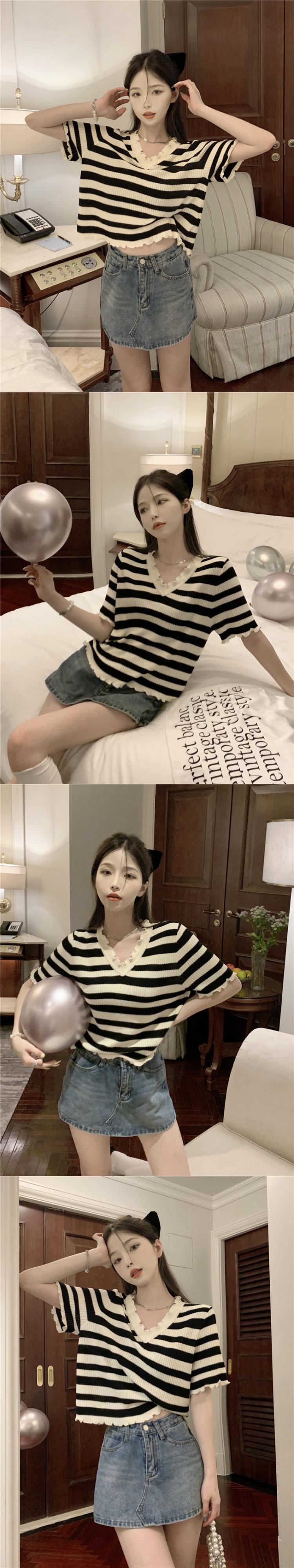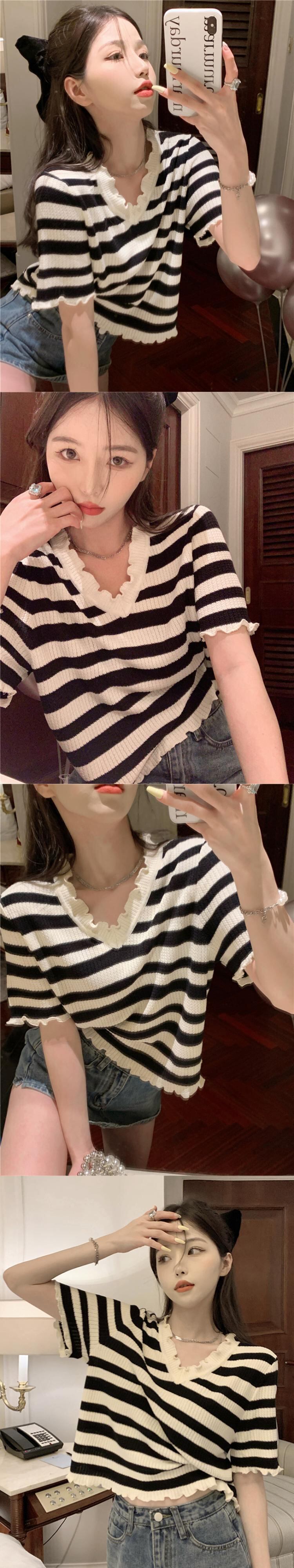 ファンガスエッジVネックニット半袖Tシャツニッチな夏の女性のルーズなオールマッチハイウエストショートフロントショルダーストライプトップトレンディ サマー 夏物 7460074242778048 | framboise21