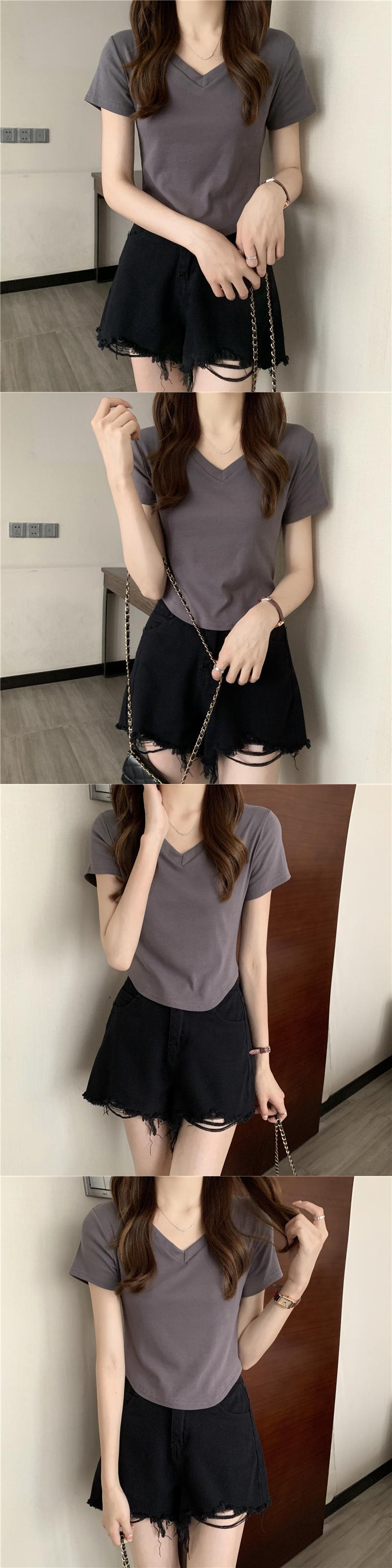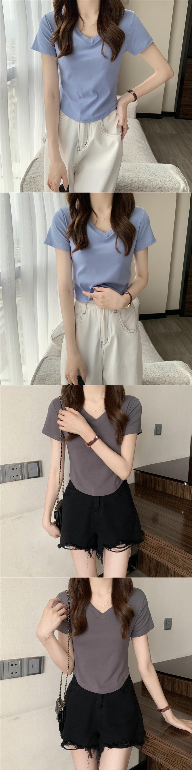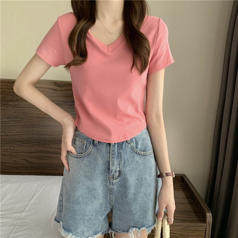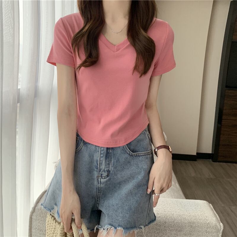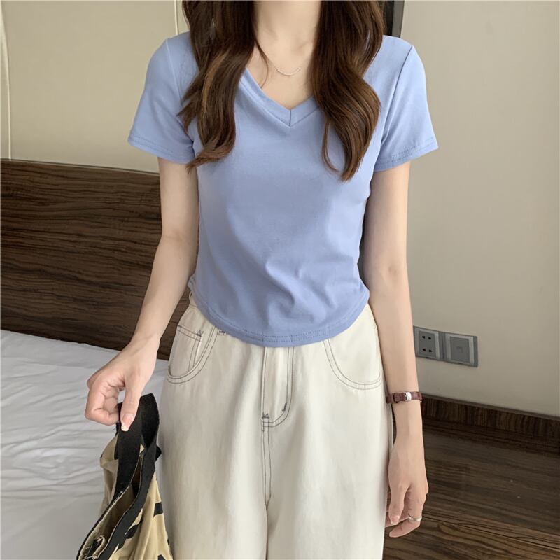 チキンハートVネックスリムフロントショルダー半袖Tシャツレディースサマーデザインニッチ裾アークショートスタイルピュアデザイーンウィンドトップ 夏物 7460012197835545 | framboise21