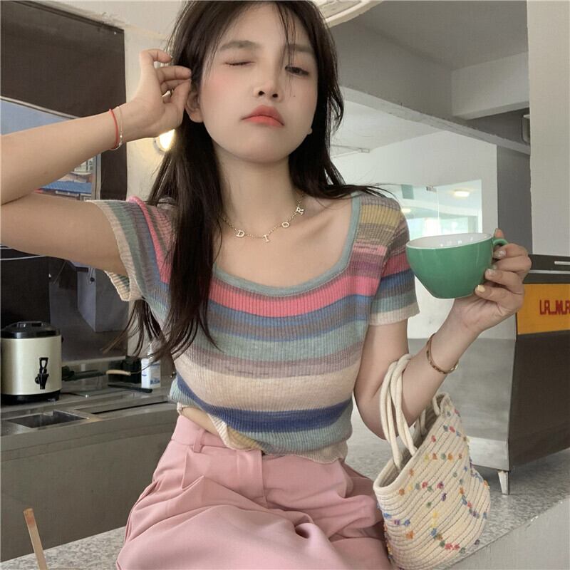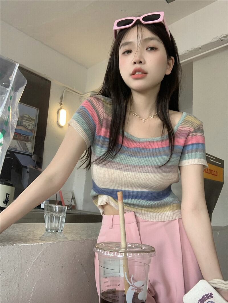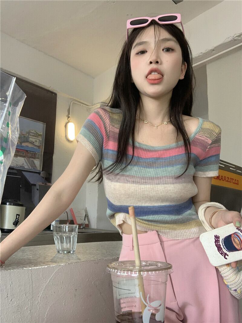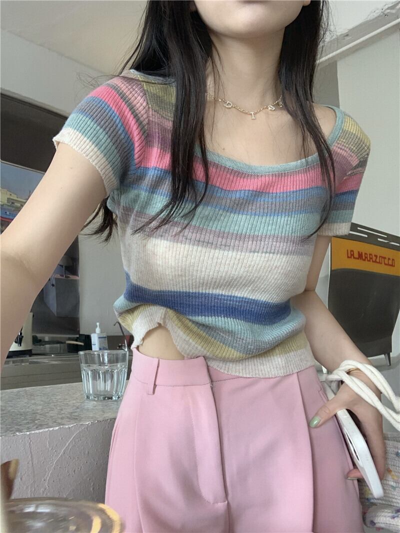 サマーアイスシルクニットストライプTシャツレディース半袖シンデザインニッチフロントショルダーショートハイウエストクロップトップ ハイウェスト 夏物 7460032070070124 | framboise21